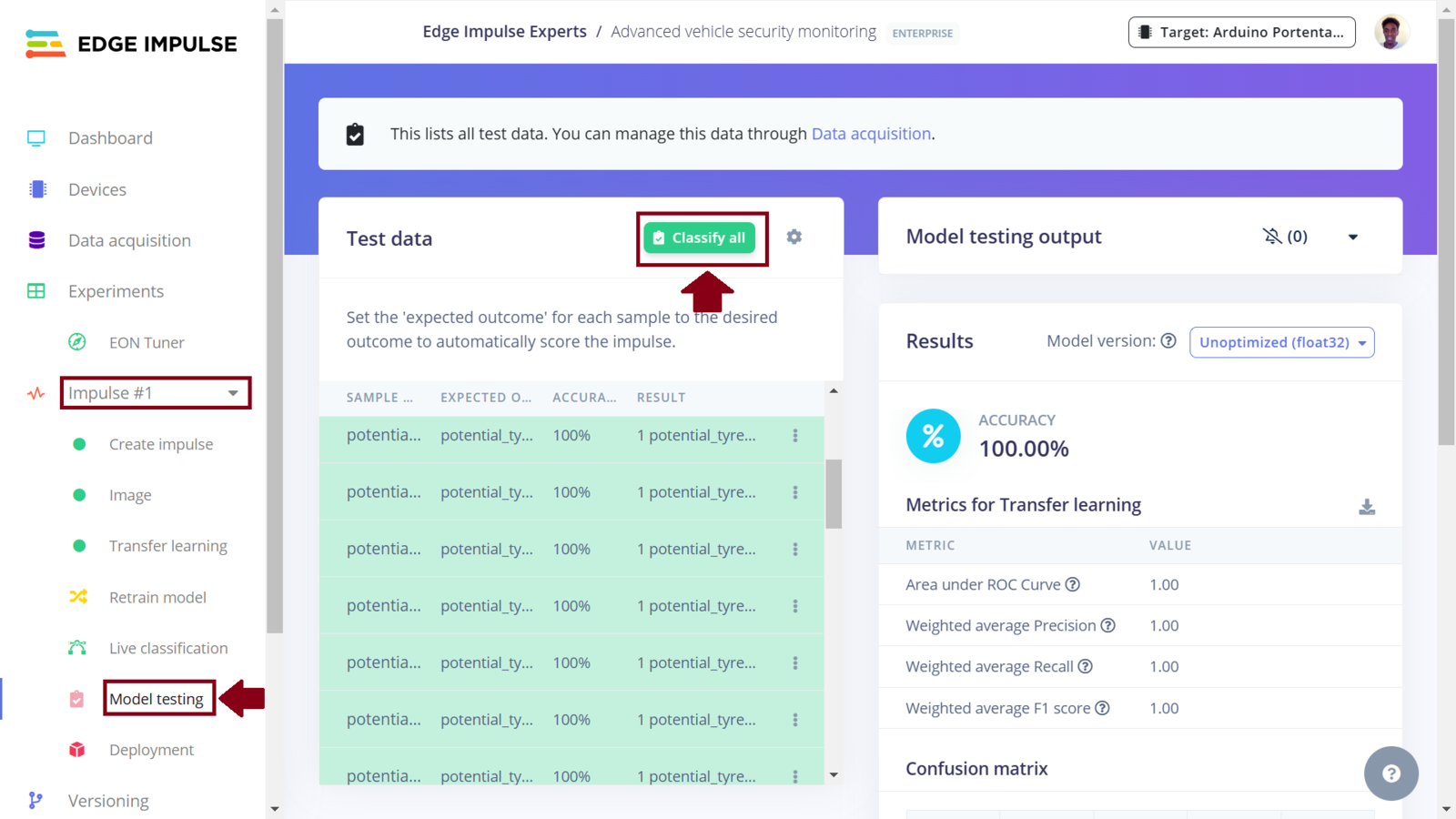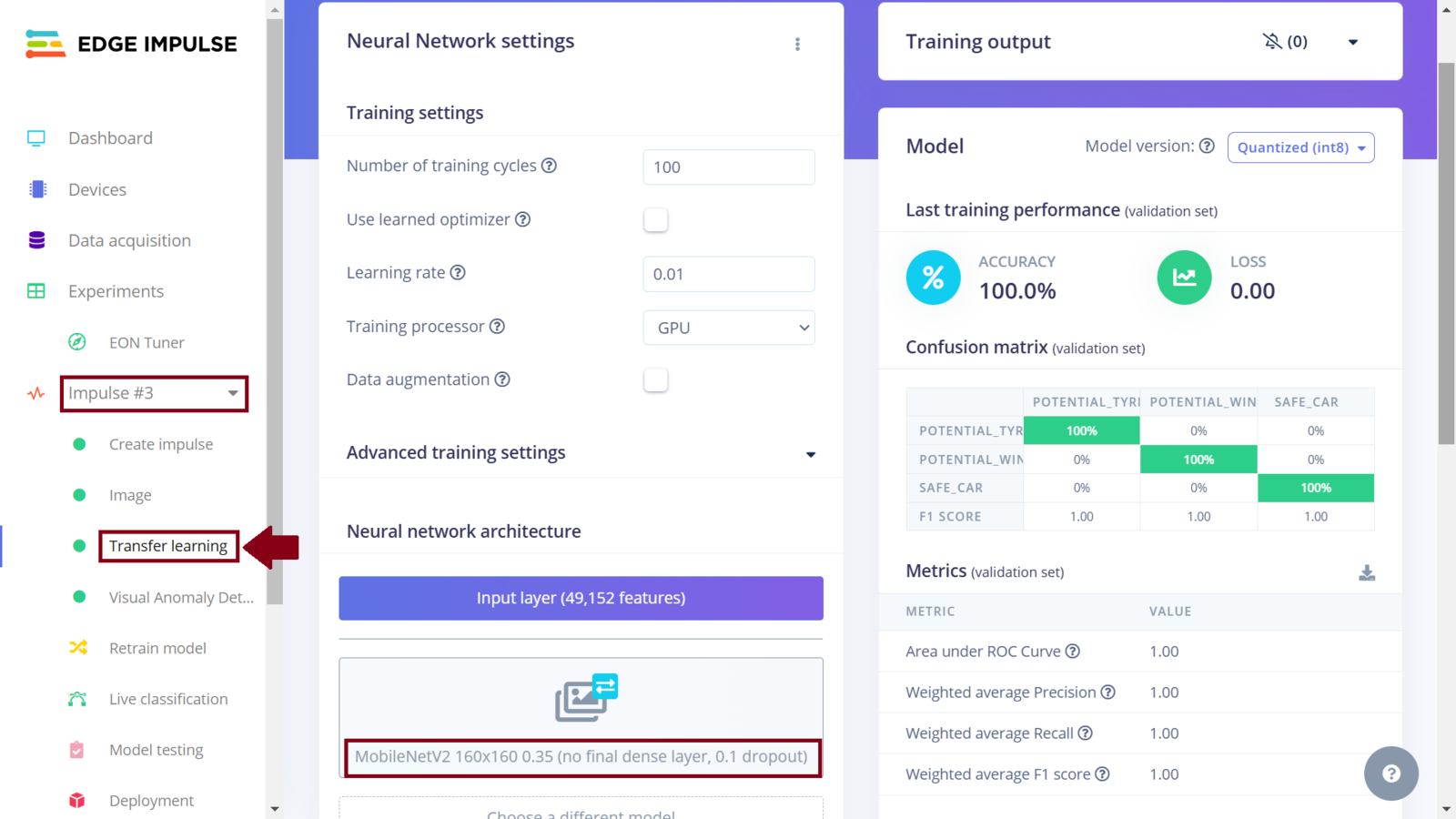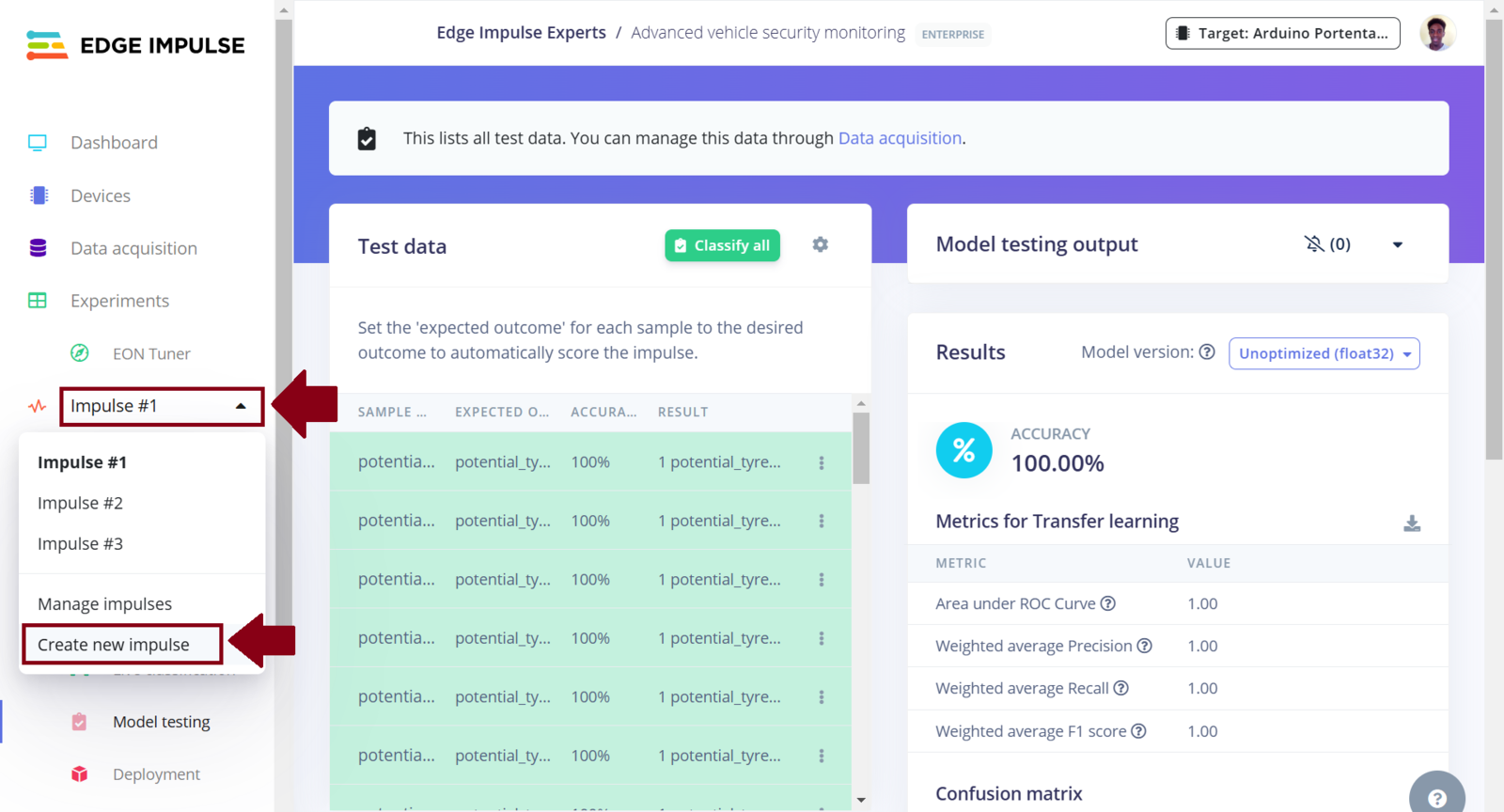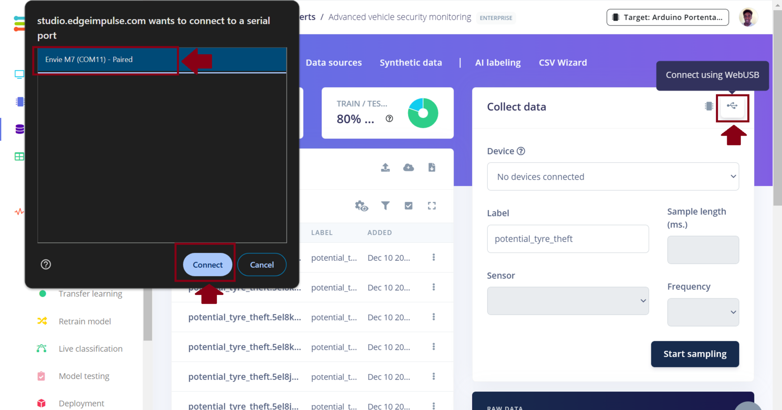 In this project, a Machine Learning model will be classifying images into three classes: safe_car, potential_window_theft and potential_tire_theft for three situations where a car is safe, someone is seen tampering with a window, or tire respectively. In Machine Learning, it is best to train a model with data that is a good representation of what the model will see when it is deployed. In this case, instead of relying on open source car images datasets, I opted to collect custom data by simulating vehicle tampering scenarios in a controlled environment. Using a personal car in a compound, I safely acted out scenarios that I was tampering with the car tires and attempting to break the windows. During these simulations, the Arduino Portenta H7 was capturing images and automatically uploading them to an Edge Impulse project, ensuring the dataset was both relevant and tailored for the task. Since the Arduino Portenta H7 is fully supported by Edge Impulse, the data collection process is easy. Following the Edge Impulse documentation we first download the Edge Impulse data collection firmware for the Portenta H7. This firmware allows us to collect sensor data from the Portenta H7 (such as an image or sound) and automatically have the data uploaded to an Edge Impulse project. Using a USB-C cable with data transfer, connect the Portenta H7 to your computer and double-press the reset button to put it in bootloader mode (this allows us to update the device’s firmware). Run the flashing script according to your Operating System and then press the reset button once to launch the new firmware. Edge Impulse has also created a short and comprehensive video tutorial on these steps. Next, create a project in the Edge Impulse Studio platform. Before starting to work on the project, I prefer informing the platform about the device that I am targeting. To do this we can click the “Target” button on the top right section of the page and select “Arduino Portenta H7 (Cortex-M7 480MHz)” from the dropdown list for “Target device”. When you set the target device in the Studio (or using the Python SDK), it automatically generates on-device performance metrics for tasks such as the digital signal processing, model’s classification time, and RAM and ROM usage. This information is invaluable as it provides insights into how efficiently the digital processing and model will perform on the targeted device, such as the Portenta H7. Most importantly, the information also assists us to determine whether the processing algorithm and model are capable of “fitting” within the constraints of the target device.