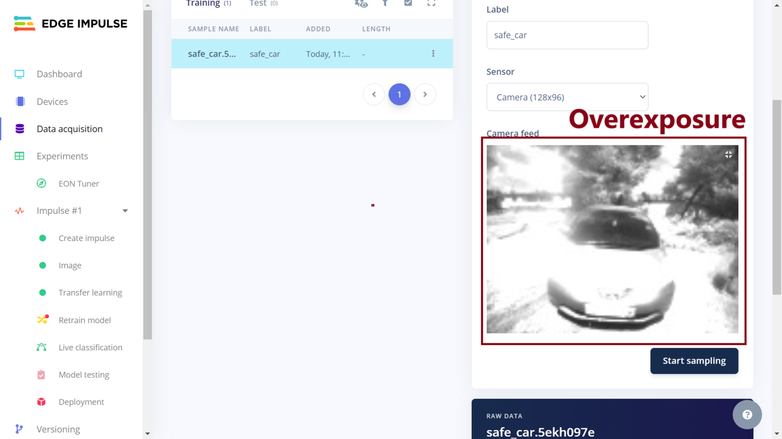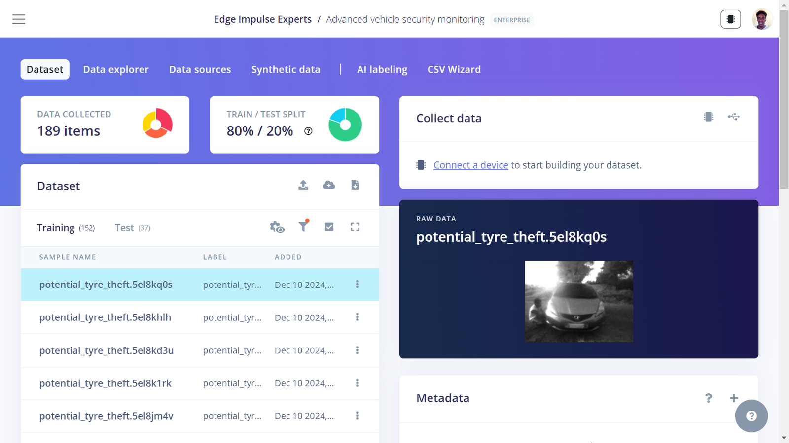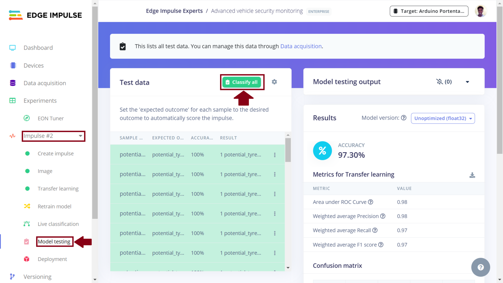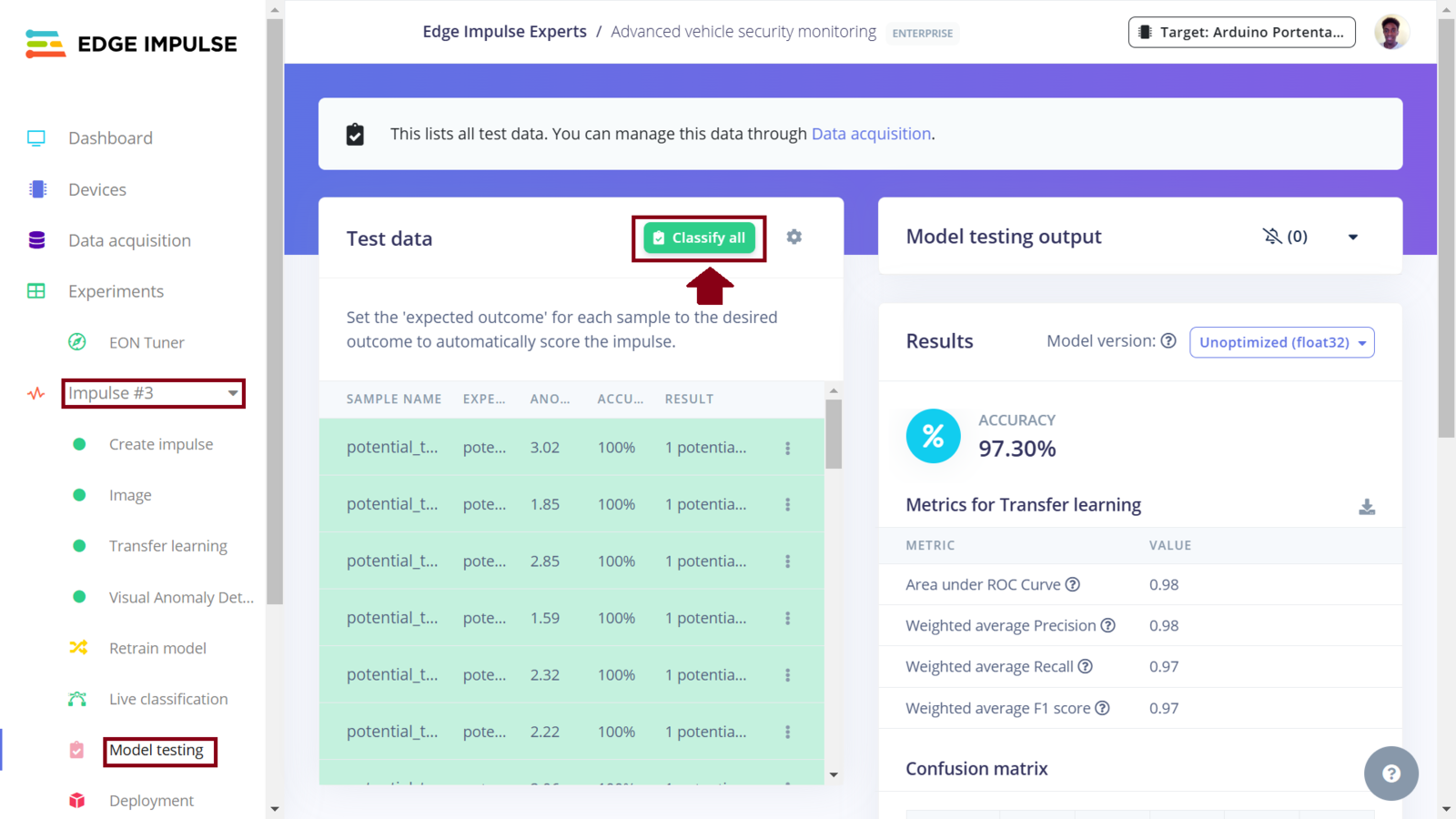 In this project, a Machine Learning model will be classifying images into three classes: safe_car, potential_window_theft and potential_tire_theft for three situations where a car is safe, someone is seen tampering with a window, or tire respectively. In Machine Learning, it is best to train a model with data that is a good representation of what the model will see when it is deployed. In this case, instead of relying on open source car images datasets, I opted to collect custom data by simulating vehicle tampering scenarios in a controlled environment. Using a personal car in a compound, I safely acted out scenarios that I was tampering with the car tires and attempting to break the windows. During these simulations, the Arduino Portenta H7 was capturing images and automatically uploading them to an Edge Impulse project, ensuring the dataset was both relevant and tailored for the task. Since the Arduino Portenta H7 is fully supported by Edge Impulse, the data collection process is easy. Following the Edge Impulse documentation we first download the Edge Impulse data collection firmware for the Portenta H7. This firmware allows us to collect sensor data from the Portenta H7 (such as an image or sound) and automatically have the data uploaded to an Edge Impulse project. Using a USB-C cable with data transfer, connect the Portenta H7 to your computer and double-press the reset button to put it in bootloader mode (this allows us to update the device’s firmware). Run the flashing script according to your Operating System and then press the reset button once to launch the new firmware. Edge Impulse has also created a short and comprehensive video tutorial on these steps. Next, create a project in the Edge Impulse Studio platform. Before starting to work on the project, I prefer informing the platform about the device that I am targeting. To do this we can click the “Target” button on the top right section of the page and select “Arduino Portenta H7 (Cortex-M7 480MHz)” from the dropdown list for “Target device”. When you set the target device in the Studio (or using the Python SDK), it automatically generates on-device performance metrics for tasks such as the digital signal processing, model’s classification time, and RAM and ROM usage. This information is invaluable as it provides insights into how efficiently the digital processing and model will perform on the targeted device, such as the Portenta H7. Most importantly, the information also assists us to determine whether the processing algorithm and model are capable of “fitting” within the constraints of the target device.