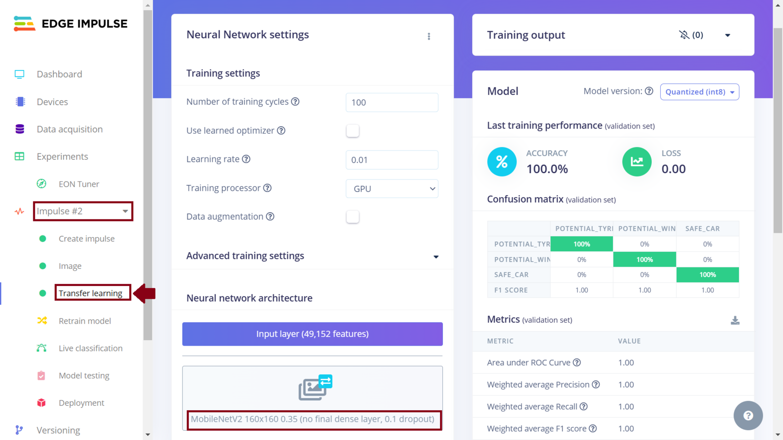 Edge Impulse offers the MobileNetV2 model, in the free version, and I wanted to experiment how it would perform compared to the MobileNetV2 backbone in the Nvidia TAO. The Impulse design is similar to the first one with the only difference being in the model choice for the learning block. To add another Impulse, we click the current Impulse (Impulse #1) followed by “Create new Impulse”.