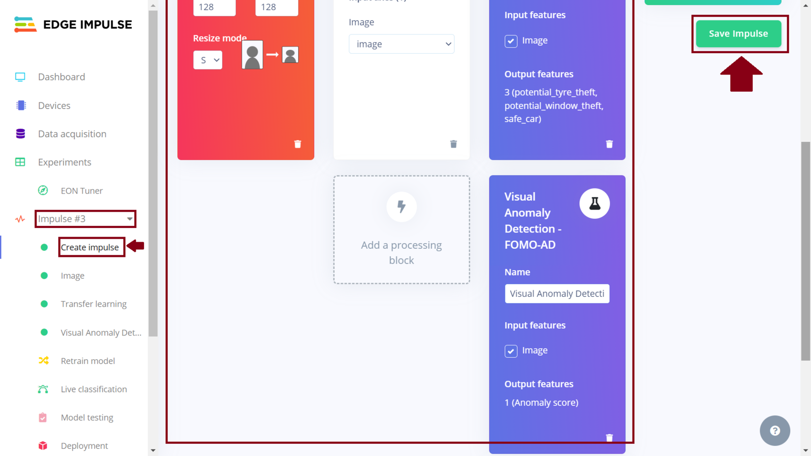 Still on the Edge Impulse project, I proceeded to create the first Impulse. For the image data configuration, I set it to 128x128 pixels and the resize mode to squash. I selected the “Image” processing block since it preprocesses and normalizes image data, and optionally reduces the color depth. For the learning block, I selected “Transfer Learning (Images)” as this fine tunes a pre-trained image classification model on your data. It gives a good performance even with relatively small image datasets. Once set, click “Save Impulse” to set these configurations.