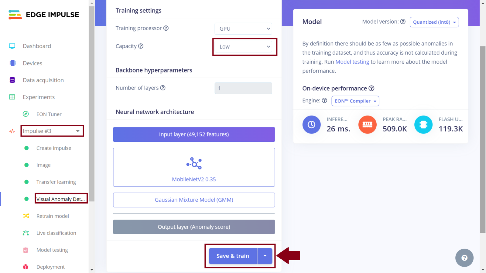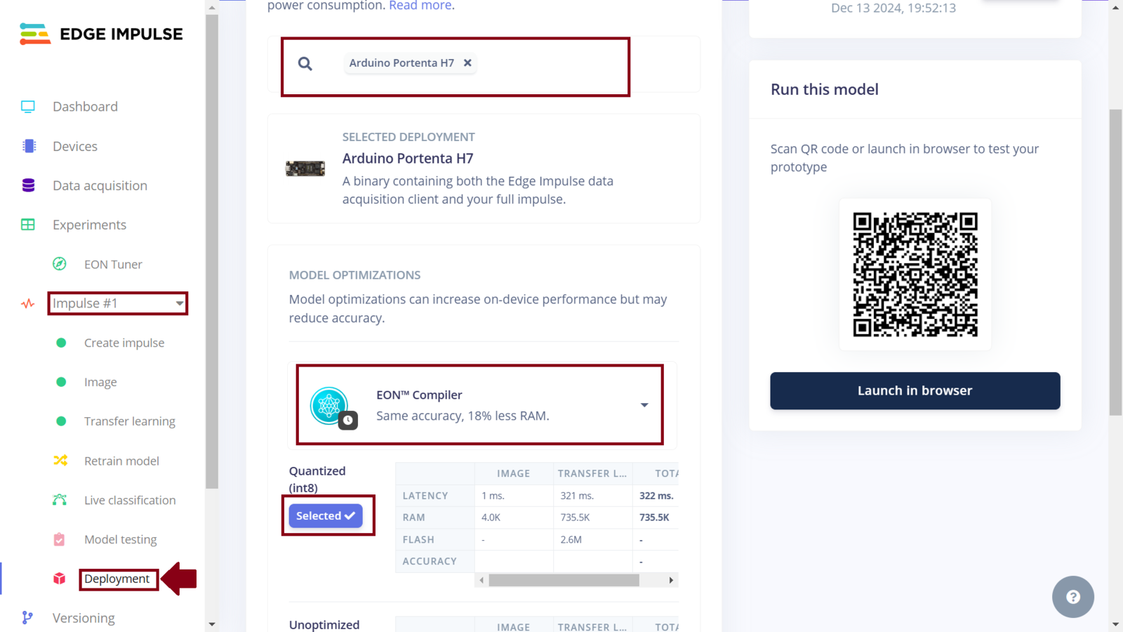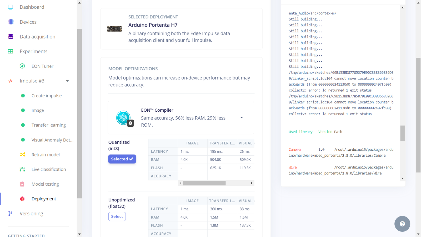 In this project, we now have three Impulses utilizing Nvidia TAO model, MobileNetv2, and both MobileNetv2 and visual anomaly detection, respectively. The Experiments feature not only allows us to setup different machine learning processes, but it also allows us to deploy any Impulse to a wide variety of hardware ranging from MCUs, CPUs and AI-accelerated boards. Among the various deployment options that are available, I chose to experiment with an Arduino library, OpenMV library, and deploying the Impulses as binary firmware. In my deployment experiments, I faced several challenges whereby the Studio and even Arduino IDE would fail to compile the library and camera example code, respectively, since the sketch ran out of the available flash that is on the board. Deploying the Impulse with Nvidia TAO model as an Arduino Library was too large to fit in the Portenta memory. Later, I realized that we can fix this issue by deploying an Impulse as an OpenMV library. However, for the third Impulse, this option cannot work since Impulses can only support a single learning block when deploying to OpenMV. To deploy an Impulse as a binary firmware, first ensure it is the current Impulse and then navigate to the “Deployment” section. In the field “Search deployment options” select Arduino Portenta H7. Since memory and CPU clock rate is limited for our deployment, we can optimize the model so that it can utilize the available resources on the Arduino Portenta H7 (or simply, so that it can fit and manage to run on the board). Model optimization often has a trade-off whereby we decide whether to trade model accuracy for improved performance, or reduce the model’s memory (RAM) use. Edge Impulse has made model optimization very easy with just a click. Currently we can get two optimizations: EON compiler (gives the same accuracy but uses 18% less RAM) and TensorFlow Lite. The Edge Optimized Neural (EON) compiler is a powerful tool, included in Edge Impulse, that compiles machine learning models into highly efficient and hardware-optimized C++ source code. It supports a wide variety of neural networks trained in TensorFlow or PyTorch - and a large selection of classical ML models trained in scikit-learn, LightGBM or XGBoost. The EON Compiler also runs far more models than other inferencing engines, while saving up to 65% of RAM usage. TensorFlow Lite (TFLite) is an open-source machine learning framework that optimizes models for performance and efficiency, making them able to run on resource constrained devices. To enable model optimizations, I selected the EON Compiler and Quantized (int8).