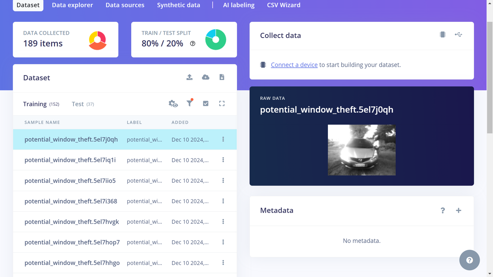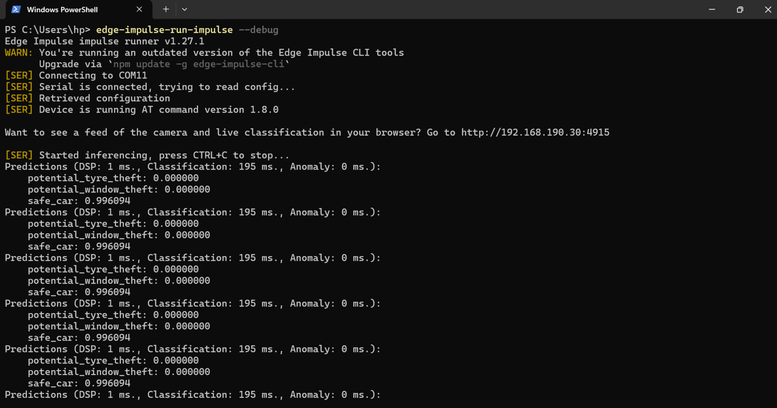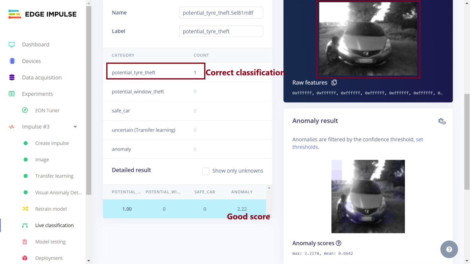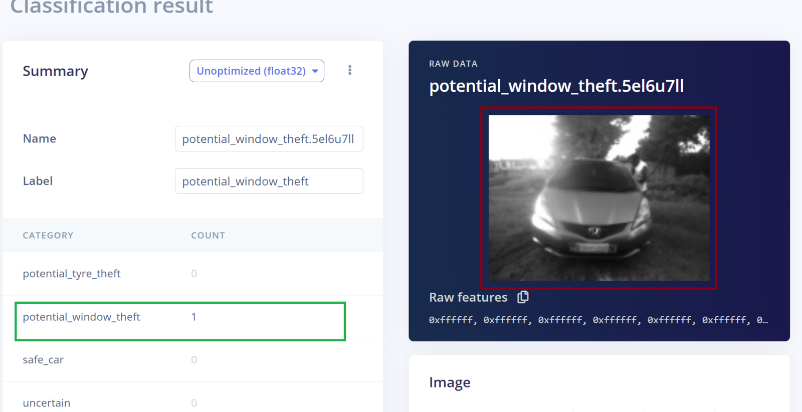 potential_tire_theft and potential_window_theft classes was low at around 0.28 to 0.3, but a good number of times the model would accurately classify the action with a confidence of 0.8. This can be related to several factors such as change in sunshine from the day when data was collected for training. We can also improve the model’s performance by adding more training data and increasing the number of training cycles.