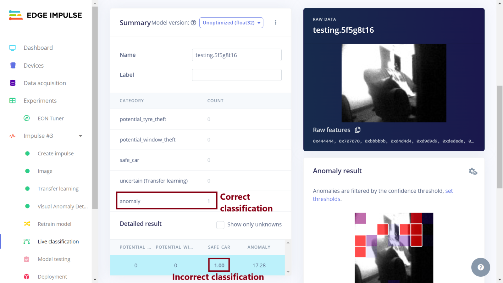 In my third experiment, I wanted to explore visual anomaly detection. Edge Impulse recently added a visual anomaly detection model, FOMO-AD that can identify unusual patterns or anomalies in image data that do not conform to the expected behavior. Neural networks are powerful, but have a major drawback: handling unseen data, like an photo with no vehicle present, is a challenge due to their reliance on existing training data. Even entirely novel inputs often get misclassified into existing categories. During my data collection, I did not take into account situations such as when a vehicle is not present in a photo, or when there is more than 1 person being seen tampering with a car tires/windows. FOMO-AD is offered in the Enterprise plan. You can request an expert-led trial to explore the functionality. The Impulse design is similar to the first two, with the difference being that we add two learning blocks: Transfer Learning (Images) and Visual Anomaly Detection - FOMO-AD. To be precise, this impulse is a duplicate of the second Impulse with an additional learning block. I created a new Impulse and similar to how we selected “Transfer Learning (Images)” from the learning block list, I added another block, “Visual Anomaly Detection - FOMO-AD”. Next, I generated features and trained a “MobileNetV2 160x160 0.35” model with the same parameters as the second Impulse. Once the training is finished, I clicked the “Visual Anomaly Detection” and trained the model with a low capacity setting.