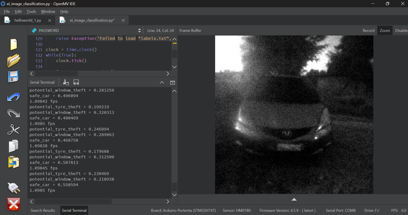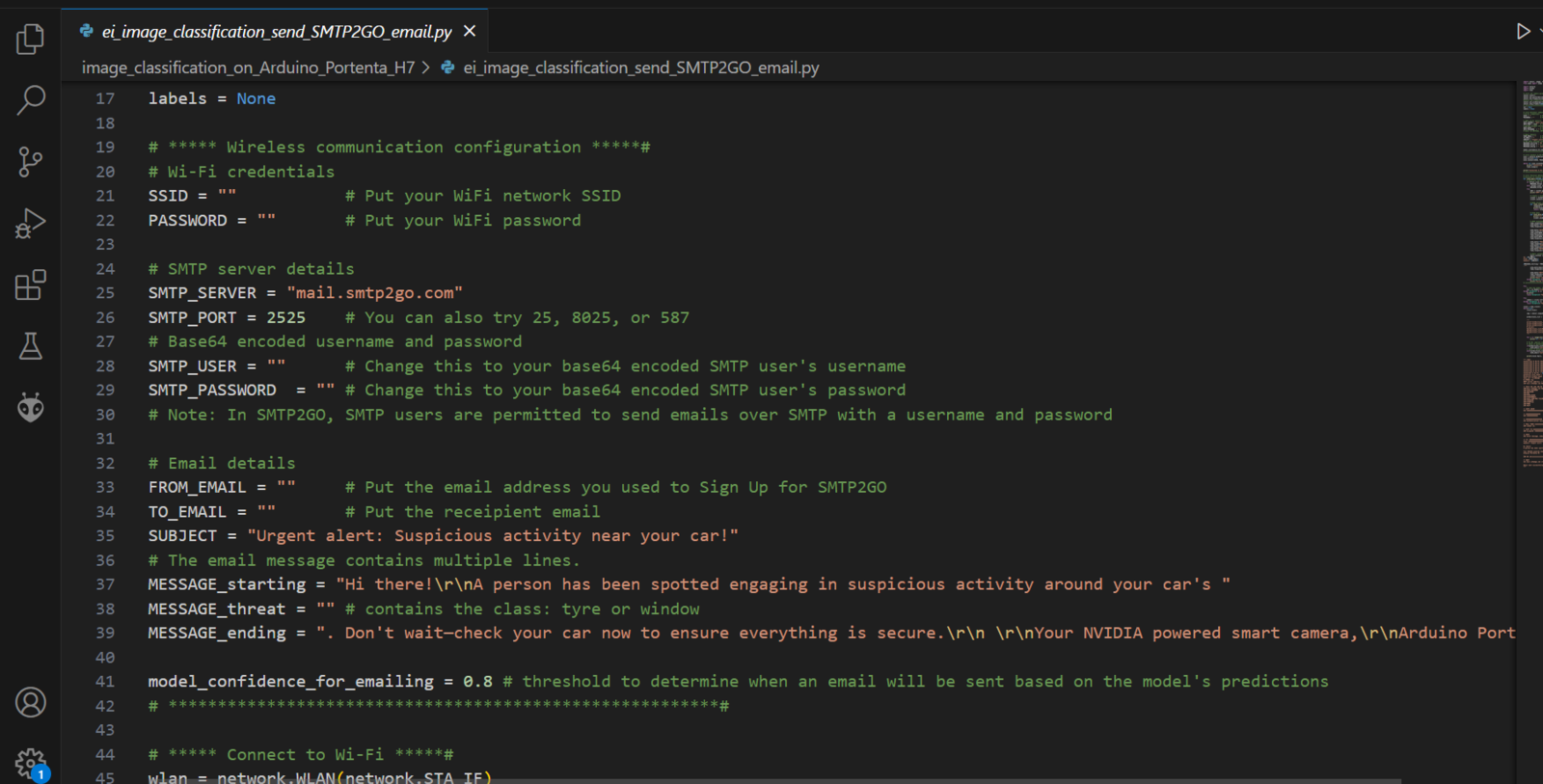 We are close to finishing the smart vehicle surveillance camera — time to put the camera together. First, we need to download first Impulse as an OpenMV library and also download the OpenMV IDE. Once we have installed the OpenMV IDE, we need to ensure that we have the latest version of the bootloader. To do this, we can use the Arduino IDE to upload the sketch for updating the bootloader. Afterwards, we connect the Portenta H7 board to the OpenMV IDE and install the latest firmware. These procedures have been well documented by Marcelo Rovai in one of his Hackster.io projects - in the section “Installing the OpenMV IDE” of the tutorial. Having the Portenta H7 connected to the computer and flashed with the latest OpenMV firmware, we will see a new drive on our computer. We need to extract the downloaded .zip file from Edge Impulse and drag and drop the .zip file contents to the Portenta H7 drive. The zip file has the Nvidia TAO model, a labels file, and an python script that runs inference while showing results. To include processing the inference results and sending an email, I created a simple python script that analyzes the inference results and sends an email via SMTP2GO service when a person is seen around the vehicle tampering with tires or windows. The Portenta H7’s WiFi capabilities is used to connect to a WiFi network and an email will be sent when the model is 0.8 confident that either a potential tire theft or window break-in attempt is ongoing. Note that before copying this Python file to the Portenta H7, we need to connect a 2.4GHz WiFi antenna.