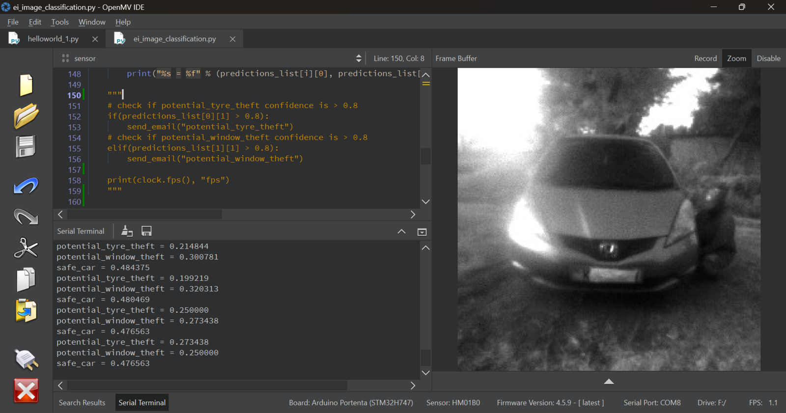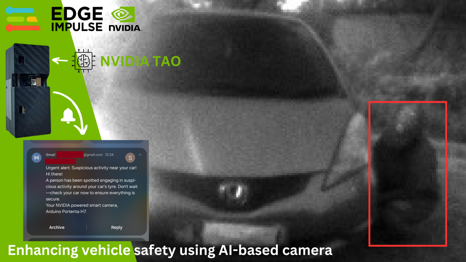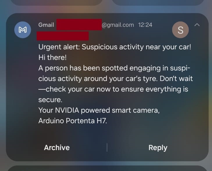 Finally, our smart vehicle surveillance camera is complete. We have successfully trained, tested, optimized, and deployed a Machine Learning model to the Arduino Portenta H7 board. Once the device is powered, the Portenta H7 board will first connect to the configured WiFi and after this is successful, the code will load the Nvidia TAO model and start running inference. This process runs at around 1 frame per second and the software is constantly analyzing the model predictions to see if situations where someone is near the vehicle tires or window is detected. Once these threatening situations are detected, and with a confidence of 0.8 and above, the Portenta H7 then automatically sends an email to the set email address using SMTP2GO. I chose email notifications as it was the easiest alternative for this demonstration since the service is free. For a commercial product it will be better to alert the vehicle owner using SMS, voice calls, and even alerting the authorities.