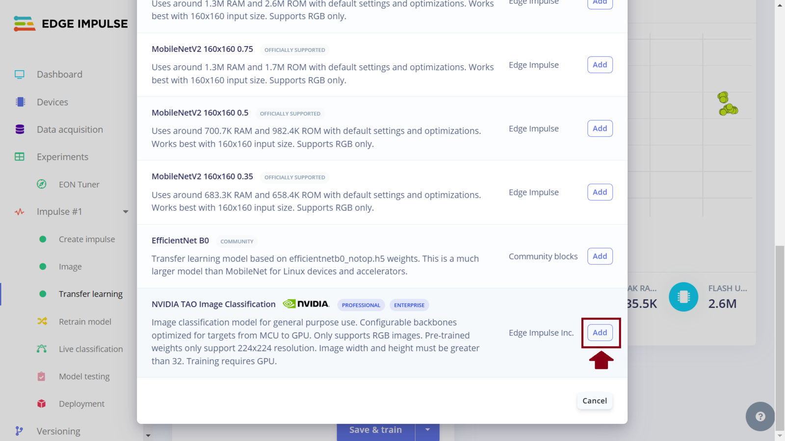 After collecting data for our project, we can now train a Machine Learning model for the required image classification task. To do this, on the Edge Impulse project, we need to create an Impulse. An Impulse is a configuration that defines the input data type, data pre-processing algorithm, and the Machine Learning model training. One of the great features of the Edge Impulse platform is the simplified development and deployment of Machine Learning models. Recently, Edge Impulse released the Experiments feature which allows projects to contain multiple Impulses, where each Impulse can contains either the same combination of blocks or a different combination. This allows us to view the performance for various types of learning and processing blocks, while using the same input training and testing datasets.1. Experimenting with Nvidia TAO Toolkit