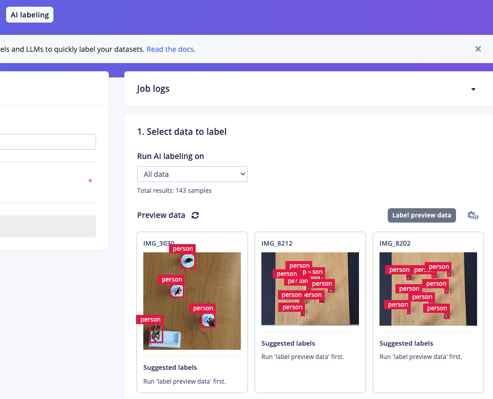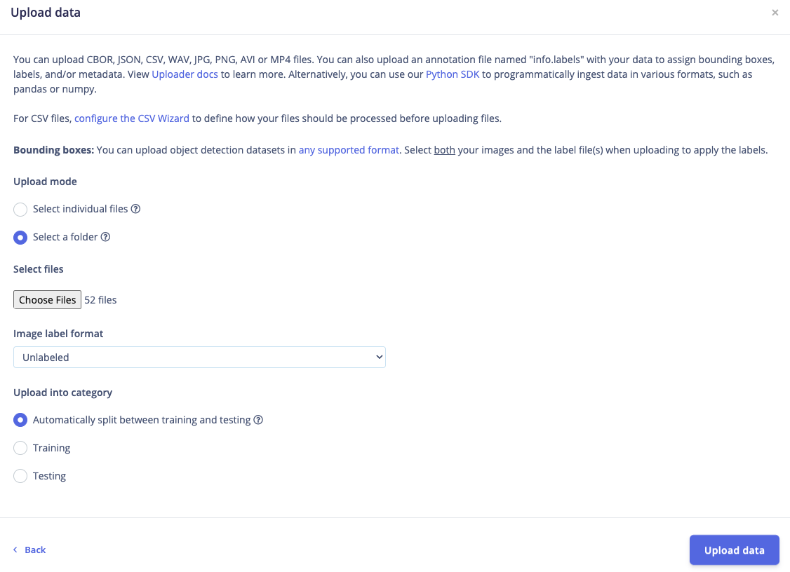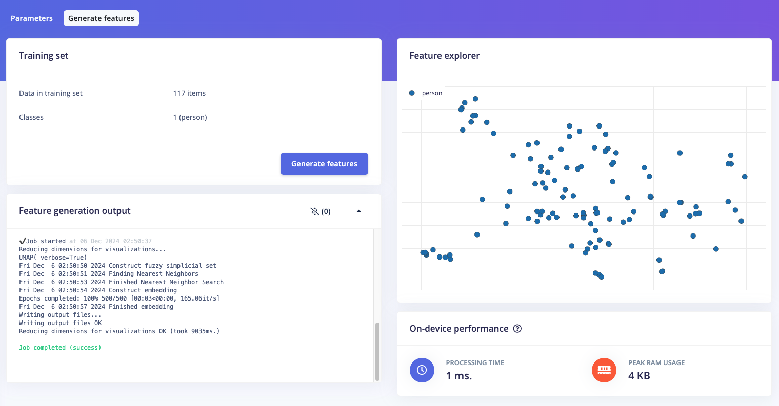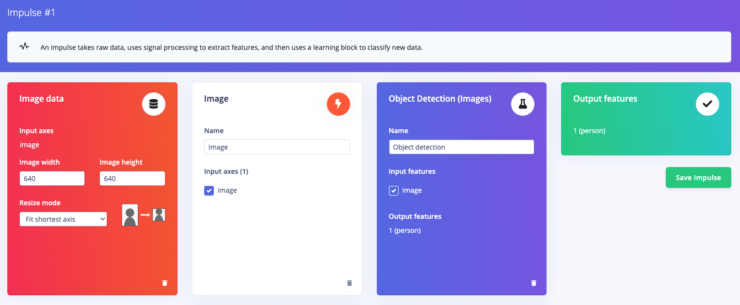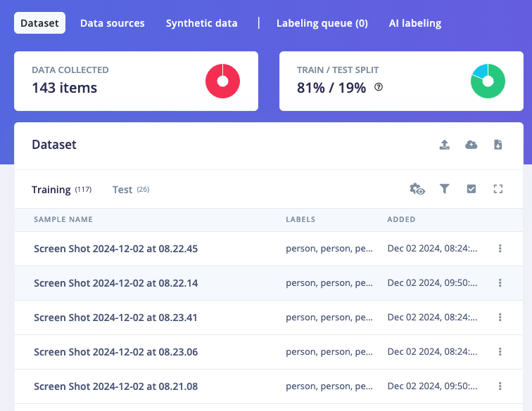 The next step is labeling. Click on Data Acquisition, click on “Labelling queue” tab then labeling your “people” by dragging a box around an object and label it, then repeat the steps until all images are labelled.Update: Alternatively you can try Edge Impulse’s new feature, AI labeling.After labeling, it’s recommended to split the data into training and testing sets, around an 80/20 ratio. If you haven’t done this yet, click on Train / Test Split and proceed.