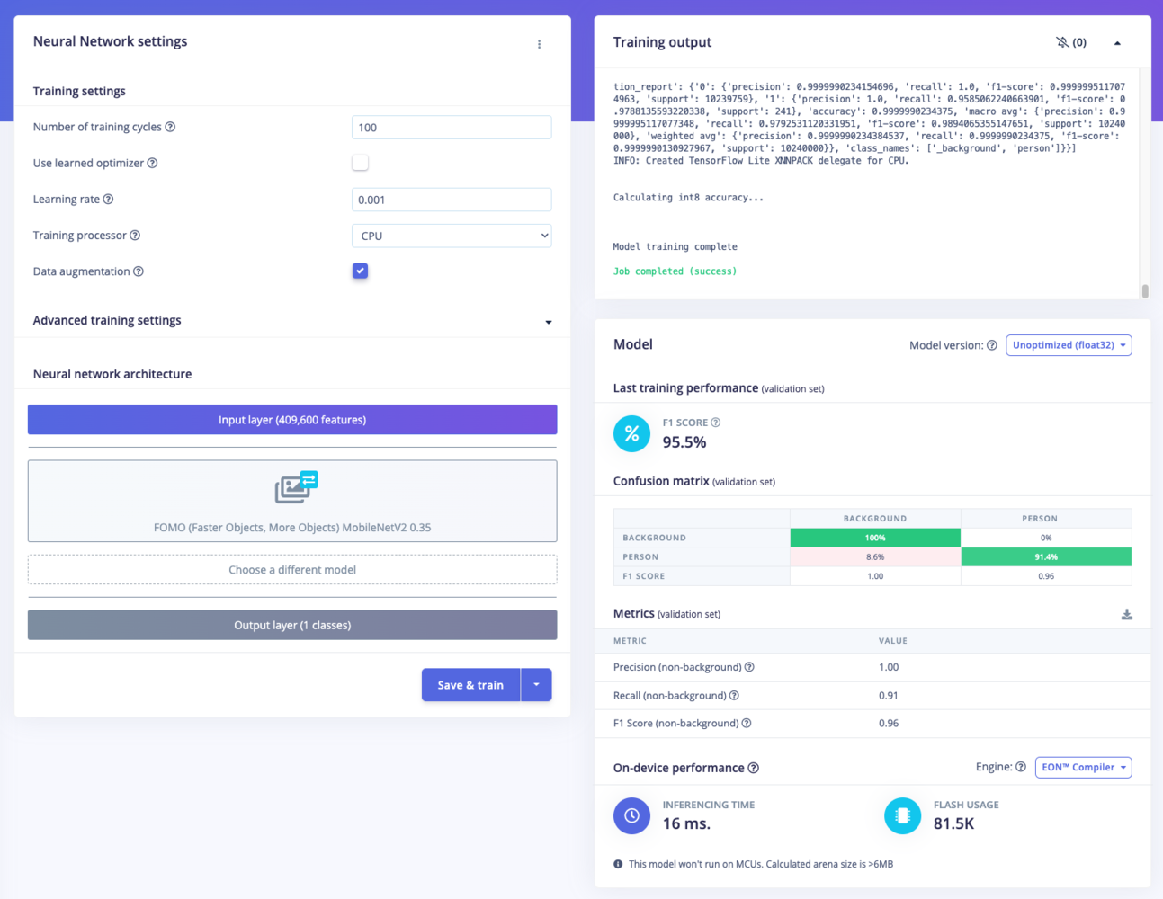 Once your labelled dataset is ready, go to Impulse Design > Create Impulse, and set the image width and height to 640x640. Choose Fit shortest axis, then select Image and Object Detection as the learning and processing blocks, and click Save Impulse. Next, navigate to the Image Parameters section, select Grayscale as the color depth, and press Save parameters. Then click on Generate and navigate to Object Detection section, and leave training setting for Neural Network at their default settings (100 cycles and learning rate 0.001), then we choose FOMO MobileNet V2 0.35. You can then begin the training, and see the progress and result on the right side of the screen. If everything is OK (we get F1 score > 90%), then we can test the model, go to Model Testing section and click Classify all. Our result is above 90%, so we can move on to the next step — Deployment.