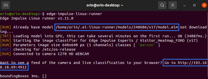 During the process, the console will display the path where the model.eim has been downloaded. For example, in the image below, it shows the file located at /home/orin/.ei-linux-runner/models/240606/v17.