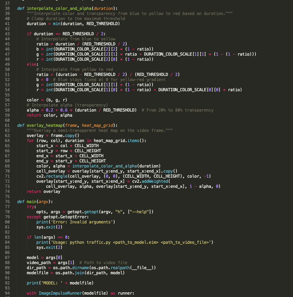 With our FOMO model ready, we can now create a Visitor Heatmap program using Python. This program will utilize the bounding box locations of objects and their duration of presence. The heatmap will consist of semi-transparent color blocks overlaying the camera/video display, implemented using the OpenCV library. The color transitions will range from blue → green → yellow → orange → red, representing durations from 1 second to over 20 seconds. While real-world video input typically spans hours, for this simulation we will use accelerated stop-motion video. The video/camera resolution for this simulation will be set to 640x640, divided into 20x20 grids as the color blocks for the heatmap. If we run the program using a video file as input (e.g., video.mp4), we use the path to the video file when executing the program:python3 heatmap.py <path to modelfile>/model.eim <path to videofile>/video.mp4