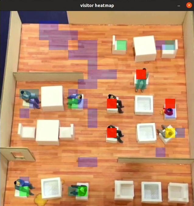 In data mapping, humans find it easier to understand information through visual representations, especially with clear color groupings, such as in a “Heatmap”. Heatmaps are used because their presentation is simple to comprehend, and can represent density and clustering. In contrast, the output from object detection cameras, which usually includes data like the number of bounding boxes, locations, and timestamps, is numerical and difficult to interpret, especially for understanding visitor behavior, flow, or favorite spots. In this project, we will create a simulation of a scenario in a cafe, restaurant, or lobby. By integrating cameras, which are commonly already in use in such places, with an additional object detection system and overlaying it with a dynamic heatmap visualization, we can reveal insights about visitor flow, duration, or favorite spots. The goal is to understand visitor behavior patterns so that the interior layout or design can be adjusted to maximize or expand areas that are popular with visitors.How it works: