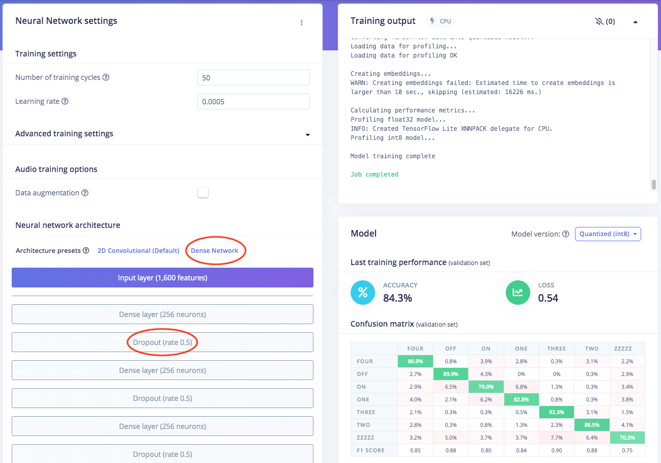 Choose Create Impulse, set Window size to 968ms, then add an Audio (Syntiant) Processing block, and choose Classifier for the Learning block, then Save Impulse. In the Syntiant parameters, choose log-bin (NDP120/200) then click Save. Set the training to around 50 cycles with 0.0005 Learning rate, and choose Dense Network with Dropout rate around 0.5, then click Start training. It will take a short while, but you can see the progress of the training on the right. If the results show a figure of around 80% accuracy upon completion, then we can most likely proceed to the next stage. Now we can test the model in Live classification, or choose Model testing to test with the data that was set aside earlier (the 80/20 split), and click Classify all. If the result is quite good — again around 80% accuracy, then we can move to the next step — Deployment.