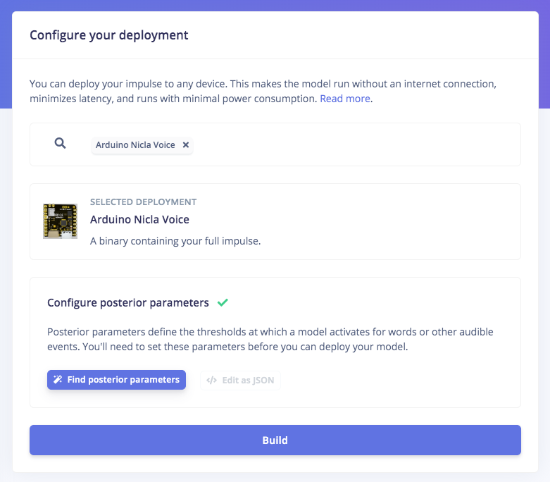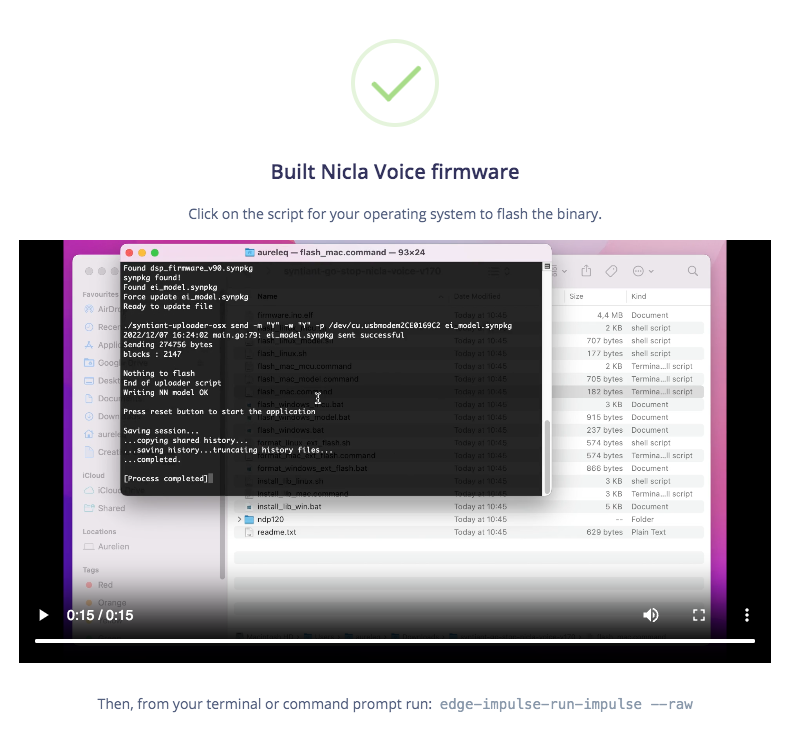 ). To run your Impulse locally on the Arduino Nicla Voice, you should select the Nicla Voice in the Deployment tab, then click Build. The binary firmware will start building and automatically download to your computer once it is complete, and a video with instructions on how to flash the firmware will pop-up. Flash this firmware to the Nicla Voice as instructed. Once complete, Now you can run this model in a Terminal for live classification.