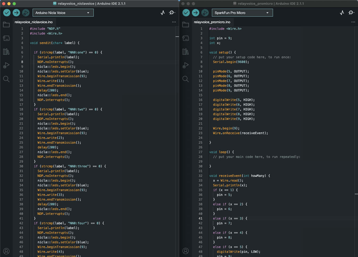 Upload this code https://github.com/Jallson/Voice_Controlled_PowerPlug/blob/main/relayvoice_niclavoice.ino to the Arduino Nicla Voice using the Arduino IDE. This code will override the existing application code in the Nicla Voice’s MCU, but not the machine learning model on the NDP120. The code basically sends a byte via I2C every time a keyword is detected, the value of the byte will depend on the keyword detected.Pro Micro