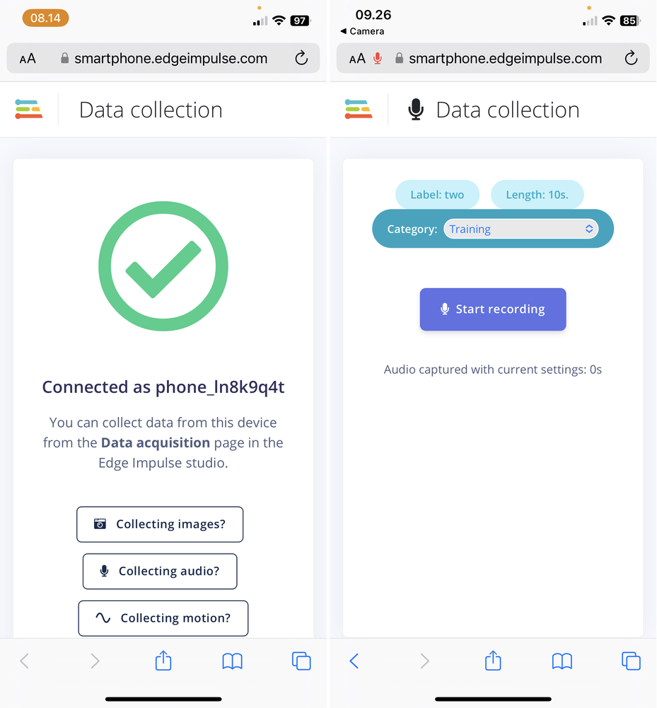 Before we start, we need to install the Arduino CLI and Edge Impulse tooling on our computer. You can follow this guide to get everything installed. Open https://studio.edgeimpulse.com in a browser, and sign in, or create a new account if you do not have one. Click on New project, then in Data acquisition, click on the Upload Data icon for uploading .wav files (e.g. from Kaggle, Google Speech Commands Dataset, etc.). Other methods to collect data are from devices such as a connected smartphone with QR code link, or a connected Nicla Voice with Edge Impulse audio firmware flashed to it. For ease of labelling, when collecting or uploading data, fill in the name according to the desired label, for exampleone