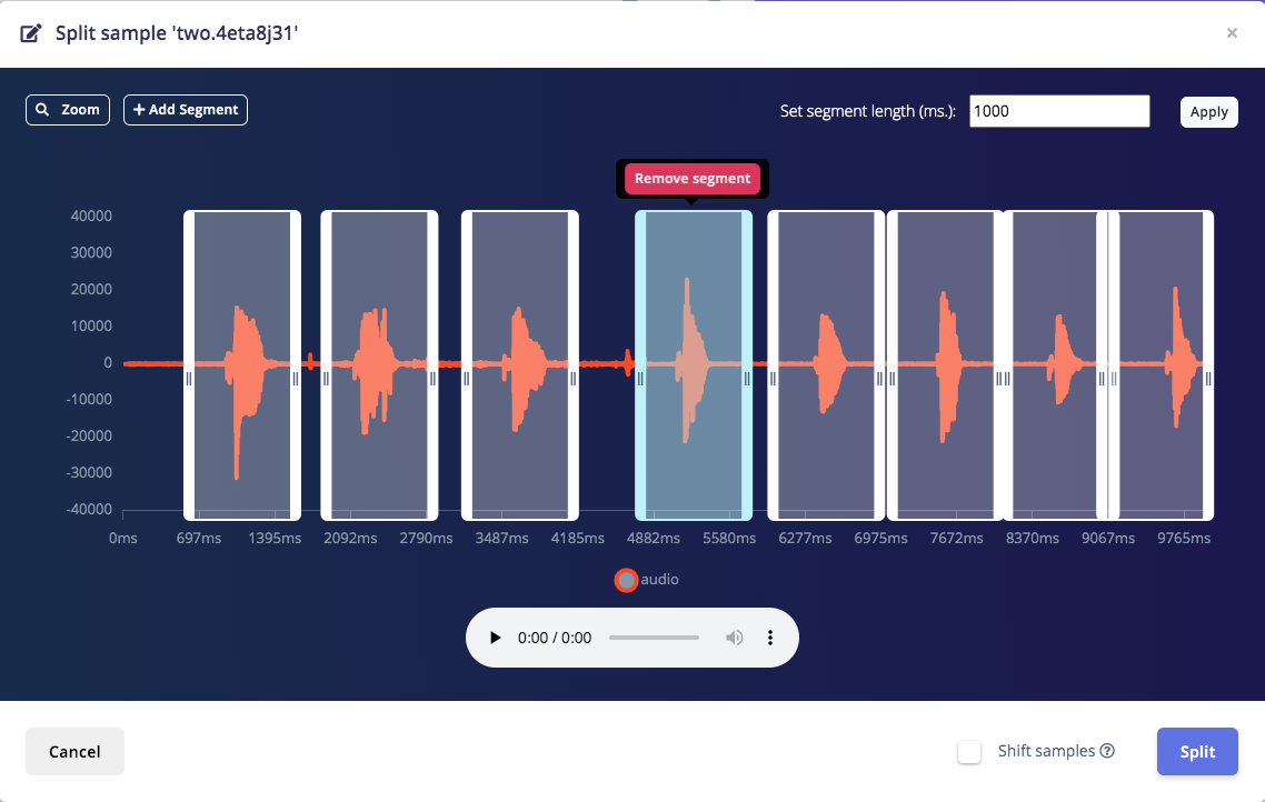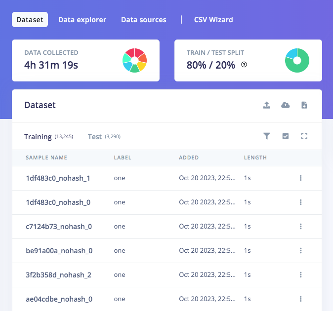 Click on a data sample that was collected, then click on the 3 dots to open the menu, and finally choose Split sample. Set the segment length to 1000 ms (1 second), or add segments manually, then click Split. Repeat this process until all samples are labeled in 1 second intervals. Make sure the comparison between one, two, three, four, on, off and unknown data is quite balanced, and the ratio between Training and Test data is around 80/20.