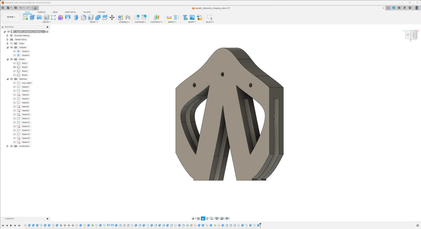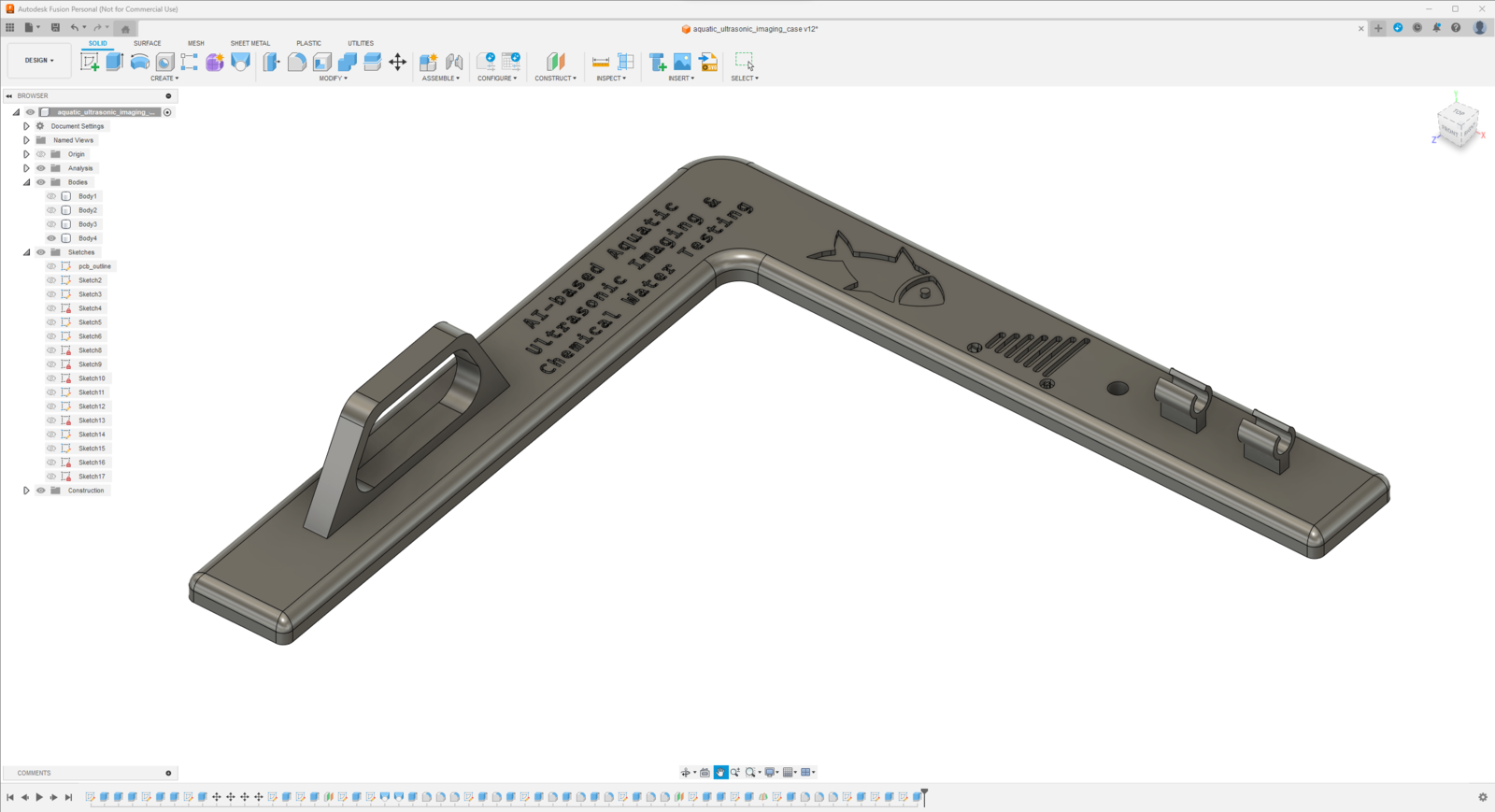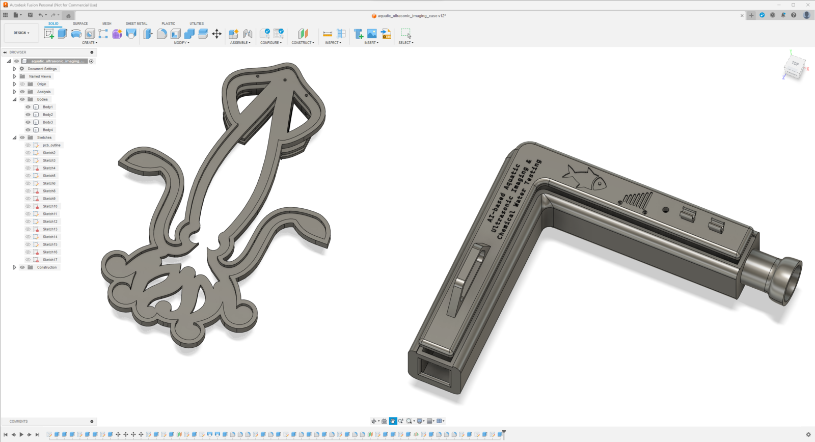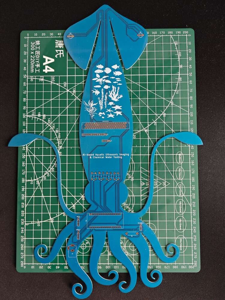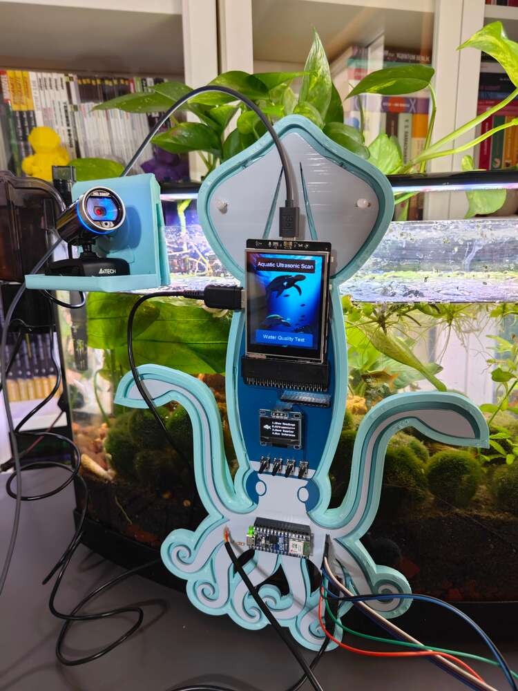 Since I focused on building a feature-rich and accessible AI-powered device that identifies noxious underwater air bubbles via aquatic ultrasonic scans and evaluates water pollution based on chemical water quality tests via object detection so as to inform the user via Telegram push notifications, I decided to design a robust and modular case allowing the user to hang the Squid PCB on the aquarium, place the high-quality USB webcam when standing idle, and position the ultrasonic sensor effortlessly while scanning underwater substrate. To avoid overexposure to water and prevent open wire connections from short circuits, I added a removable top cover mountable to the main case via snap-fit joints. The semicircular-shaped mounting brackets on the top cover let the user attach the DS18B20 waterproof temperature sensor effortlessly. Then, I designed a unique PCB holder encasing the Squid PCB outline and a hang-on aquarium connector mountable to the PCB holder via M3 screws and nuts. To place the high-quality USB webcam when standing idle, I also designed a hang-on camera holder attachable to the side of the aquarium. Furthermore, I decided to emboss aquatic life with sound-based graphic icons on the removable top cover and the camera symbol on the camera holder to highlight the qualifications of this AI-powered underwater air bubble detection device. Since I needed to position the URM15 ultrasonic sensor accurately while scanning the underwater substrate and generating data buffers, I added a special cylindrical slot to the end point of the L-shaped main case in order to fasten the ultrasonic sensor seamlessly. I designed the L-shaped main case, the removable top cover, the Squid PCB holder, the hang-on aquarium connector of the PCB holder, and the hang-on camera holder in Autodesk Fusion 360. You can download their STL files below.