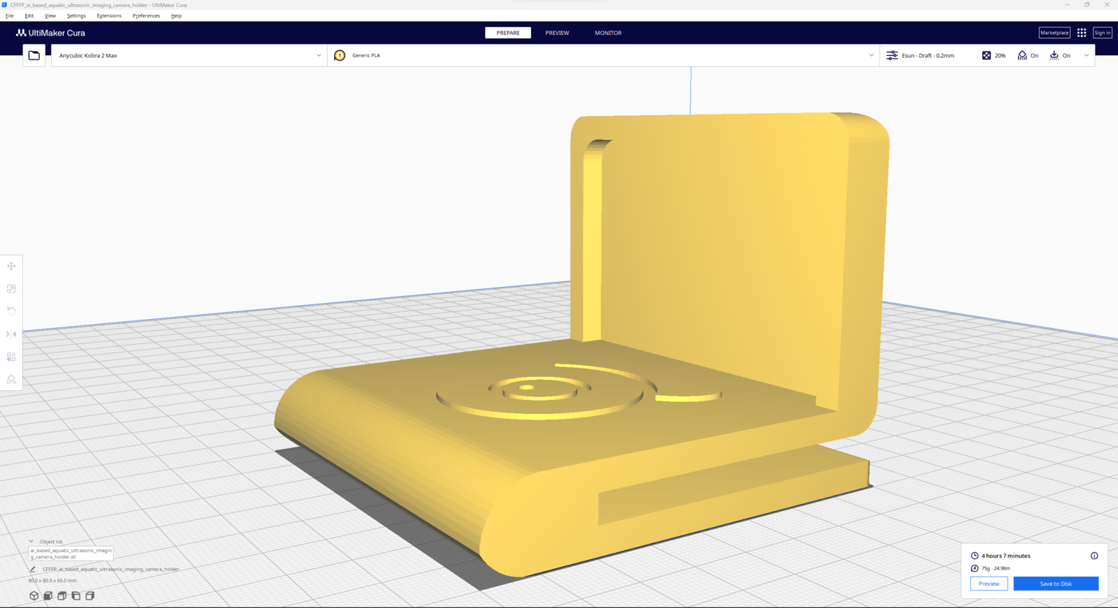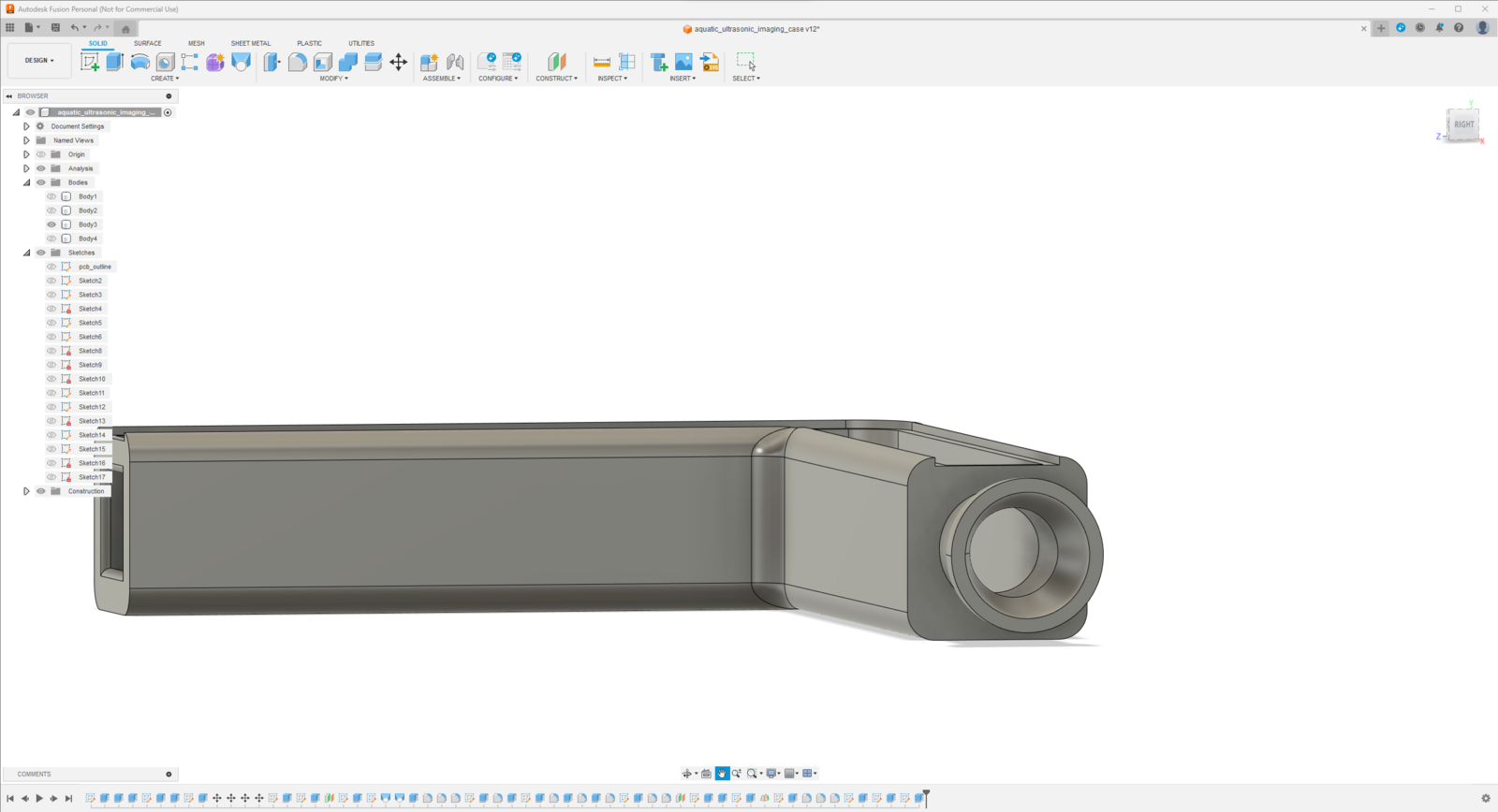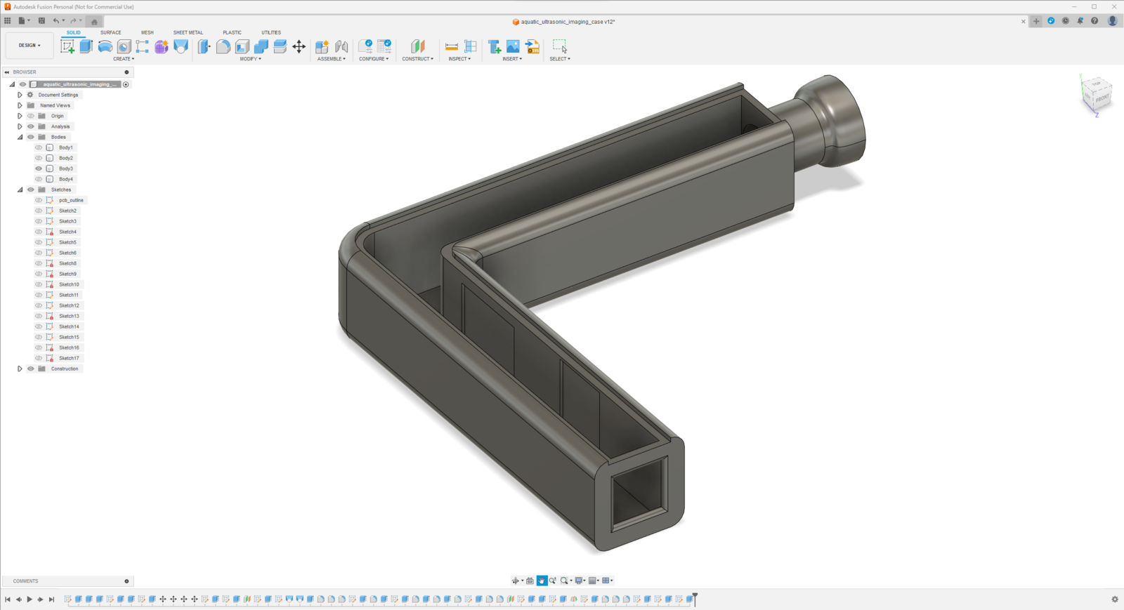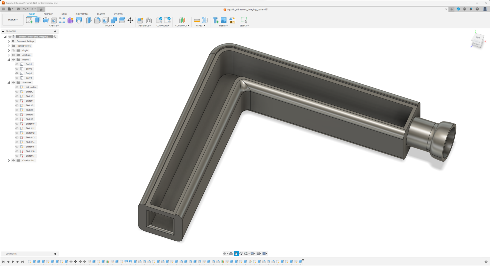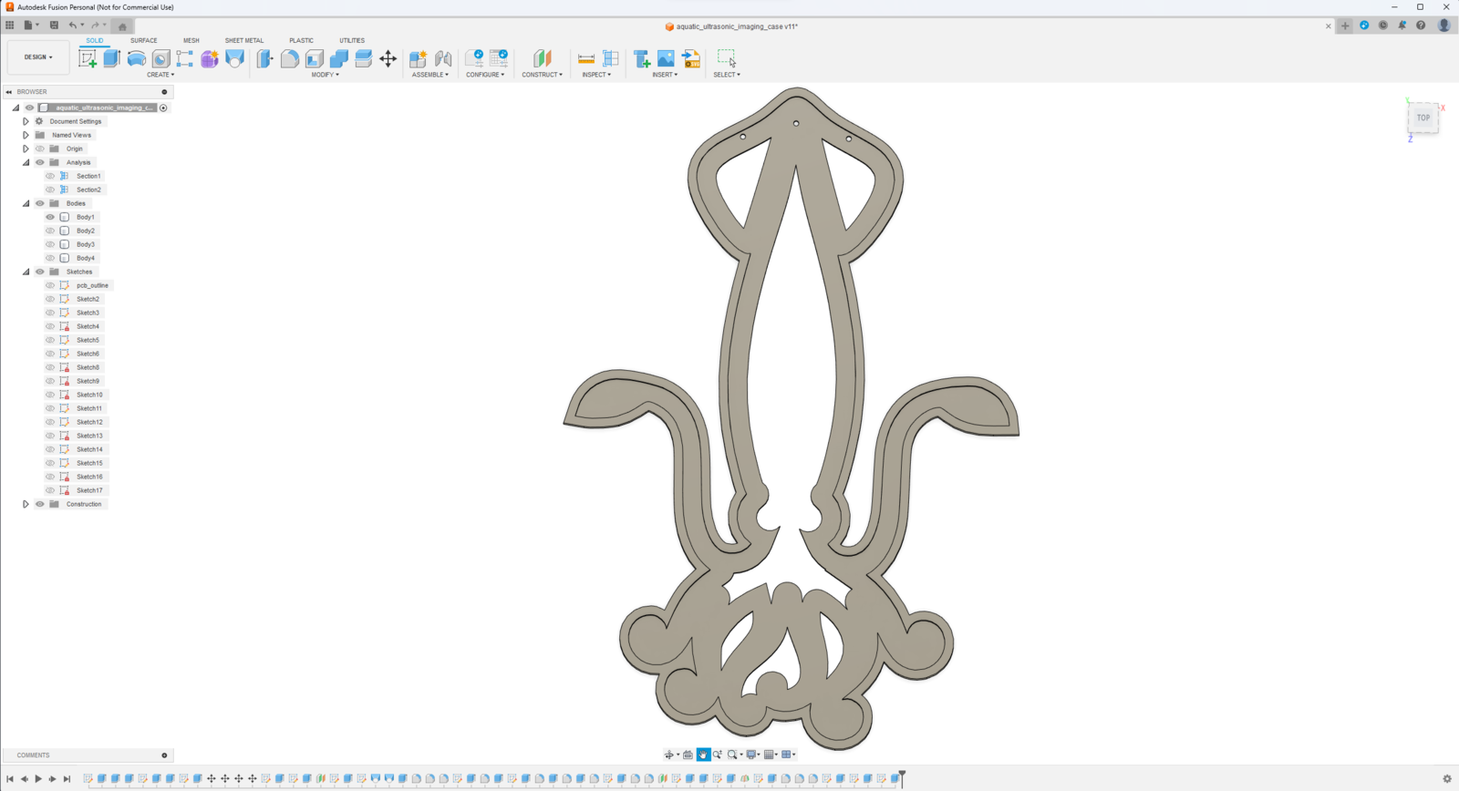 Since I focused on building a feature-rich and accessible AI-powered device that identifies noxious underwater air bubbles via aquatic ultrasonic scans and evaluates water pollution based on chemical water quality tests via object detection so as to inform the user via Telegram push notifications, I decided to design a robust and modular case allowing the user to hang the Squid PCB on the aquarium, place the high-quality USB webcam when standing idle, and position the ultrasonic sensor effortlessly while scanning underwater substrate. To avoid overexposure to water and prevent open wire connections from short circuits, I added a removable top cover mountable to the main case via snap-fit joints. The semicircular-shaped mounting brackets on the top cover let the user attach the DS18B20 waterproof temperature sensor effortlessly. Then, I designed a unique PCB holder encasing the Squid PCB outline and a hang-on aquarium connector mountable to the PCB holder via M3 screws and nuts. To place the high-quality USB webcam when standing idle, I also designed a hang-on camera holder attachable to the side of the aquarium. Furthermore, I decided to emboss aquatic life with sound-based graphic icons on the removable top cover and the camera symbol on the camera holder to highlight the qualifications of this AI-powered underwater air bubble detection device. Since I needed to position the URM15 ultrasonic sensor accurately while scanning the underwater substrate and generating data buffers, I added a special cylindrical slot to the end point of the L-shaped main case in order to fasten the ultrasonic sensor seamlessly. I designed the L-shaped main case, the removable top cover, the Squid PCB holder, the hang-on aquarium connector of the PCB holder, and the hang-on camera holder in Autodesk Fusion 360. You can download their STL files below.