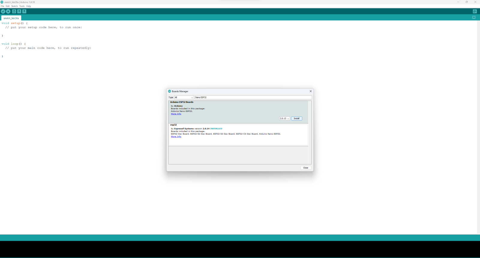 Since Nano ESP32 has the well-known Nano form and provides Wi-Fi connectivity via the u-blox® NORA-W106 (ESP32-S3) module, I decided to employ Nano ESP32 to transfer data packets directly to the web application, including the produced aquatic ultrasonic scan buffer, the selected air bubble class for samples, and the detected air bubble label after running the neural network model. Nevertheless, before proceeding with the following steps, I needed to set Nano ESP32 on the Arduino IDE, install the required libraries, and configure some default settings. :hash: To install the required core, navigate to Tools ➡ Board ➡ Boards Manager and search for Arduino ESP32 Boards.