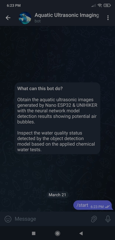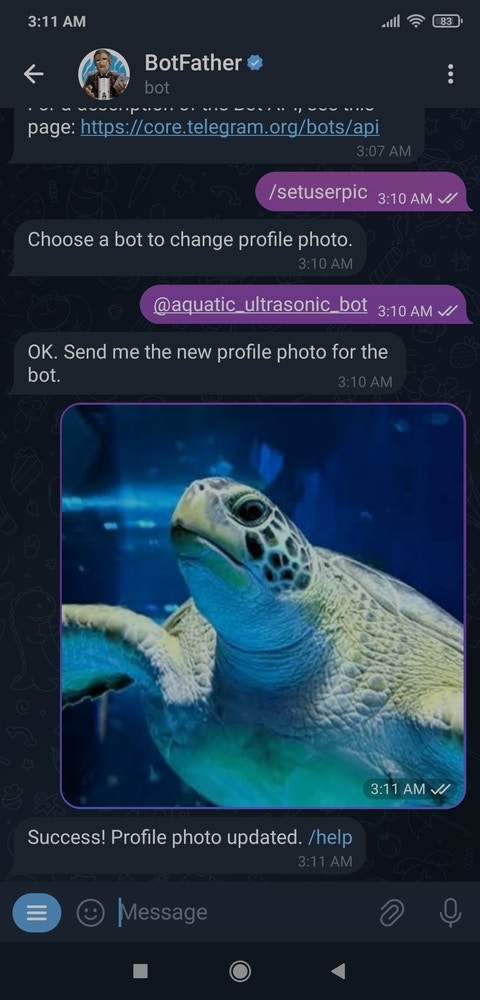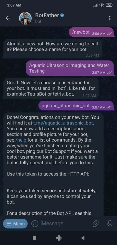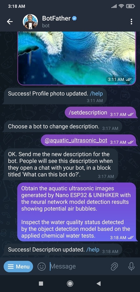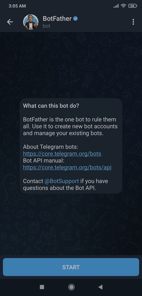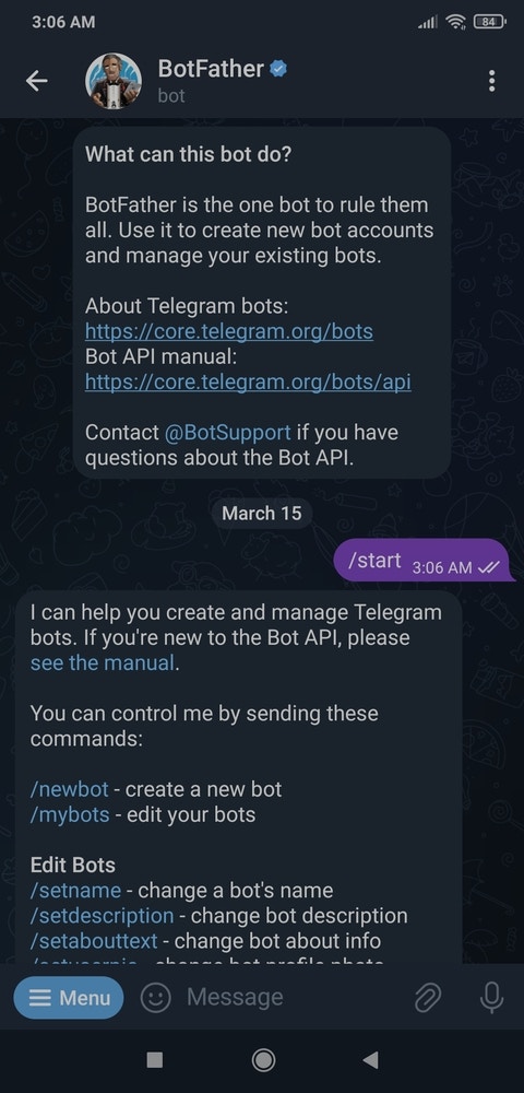 BotFather is an official Telegram bot that lets the user build and manage bots within the Telegram app without any coding or subscription required. I utilized BotFather to create a simple Telegram bot to inform the user via push notifications. :hash: First of all, open BotFather on Telegram and enter /start to view the available command list and instructions.
