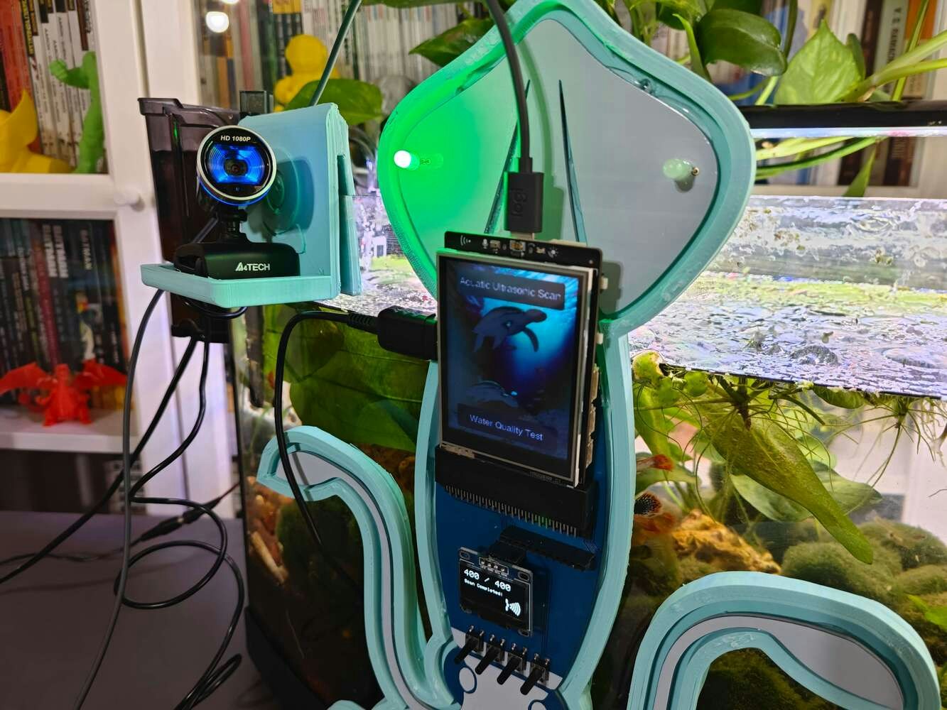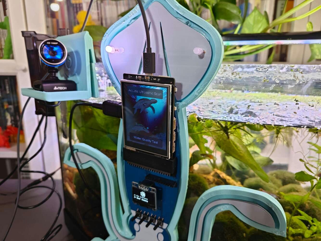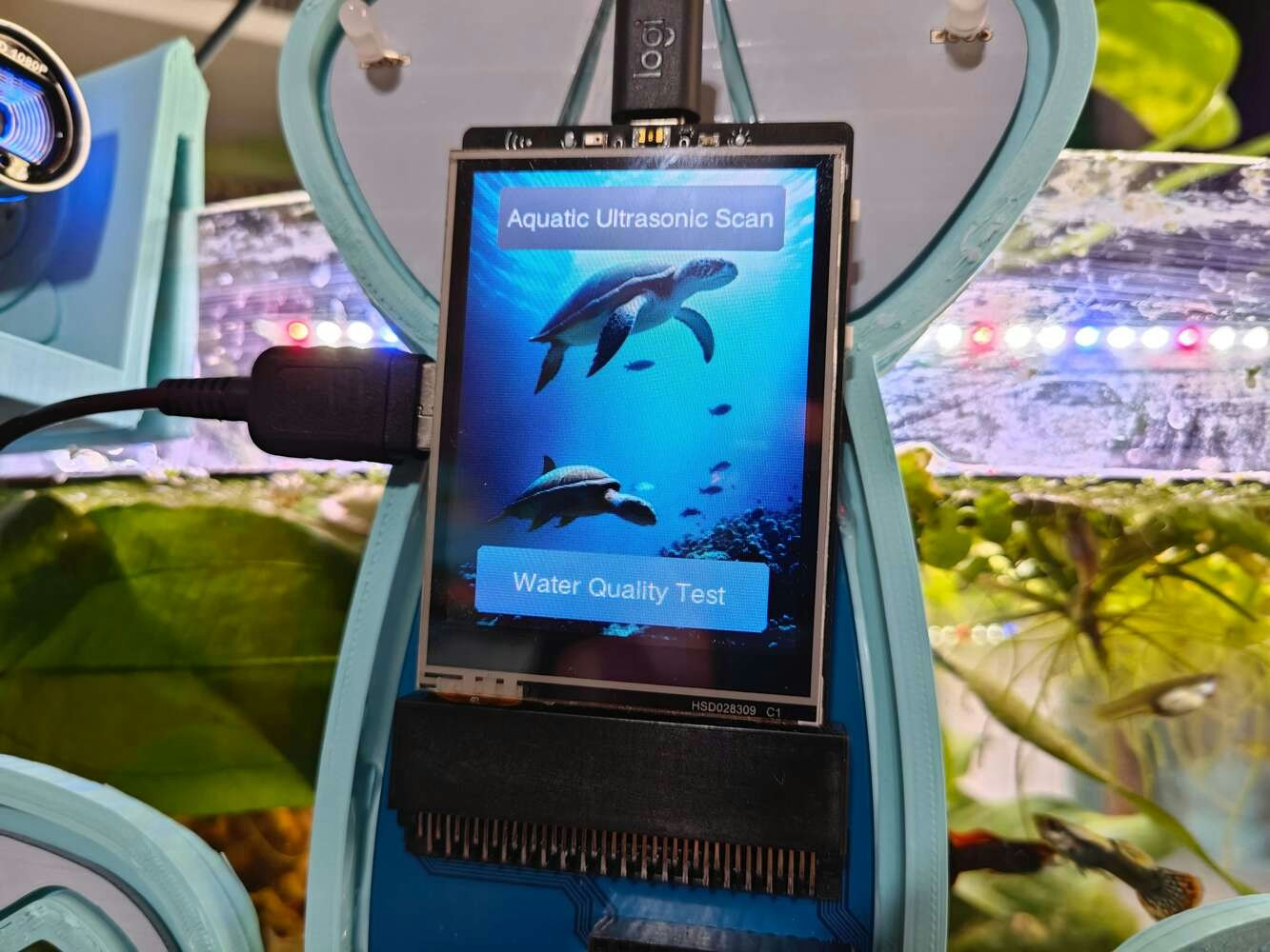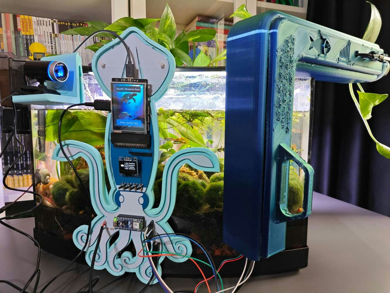 After concluding the device assembly, I hung the Squid PCB holder and the camera holder on the front side of the aquarium while collecting ultrasonic scan data buffers and capturing chemical water quality test result images. In this regard, I was able to place the high-quality USB webcam on the hang-on camera holder when standing idle and position the URM15 ultrasonic sensor precisely while scanning the underwater substrate to produce accurate ultrasonic images. Since I designed a single-unit device structure, I did not encounter any issues while conducting extended experiments. To increase the bottom surface area and observe abundant noxious air bubbles while collecting ultrasonic scan data, I added umpteen marimo moss balls covering the bottom of the tank. In this regard, I was able to provide plentiful underwater substrate gaps for incipient air bubbles to accumulate.