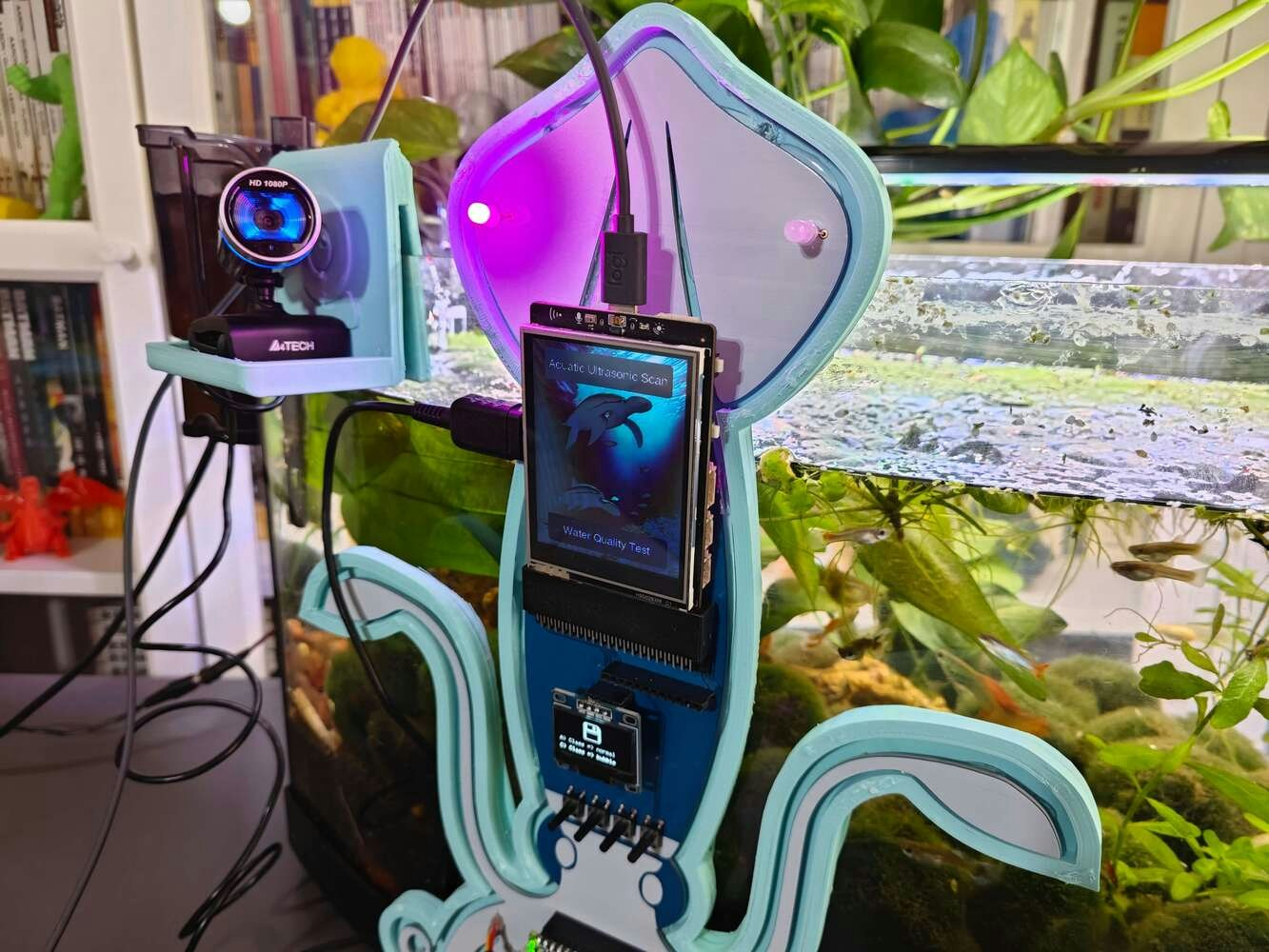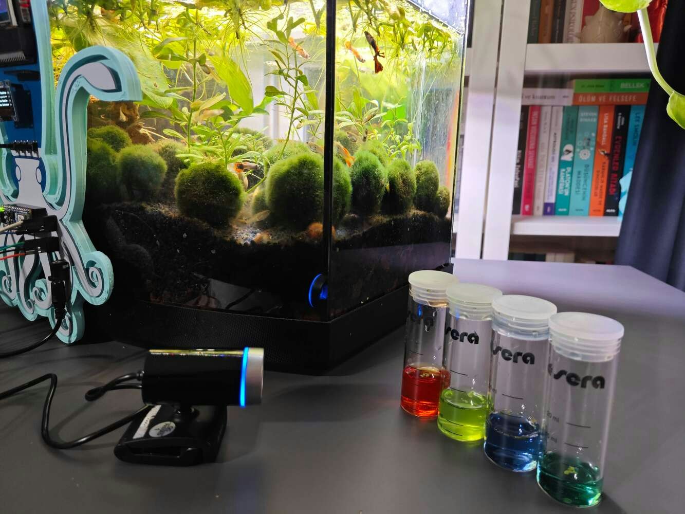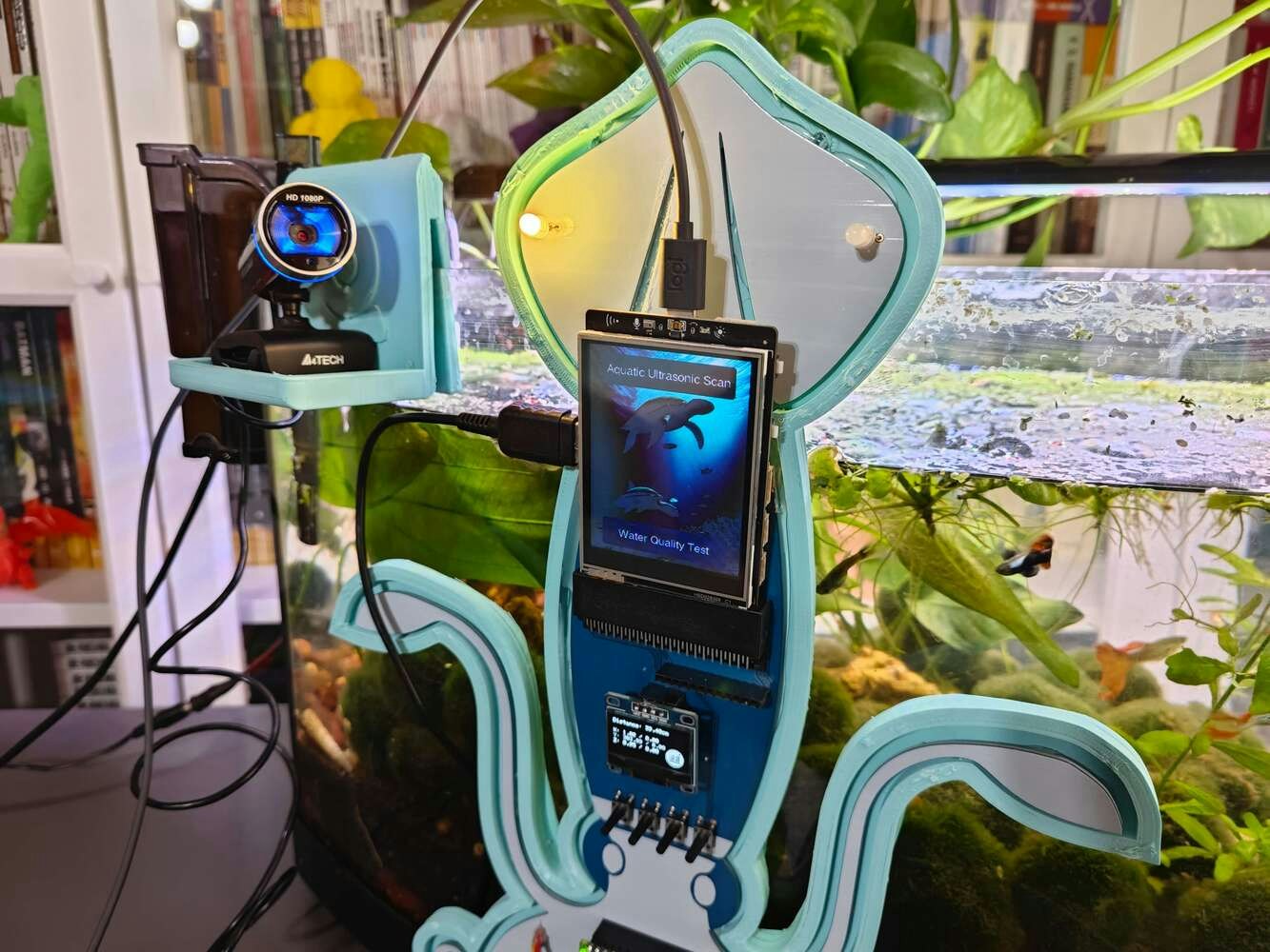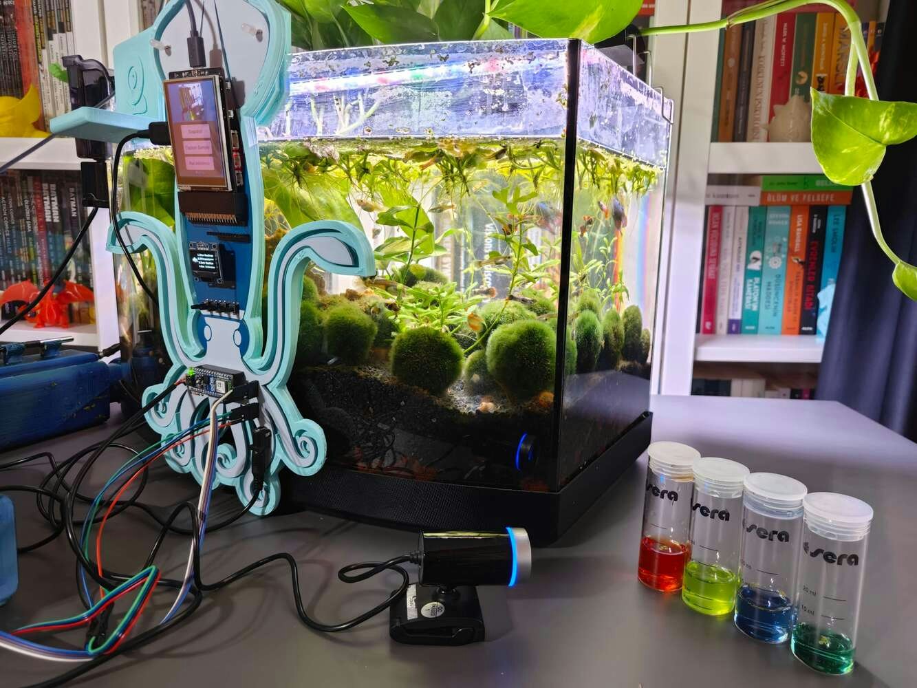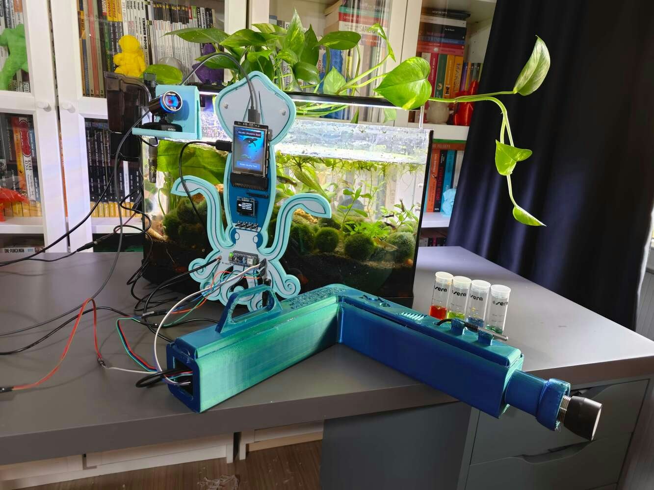 After concluding the device assembly, I hung the Squid PCB holder and the camera holder on the front side of the aquarium while collecting ultrasonic scan data buffers and capturing chemical water quality test result images. In this regard, I was able to place the high-quality USB webcam on the hang-on camera holder when standing idle and position the URM15 ultrasonic sensor precisely while scanning the underwater substrate to produce accurate ultrasonic images. Since I designed a single-unit device structure, I did not encounter any issues while conducting extended experiments. To increase the bottom surface area and observe abundant noxious air bubbles while collecting ultrasonic scan data, I added umpteen marimo moss balls covering the bottom of the tank. In this regard, I was able to provide plentiful underwater substrate gaps for incipient air bubbles to accumulate.