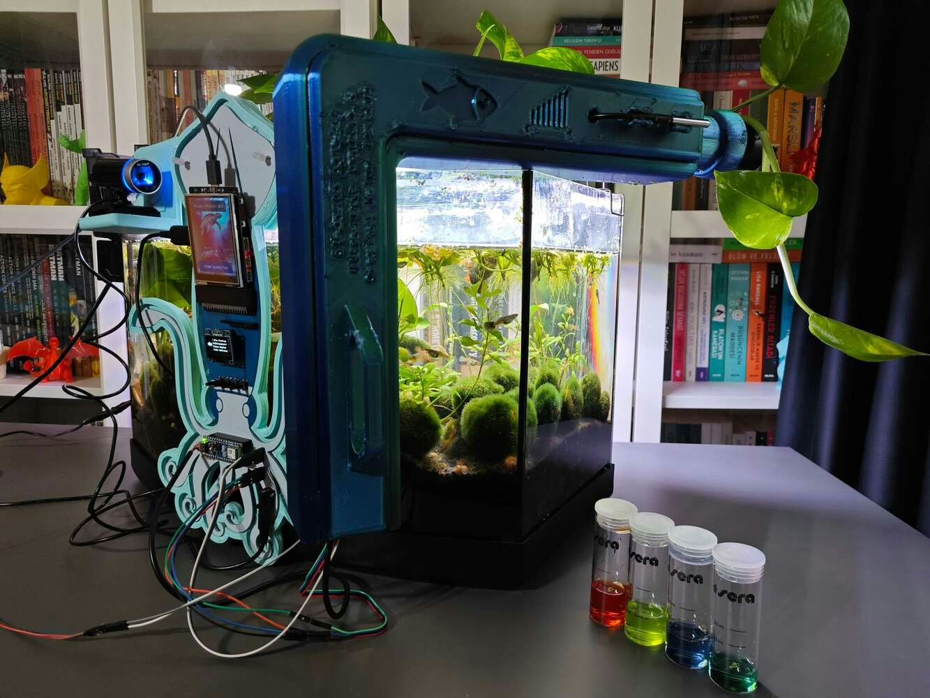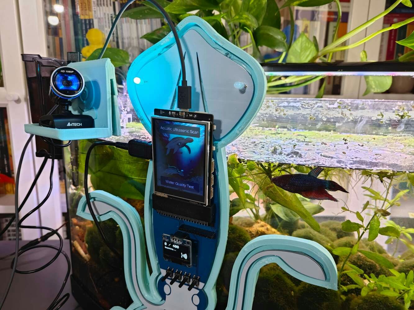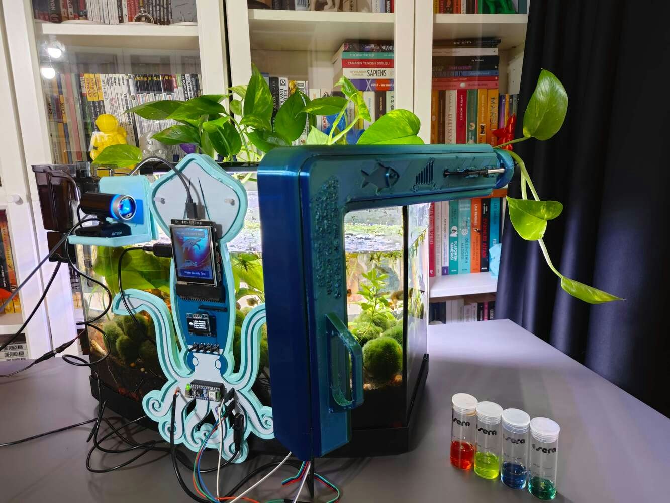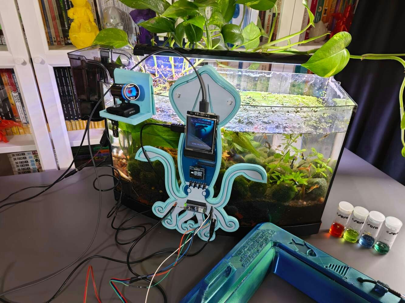 After concluding the device assembly, I hung the Squid PCB holder and the camera holder on the front side of the aquarium while collecting ultrasonic scan data buffers and capturing chemical water quality test result images. In this regard, I was able to place the high-quality USB webcam on the hang-on camera holder when standing idle and position the URM15 ultrasonic sensor precisely while scanning the underwater substrate to produce accurate ultrasonic images. Since I designed a single-unit device structure, I did not encounter any issues while conducting extended experiments. To increase the bottom surface area and observe abundant noxious air bubbles while collecting ultrasonic scan data, I added umpteen marimo moss balls covering the bottom of the tank. In this regard, I was able to provide plentiful underwater substrate gaps for incipient air bubbles to accumulate.
