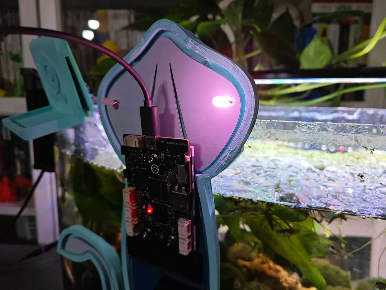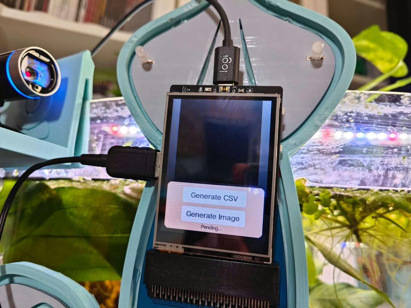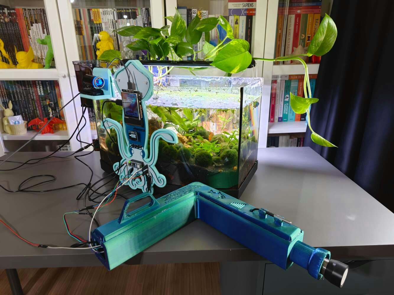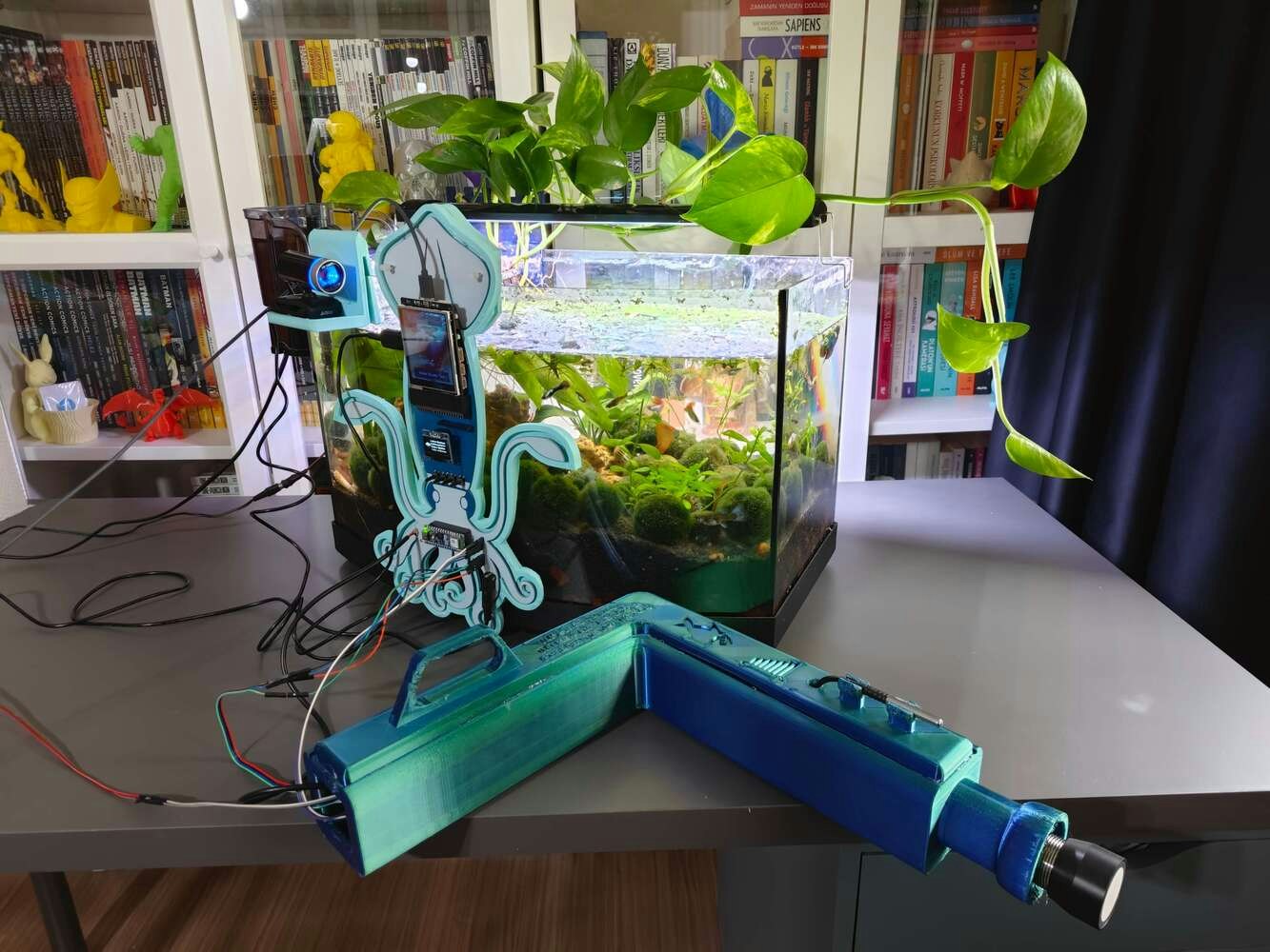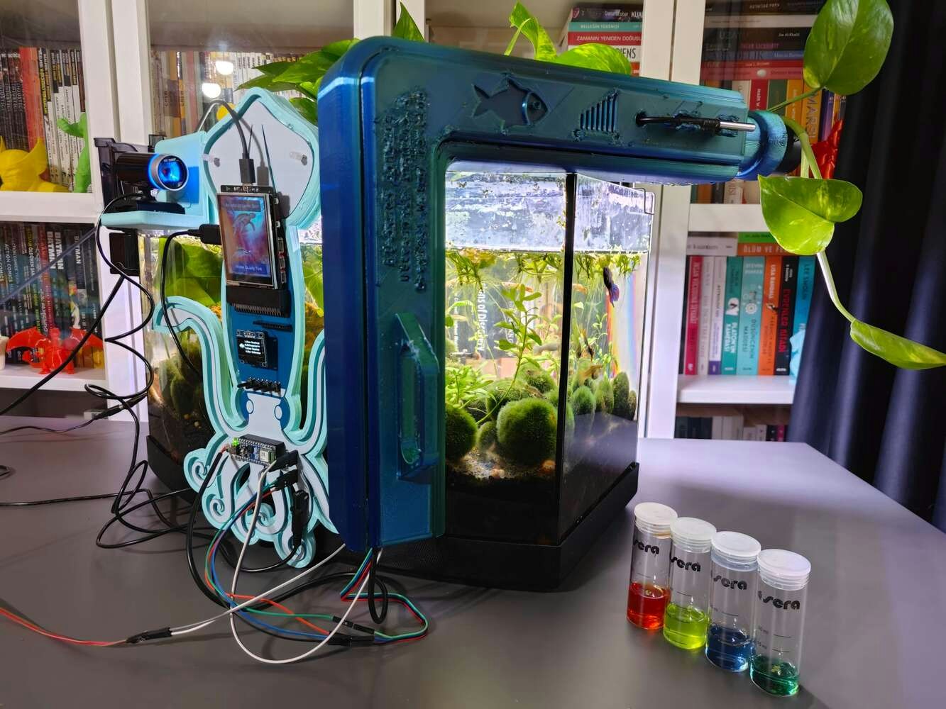 After concluding the device assembly, I hung the Squid PCB holder and the camera holder on the front side of the aquarium while collecting ultrasonic scan data buffers and capturing chemical water quality test result images. In this regard, I was able to place the high-quality USB webcam on the hang-on camera holder when standing idle and position the URM15 ultrasonic sensor precisely while scanning the underwater substrate to produce accurate ultrasonic images. Since I designed a single-unit device structure, I did not encounter any issues while conducting extended experiments. To increase the bottom surface area and observe abundant noxious air bubbles while collecting ultrasonic scan data, I added umpteen marimo moss balls covering the bottom of the tank. In this regard, I was able to provide plentiful underwater substrate gaps for incipient air bubbles to accumulate.
