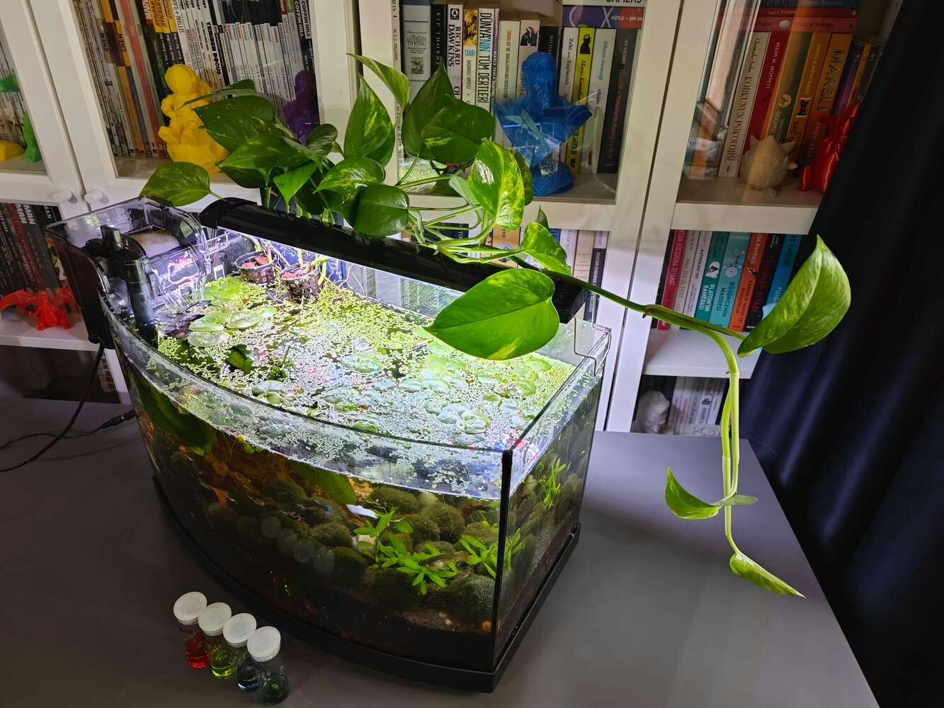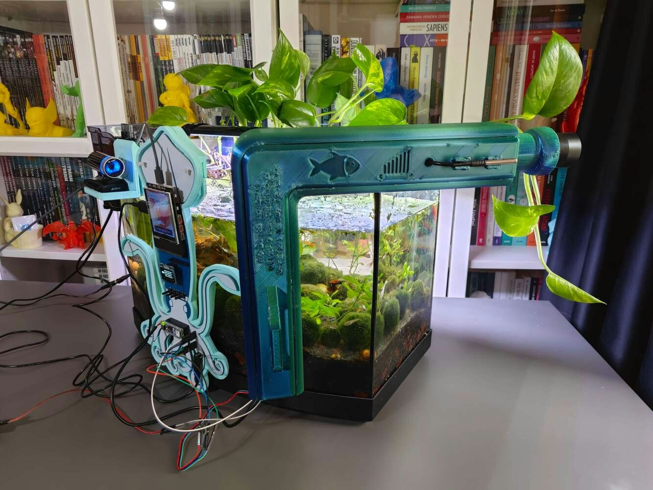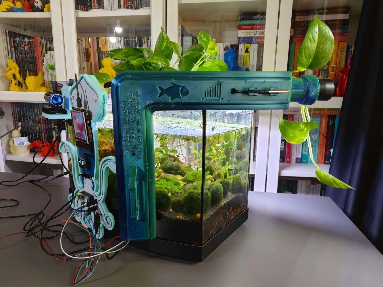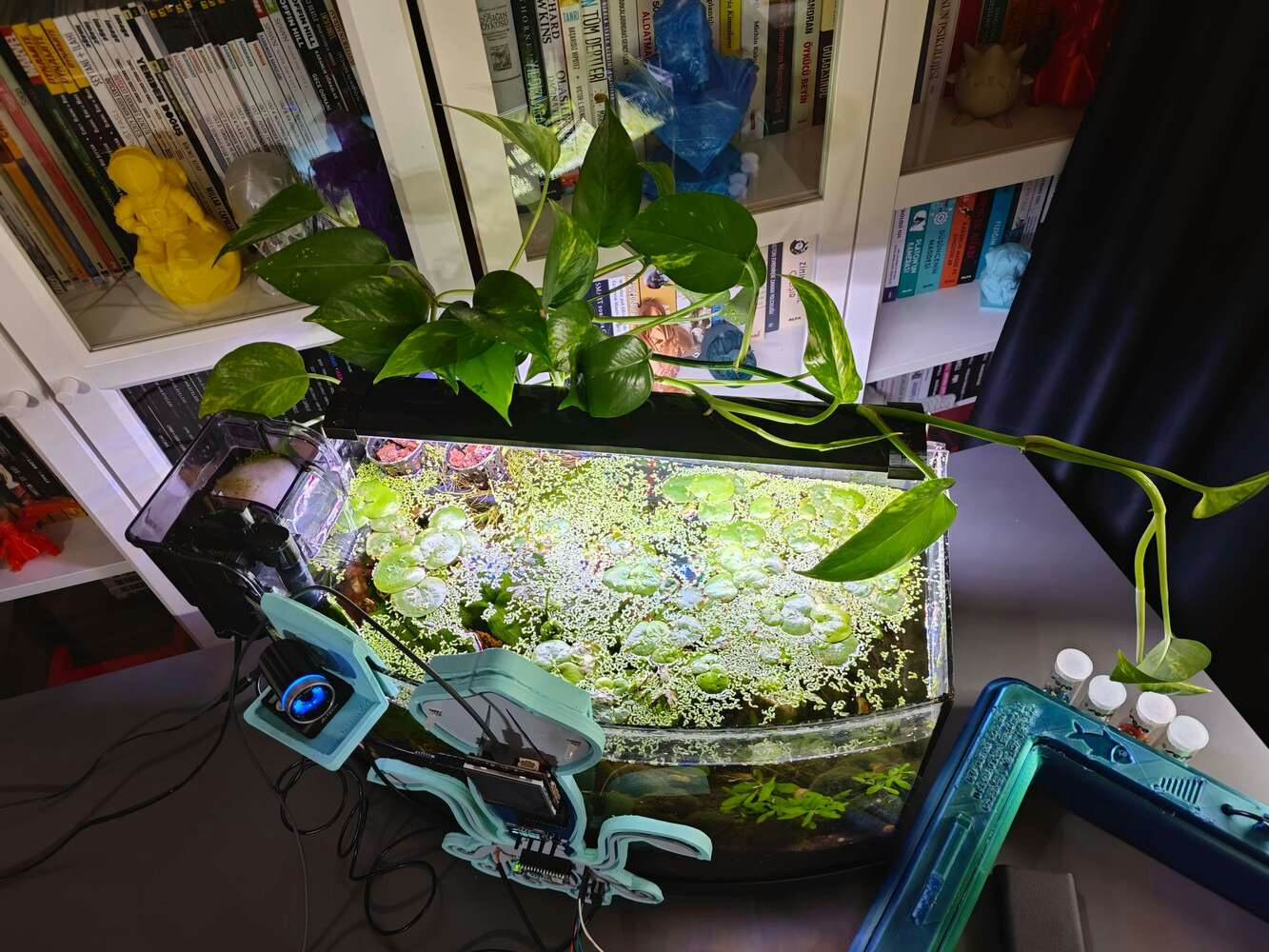 After concluding the device assembly, I hung the Squid PCB holder and the camera holder on the front side of the aquarium while collecting ultrasonic scan data buffers and capturing chemical water quality test result images. In this regard, I was able to place the high-quality USB webcam on the hang-on camera holder when standing idle and position the URM15 ultrasonic sensor precisely while scanning the underwater substrate to produce accurate ultrasonic images. Since I designed a single-unit device structure, I did not encounter any issues while conducting extended experiments. To increase the bottom surface area and observe abundant noxious air bubbles while collecting ultrasonic scan data, I added umpteen marimo moss balls covering the bottom of the tank. In this regard, I was able to provide plentiful underwater substrate gaps for incipient air bubbles to accumulate.