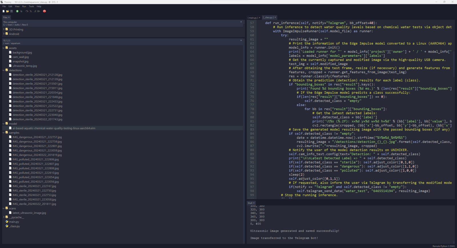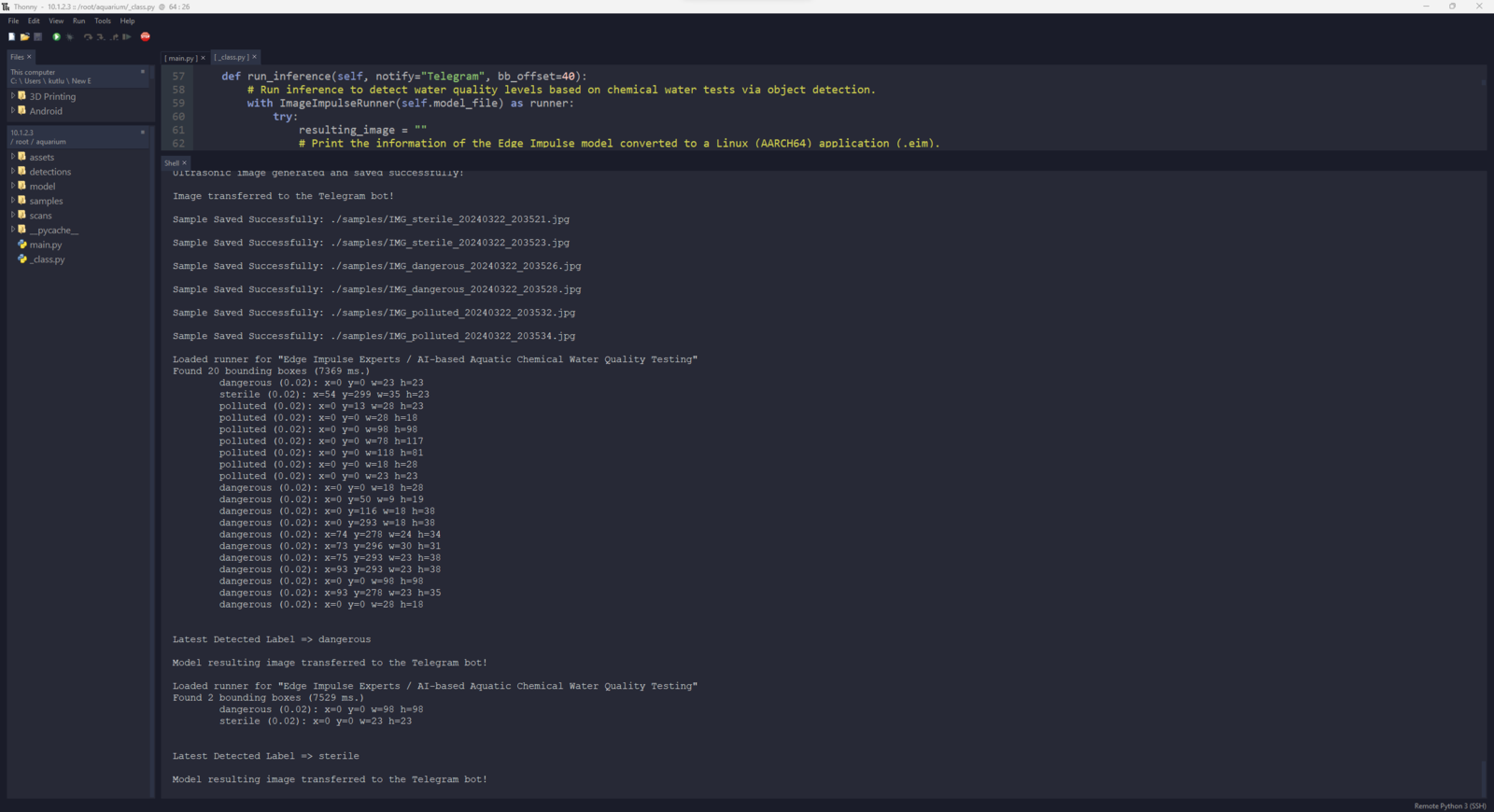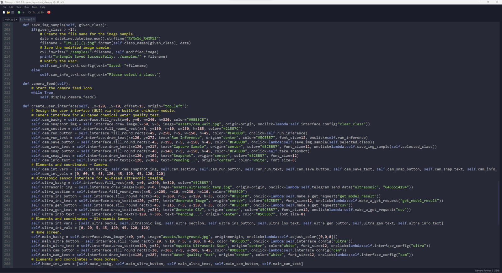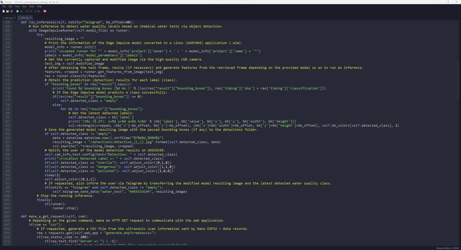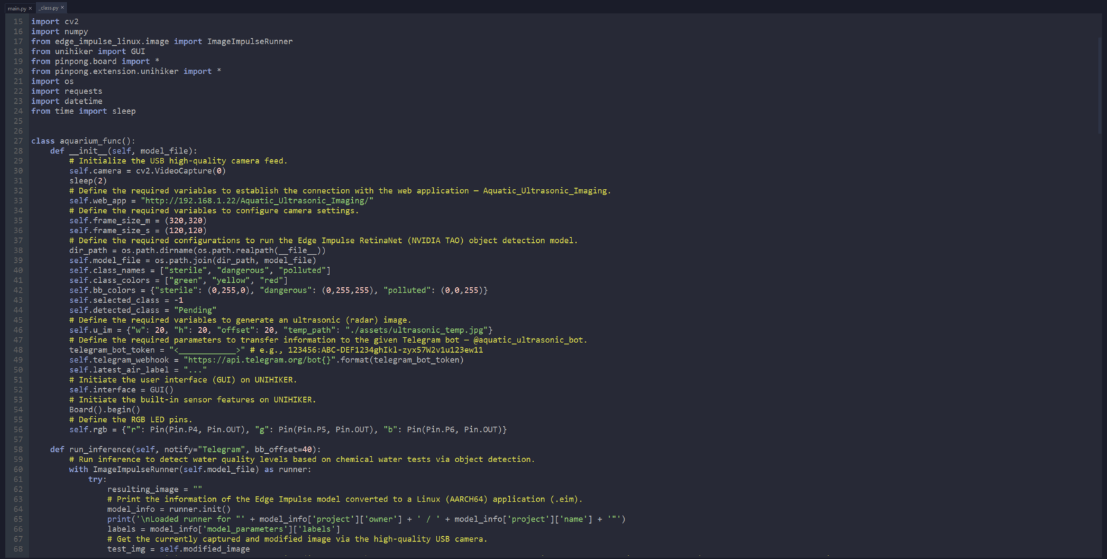 After setting up the necessary software on UNIHIKER via SSH and installing the required modules, I programmed UNIHIKER to capture the water quality test result images with the USB webcam and save them as samples. Since I wanted to provide a feature-rich user interface to capture water quality test result image samples, assign labels, and access the interconnected features, I decided to program an interactive user interface (GUI — Tkinter application) with the integrated Python modules. Since UNIHIKER provides an onboard touchscreen and two control buttons, I did not need to connect additional components to display the user interface. Via the micro:bit-compatible edge connector on the Squid PCB, I added a secondary RGB LED to inform the user of the device status while performing operations related to UNIHIKER. As explained earlier, I managed to group water pollution levels into three categories. Thus, I added the corresponding pollution levels as labels to the file names of each sample while capturing images to create a valid data set for the object detection model. This AI-powered underwater air bubble detection device, assessing water pollution based on chemical tests, comprises two separate development boards — UNIHIKER and Nano ESP32 — performing interconnected features for data collection and running advanced AI models. Thus, the described code snippets show the different aspects of the same code file. Please refer to the code files below to inspect all interconnected functions in detail. 📁 _class.py To bundle all functions under a specific structure, I created a class named aquarium_func. In the following steps, I will clarify the remaining functions of this class. Please refer to the _class.py file to inspect all interconnected functions. ⭐ In the display_camera_feed function: ⭐ Obtain the real-time video stream (frames) generated by the high-quality USB webcam. ⭐ Resize the latest captured camera frame depending on the provided image sample sizes of the Edge Impulse object detection model. ⭐ Then, resize the same frame to display a snapshot of the latest captured camera frame on the onboard touchscreen. ⭐ Stop the real-time camera feed if requested.- Home