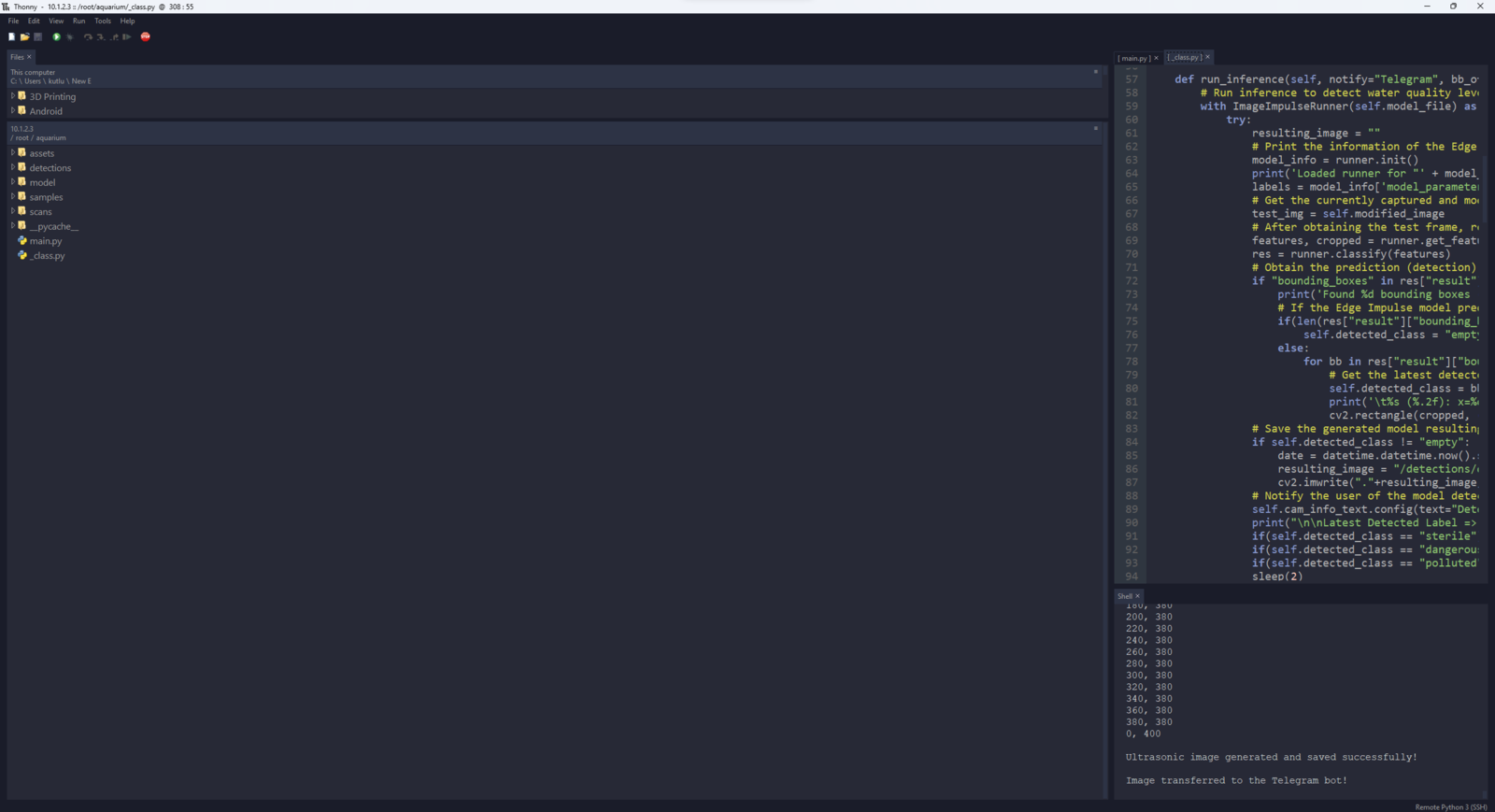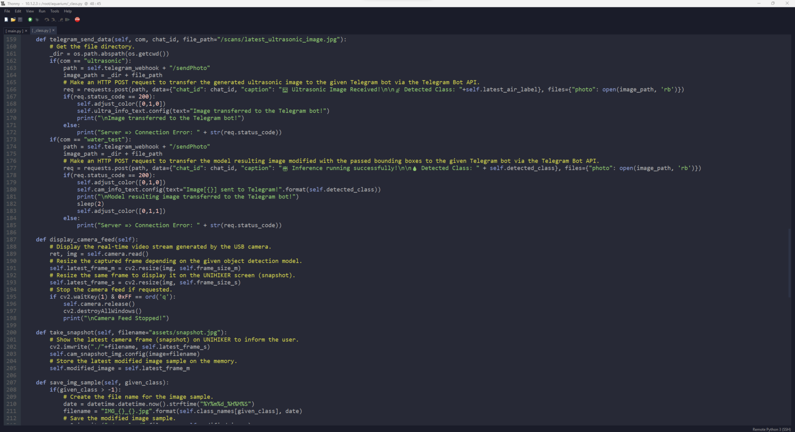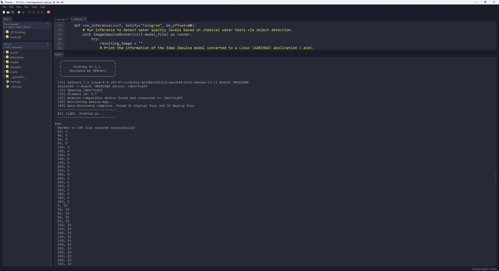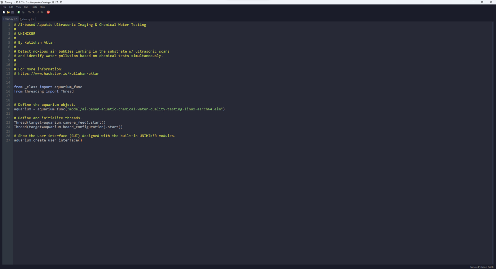 After setting up the necessary software on UNIHIKER via SSH and installing the required modules, I programmed UNIHIKER to capture the water quality test result images with the USB webcam and save them as samples. Since I wanted to provide a feature-rich user interface to capture water quality test result image samples, assign labels, and access the interconnected features, I decided to program an interactive user interface (GUI — Tkinter application) with the integrated Python modules. Since UNIHIKER provides an onboard touchscreen and two control buttons, I did not need to connect additional components to display the user interface. Via the micro:bit-compatible edge connector on the Squid PCB, I added a secondary RGB LED to inform the user of the device status while performing operations related to UNIHIKER. As explained earlier, I managed to group water pollution levels into three categories. Thus, I added the corresponding pollution levels as labels to the file names of each sample while capturing images to create a valid data set for the object detection model. This AI-powered underwater air bubble detection device, assessing water pollution based on chemical tests, comprises two separate development boards — UNIHIKER and Nano ESP32 — performing interconnected features for data collection and running advanced AI models. Thus, the described code snippets show the different aspects of the same code file. Please refer to the code files below to inspect all interconnected functions in detail. 📁 _class.py To bundle all functions under a specific structure, I created a class named aquarium_func. In the following steps, I will clarify the remaining functions of this class. Please refer to the _class.py file to inspect all interconnected functions. ⭐ In the display_camera_feed function: ⭐ Obtain the real-time video stream (frames) generated by the high-quality USB webcam. ⭐ Resize the latest captured camera frame depending on the provided image sample sizes of the Edge Impulse object detection model. ⭐ Then, resize the same frame to display a snapshot of the latest captured camera frame on the onboard touchscreen. ⭐ Stop the real-time camera feed if requested.- Home