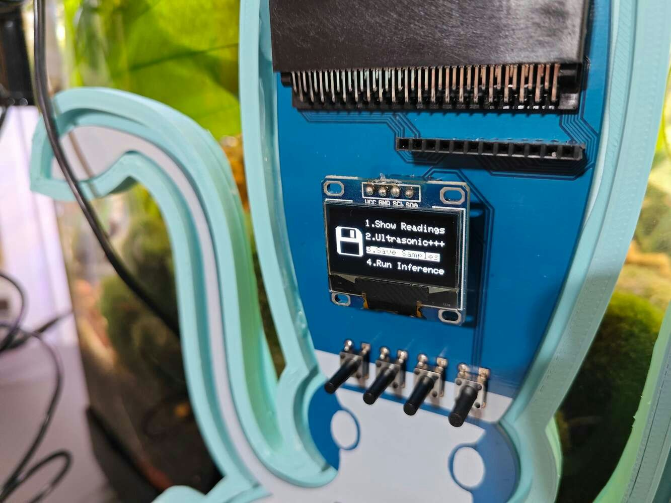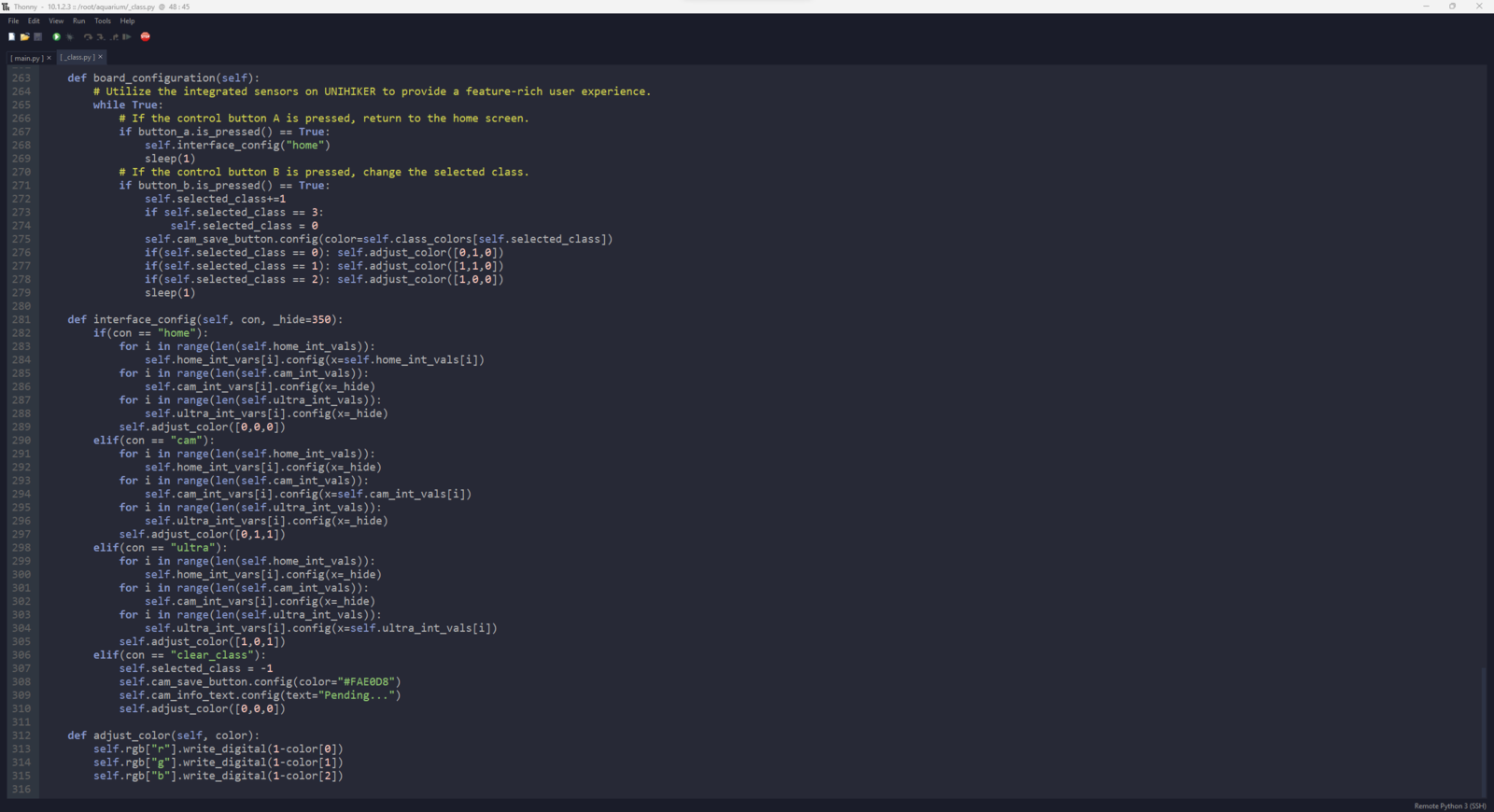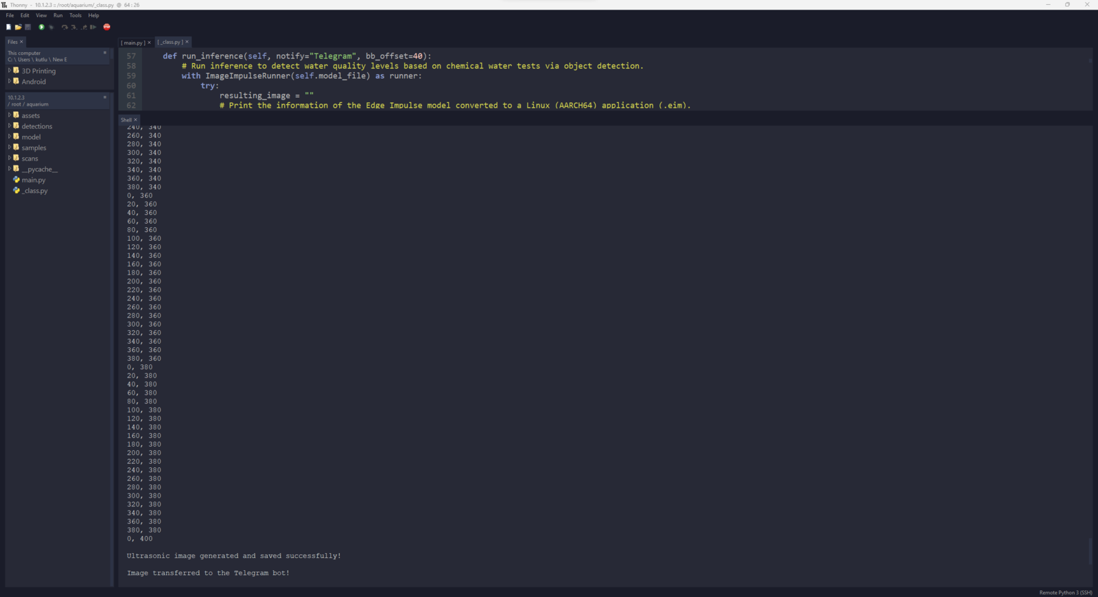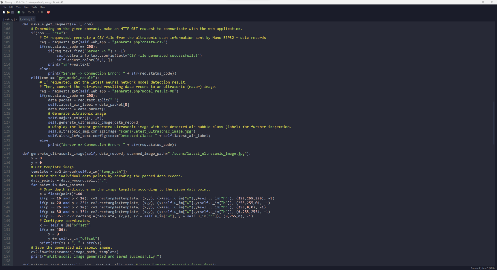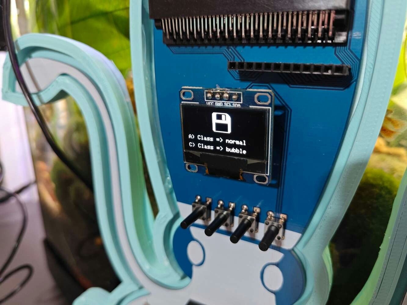 After setting up the necessary software on UNIHIKER via SSH and installing the required modules, I programmed UNIHIKER to capture the water quality test result images with the USB webcam and save them as samples. Since I wanted to provide a feature-rich user interface to capture water quality test result image samples, assign labels, and access the interconnected features, I decided to program an interactive user interface (GUI — Tkinter application) with the integrated Python modules. Since UNIHIKER provides an onboard touchscreen and two control buttons, I did not need to connect additional components to display the user interface. Via the micro:bit-compatible edge connector on the Squid PCB, I added a secondary RGB LED to inform the user of the device status while performing operations related to UNIHIKER. As explained earlier, I managed to group water pollution levels into three categories. Thus, I added the corresponding pollution levels as labels to the file names of each sample while capturing images to create a valid data set for the object detection model. This AI-powered underwater air bubble detection device, assessing water pollution based on chemical tests, comprises two separate development boards — UNIHIKER and Nano ESP32 — performing interconnected features for data collection and running advanced AI models. Thus, the described code snippets show the different aspects of the same code file. Please refer to the code files below to inspect all interconnected functions in detail. 📁 _class.py To bundle all functions under a specific structure, I created a class named aquarium_func. In the following steps, I will clarify the remaining functions of this class. Please refer to the _class.py file to inspect all interconnected functions. ⭐ In the display_camera_feed function: ⭐ Obtain the real-time video stream (frames) generated by the high-quality USB webcam. ⭐ Resize the latest captured camera frame depending on the provided image sample sizes of the Edge Impulse object detection model. ⭐ Then, resize the same frame to display a snapshot of the latest captured camera frame on the onboard touchscreen. ⭐ Stop the real-time camera feed if requested.- Home