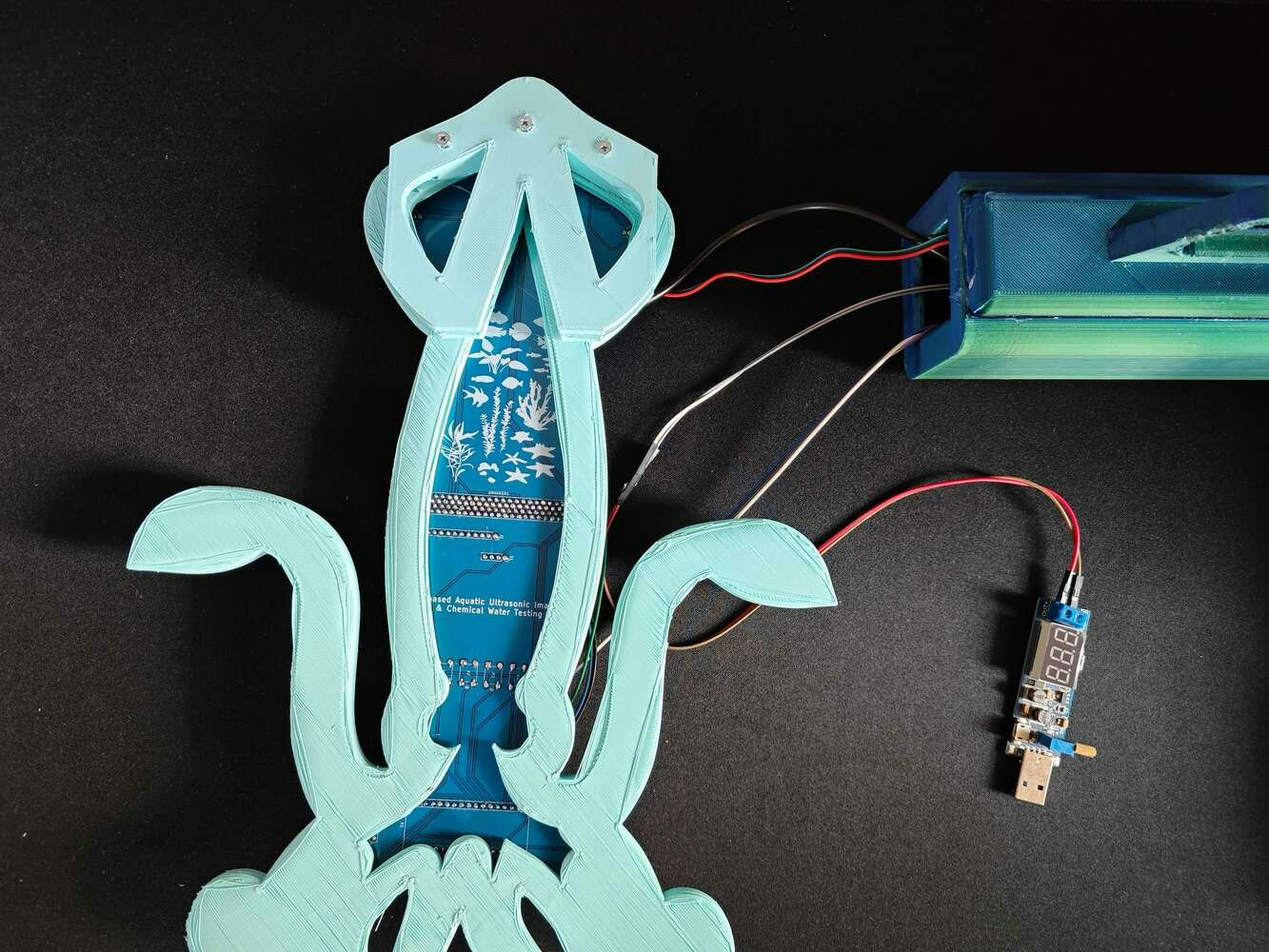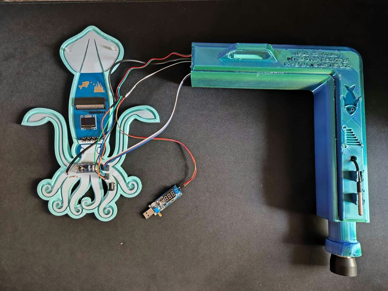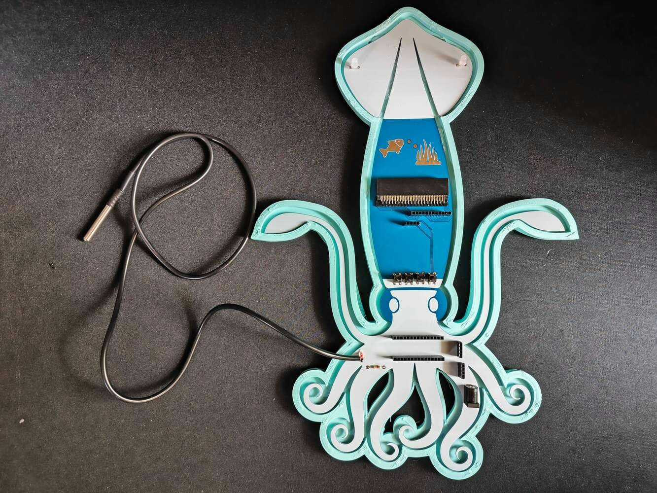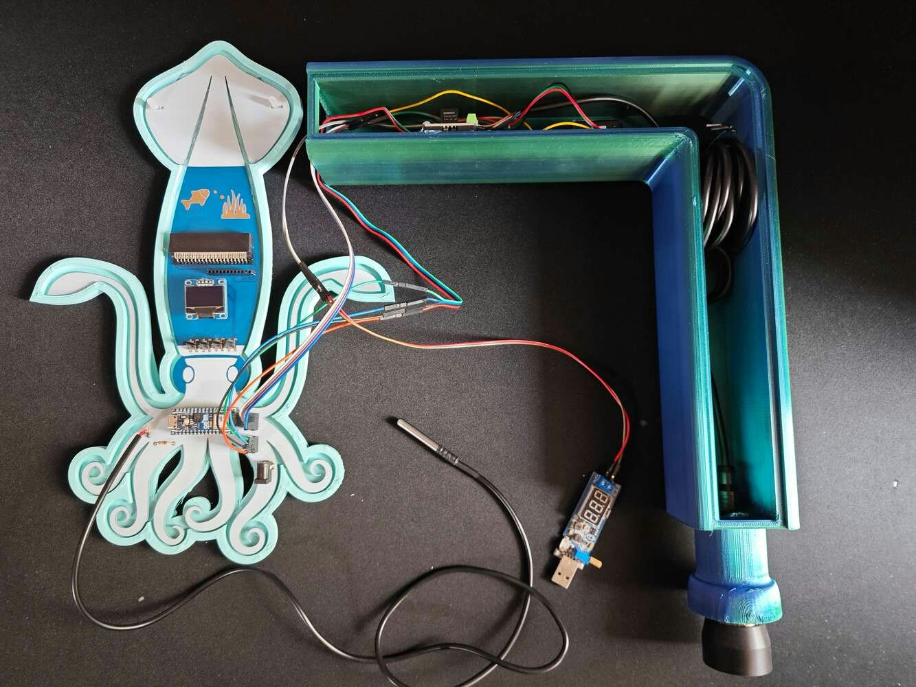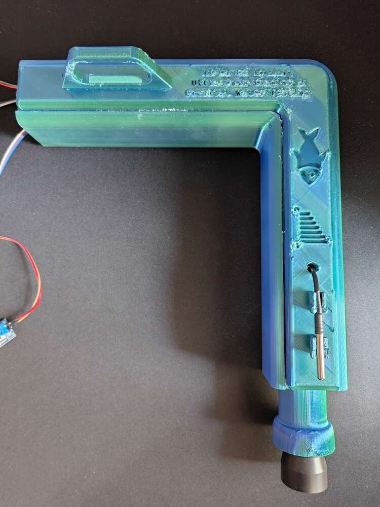 After printing all parts (models), I attached the URM15 ultrasonic sensor into its special cylindrical slot on the end point of the L-shaped main case and fastened the remaining components to their corresponding slots within the main case via a hot glue gun. Then, I fastened the Squid PCB to its unique PCB holder via the hot glue gun, encasing the PCB outline. After fastening the Squid PCB, I attached the hang-on aquarium connector to the back of the PCB holder via M3 screws and nuts. Since the removable top cover has special semicircular-shaped mounting brackets, the DS18B20 waterproof temperature sensor can externally be attached to the top cover. Finally, I affixed the top cover to the main case via its provided snap-fit joints.