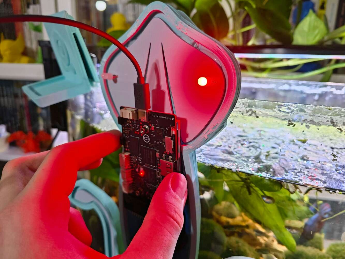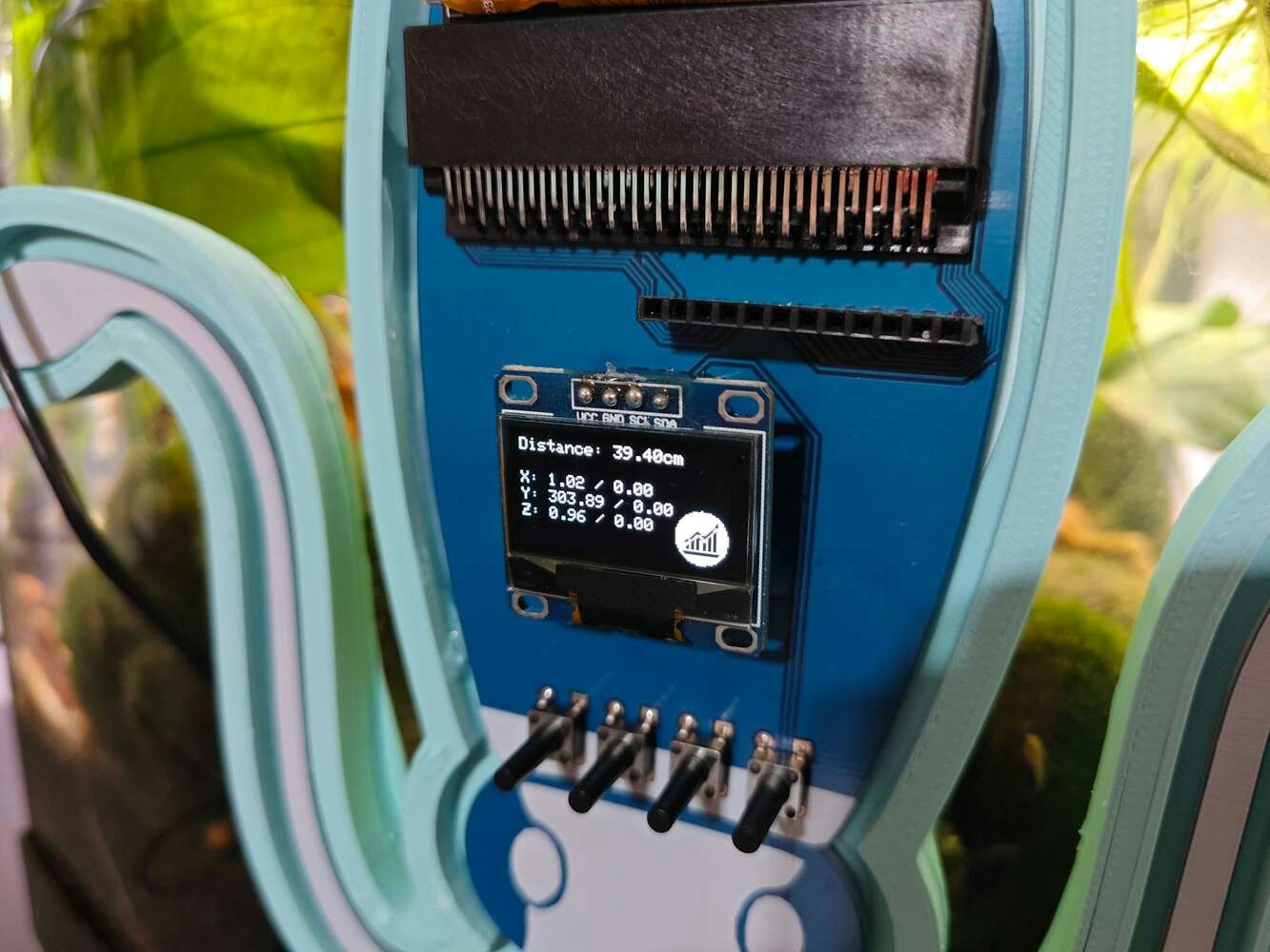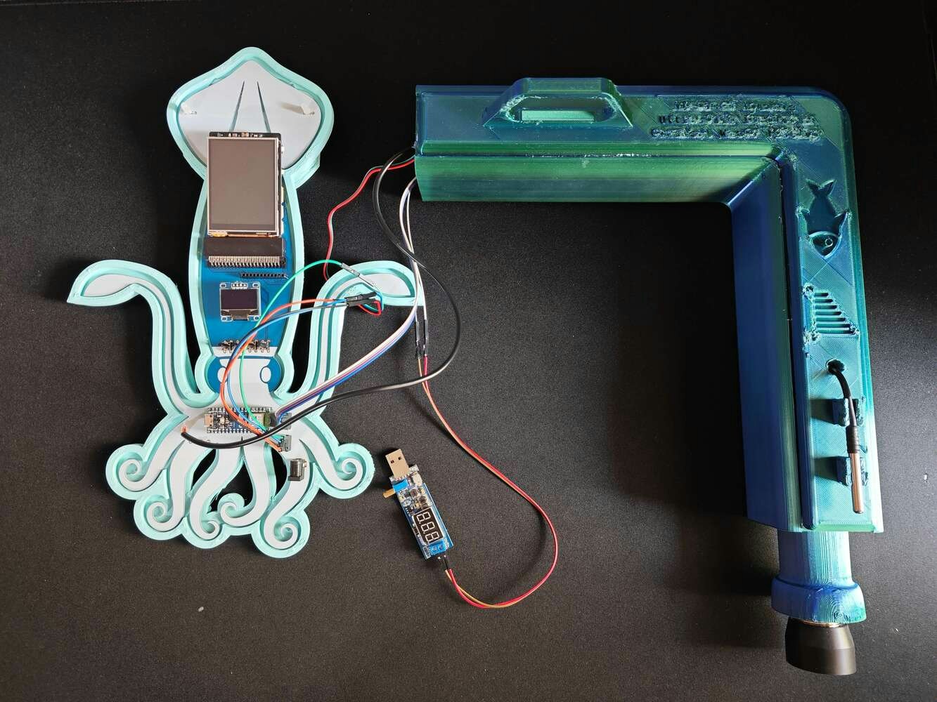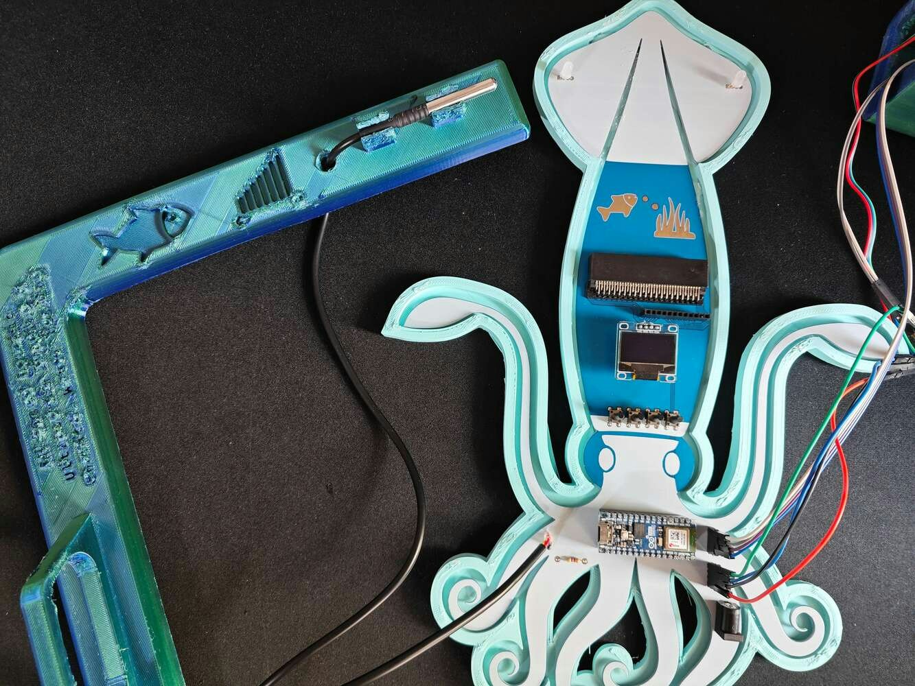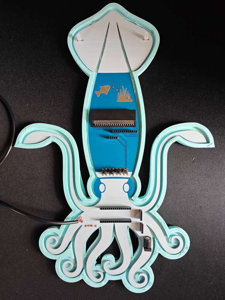 After printing all parts (models), I attached the URM15 ultrasonic sensor into its special cylindrical slot on the end point of the L-shaped main case and fastened the remaining components to their corresponding slots within the main case via a hot glue gun. Then, I fastened the Squid PCB to its unique PCB holder via the hot glue gun, encasing the PCB outline. After fastening the Squid PCB, I attached the hang-on aquarium connector to the back of the PCB holder via M3 screws and nuts. Since the removable top cover has special semicircular-shaped mounting brackets, the DS18B20 waterproof temperature sensor can externally be attached to the top cover. Finally, I affixed the top cover to the main case via its provided snap-fit joints.
