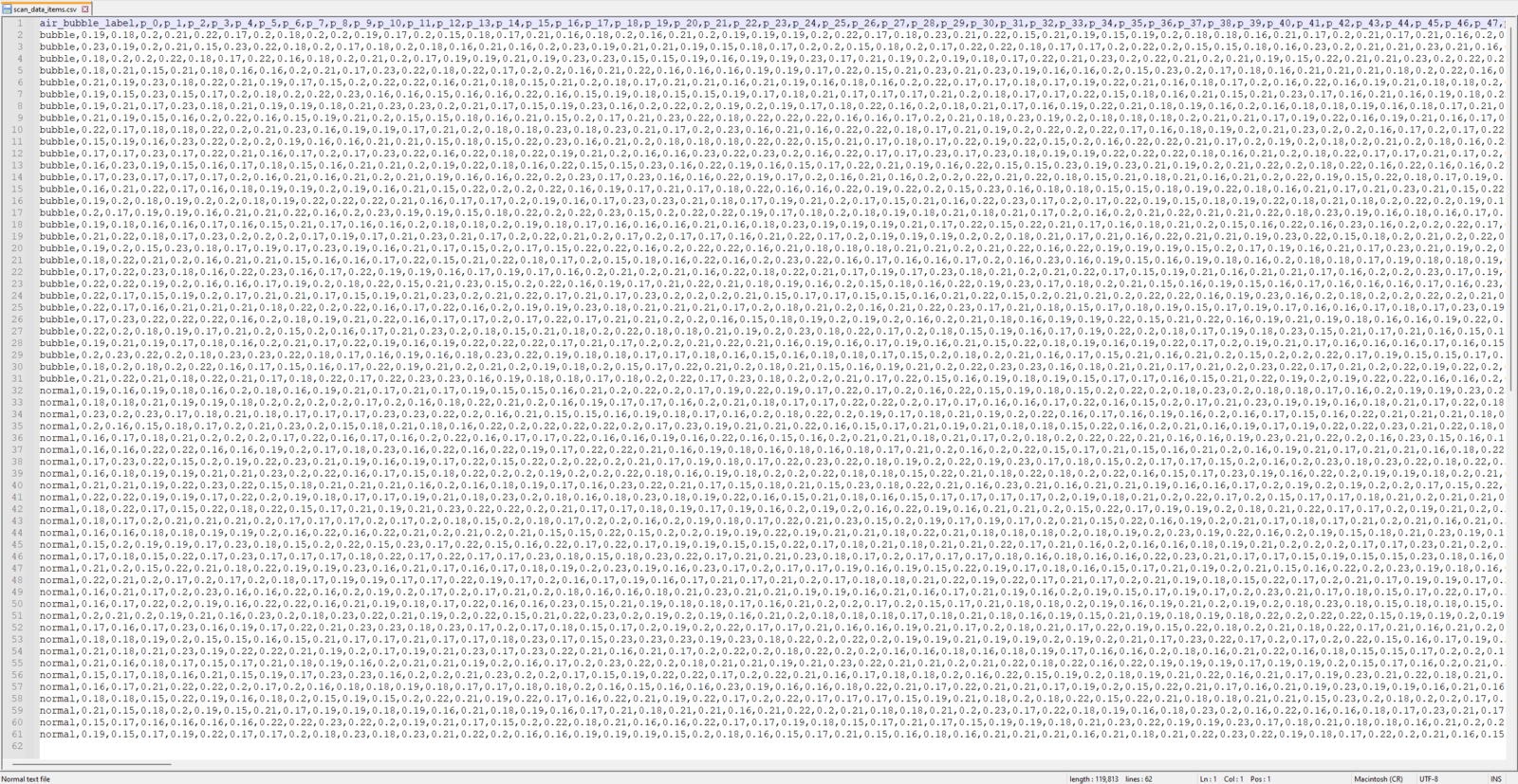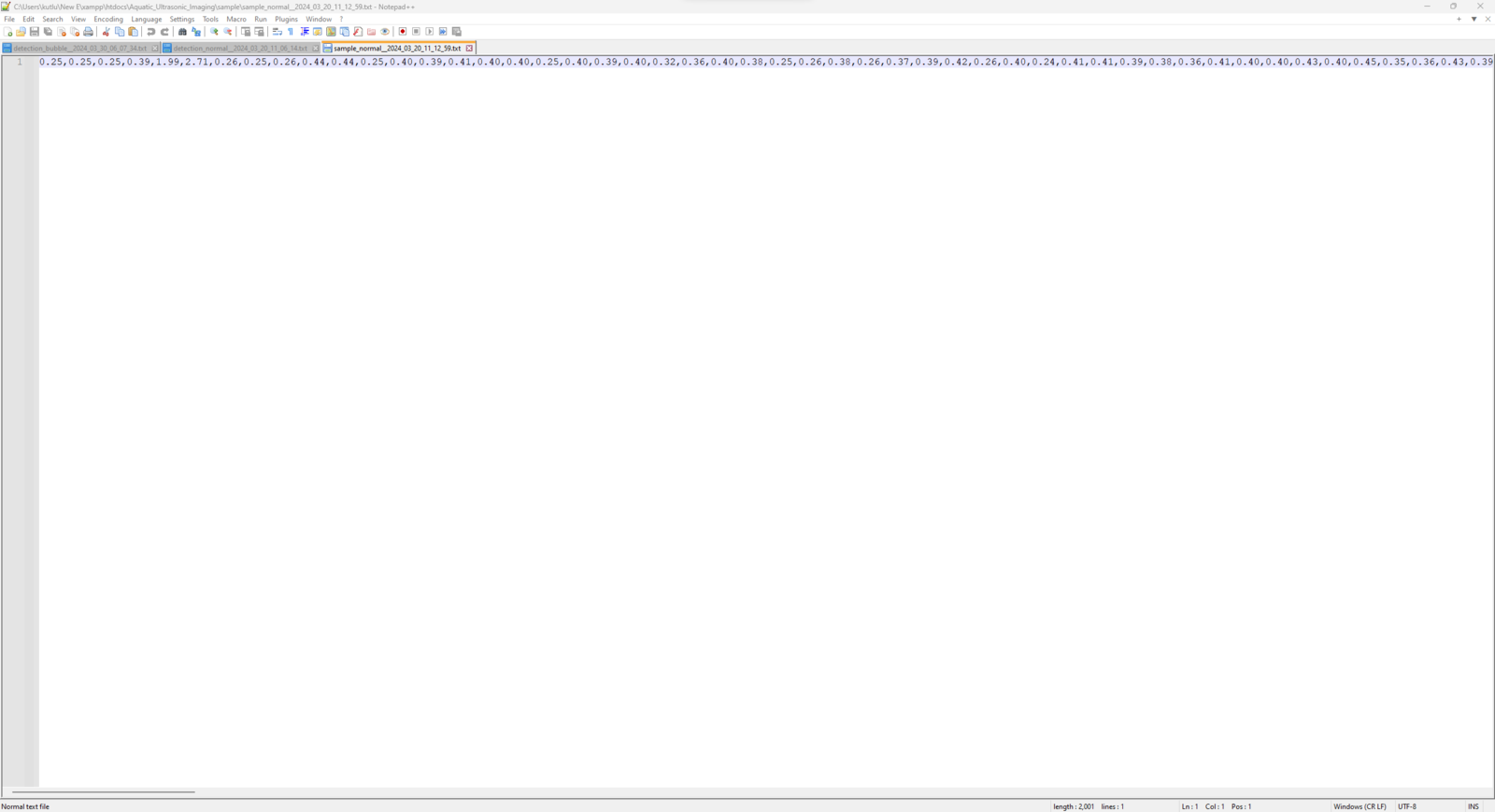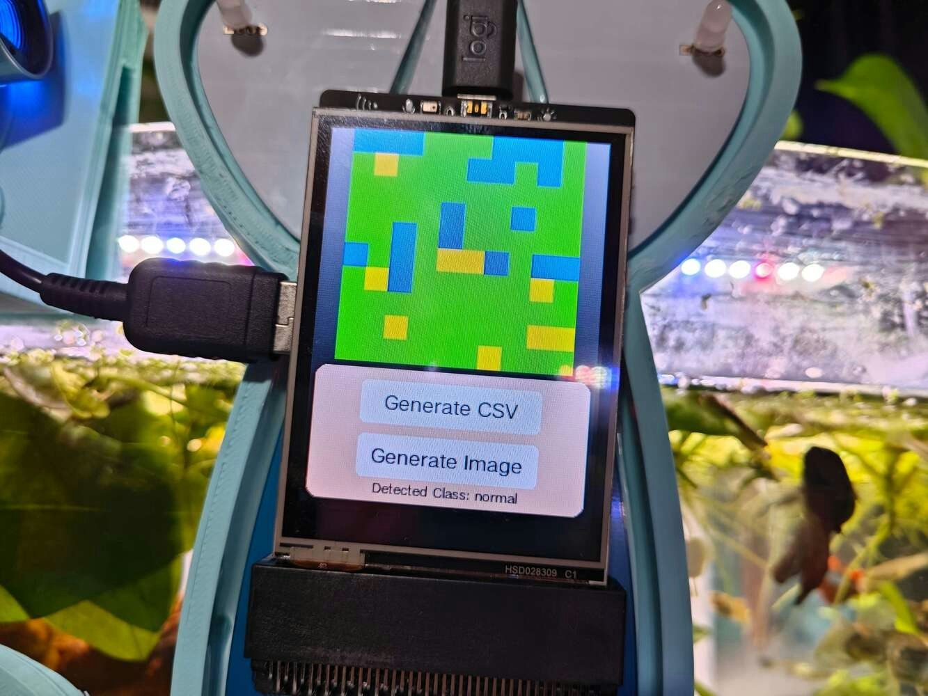 As explained earlier, I set up a freshwater aquarium to simulate the harsh fish farm conditions leading to noxious air bubbles lurking in the underwater substrate. Then, I utilized the URM15 (waterproof) ultrasonic sensor to generate ultrasonic scan buffers of the bottom of the tank, consisting of 400 data points as a 20 x 20 ultrasonic image. While collecting and saving aquatic ultrasonic scan buffers, I empirically differentiated the produced samples (data records) depending on the presence of toxic air bubbles:- normal