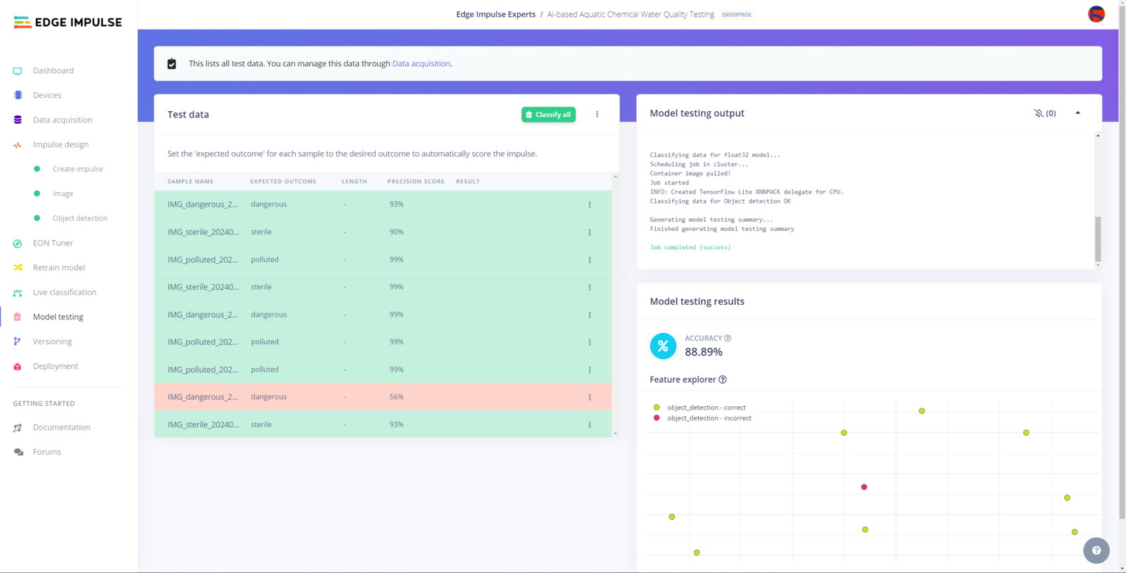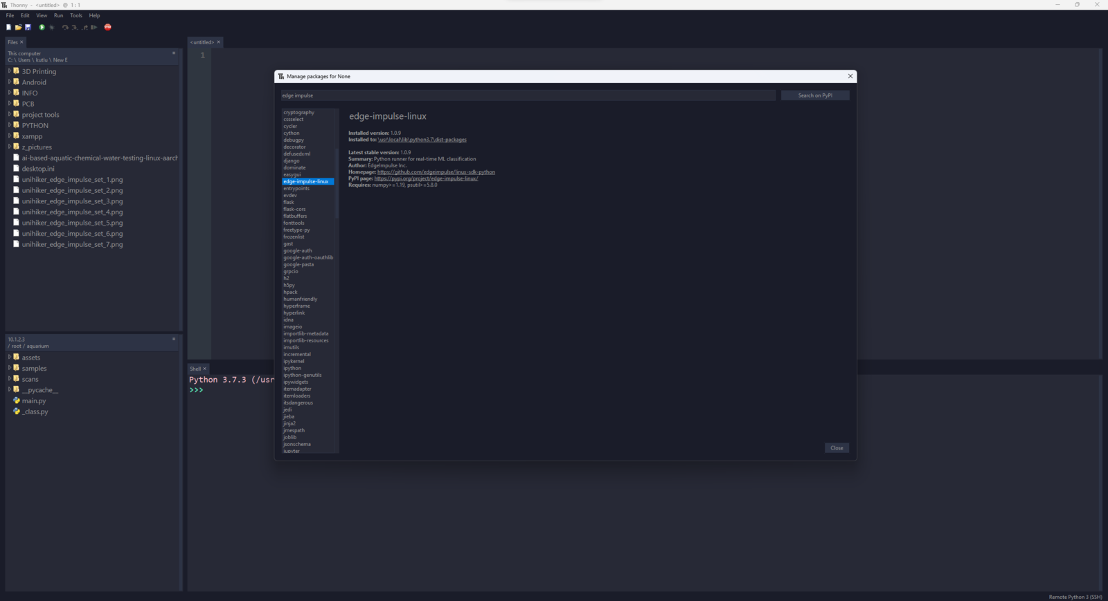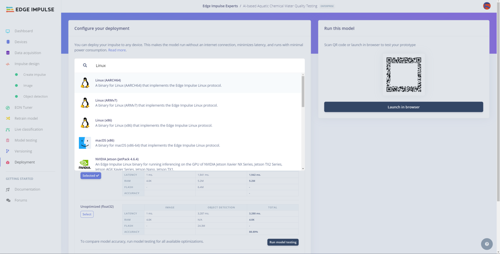 After building, training, and deploying my RetinaNet object detection model as a Linux (AARCH64) application on Edge Impulse, I needed to upload the generated Linux application to UNIHIKER to run the optimized model directly via the Linux Python SDK so as to create an accessible AI-powered water pollution detection device operating with minimal latency, memory usage, and power consumption. Since Edge Impulse optimizes and formats signal processing, configuration, and learning blocks into a single EIM file while deploying models as a Linux (AARCH64) application, even for complex computer vision models from NVIDIA TAO, I was able to import my advanced model effortlessly to run inferences in Python. :hash: After downloading the generated Linux (AARCH64) application to the model folder and installing the required modules via SSH, make sure to change the file permissions via the terminal on MobaXterm to be able to execute the model file. sudo chmod 777 /root/aquarium/model/ai-based-aquatic-chemical-water-quality-testing-linux-aarch64.eim