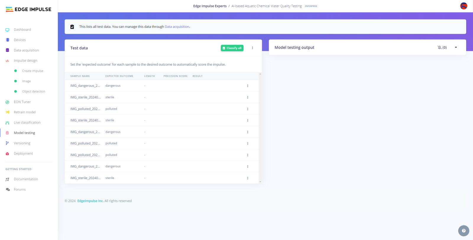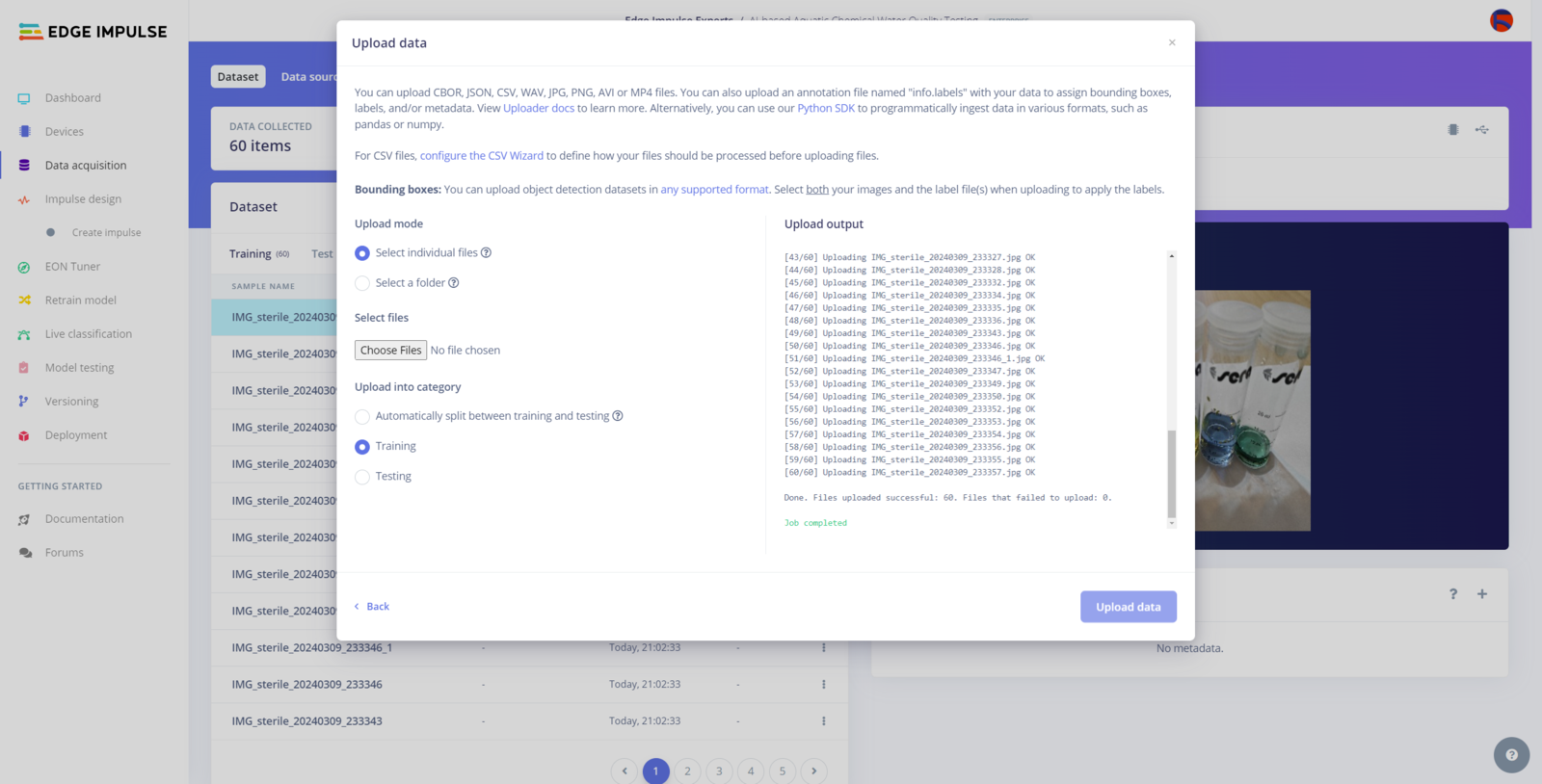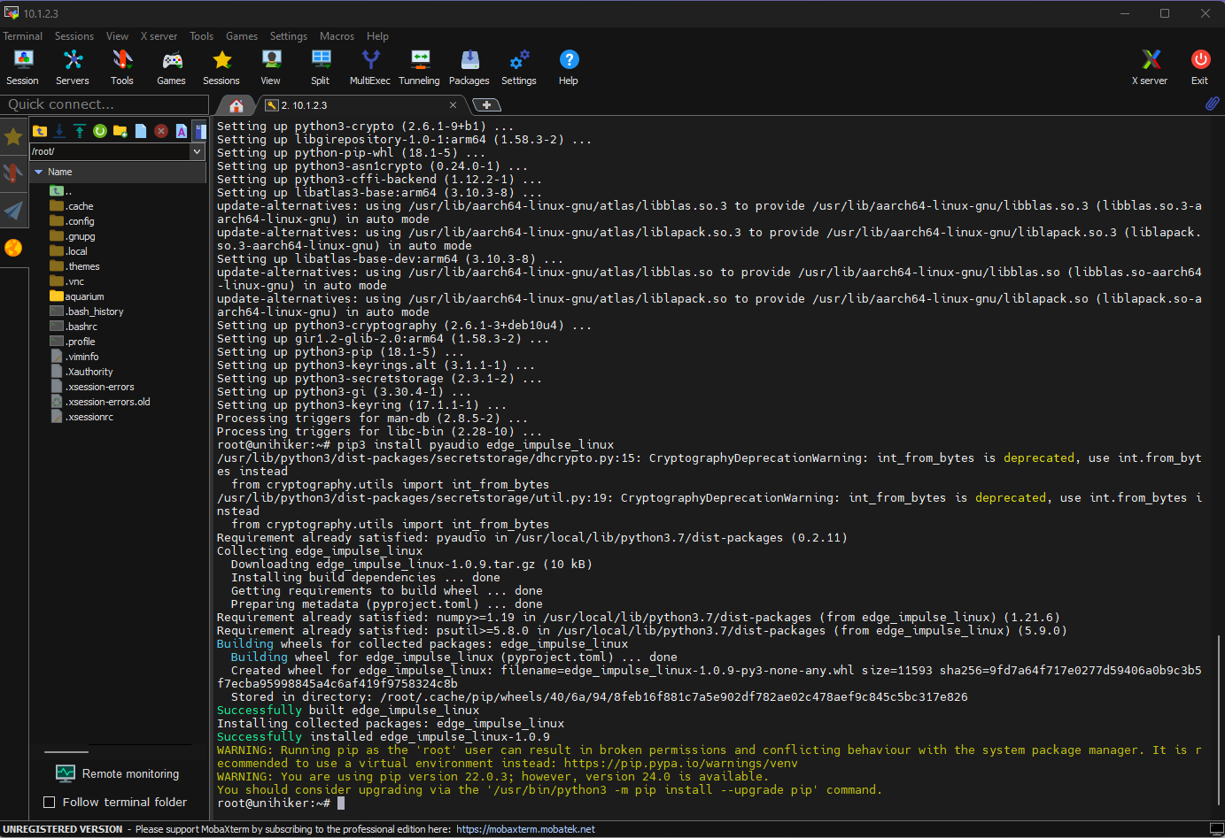 After building, training, and deploying my RetinaNet object detection model as a Linux (AARCH64) application on Edge Impulse, I needed to upload the generated Linux application to UNIHIKER to run the optimized model directly via the Linux Python SDK so as to create an accessible AI-powered water pollution detection device operating with minimal latency, memory usage, and power consumption. Since Edge Impulse optimizes and formats signal processing, configuration, and learning blocks into a single EIM file while deploying models as a Linux (AARCH64) application, even for complex computer vision models from NVIDIA TAO, I was able to import my advanced model effortlessly to run inferences in Python. :hash: After downloading the generated Linux (AARCH64) application to the model folder and installing the required modules via SSH, make sure to change the file permissions via the terminal on MobaXterm to be able to execute the model file. sudo chmod 777 /root/aquarium/model/ai-based-aquatic-chemical-water-quality-testing-linux-aarch64.eim