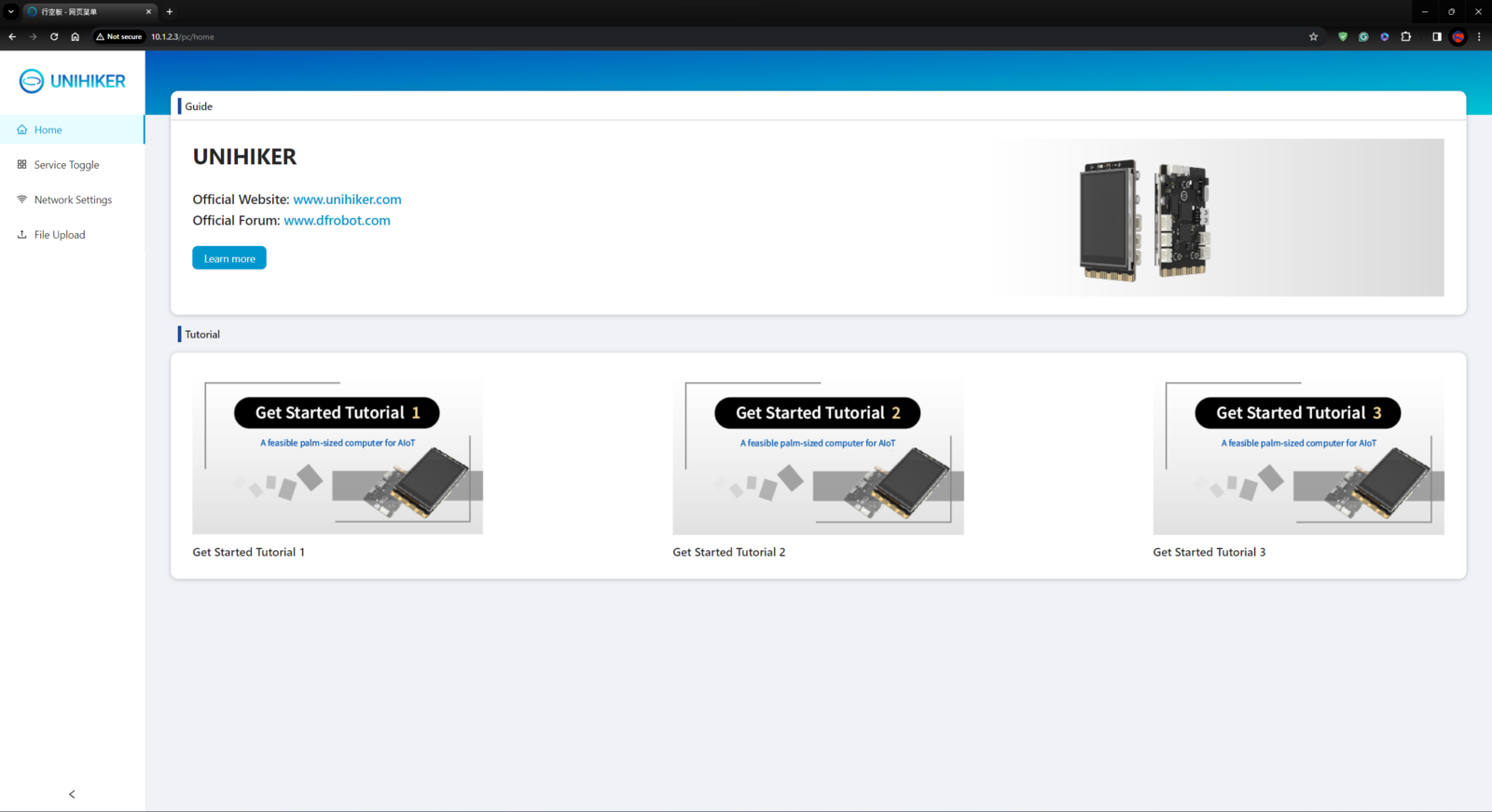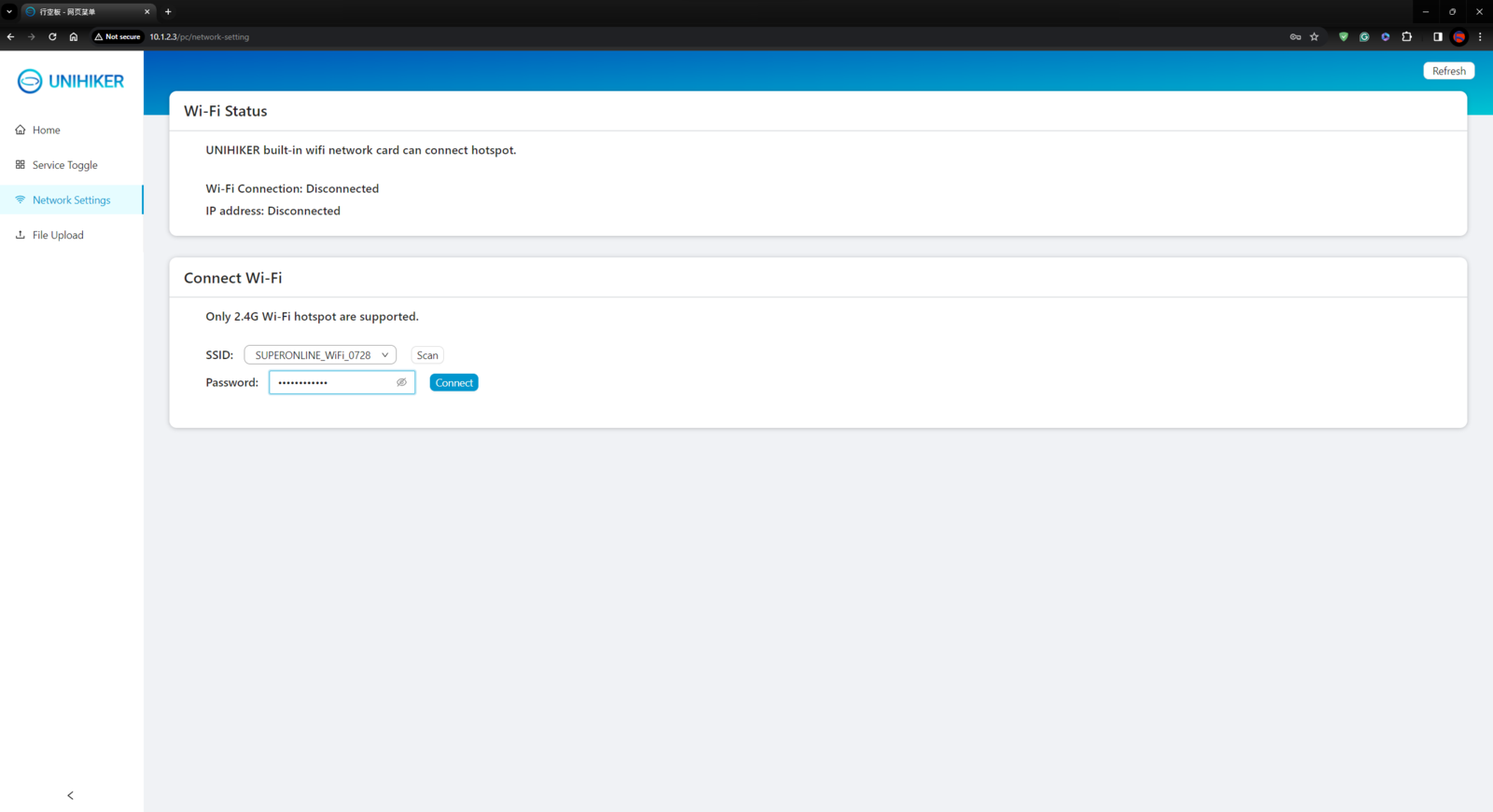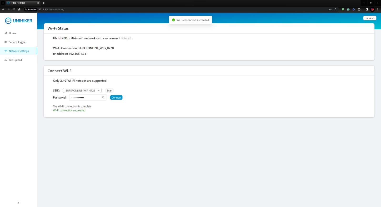 Although UNIHIKER is an outstandingly compact single-board computer providing a built-in touchscreen, integrated Python modules, and a microcontroller coprocessor, I still needed to install the required Python modules and set up the necessary software before proceeding with the following steps. :hash: First of all, if you are a novice in programming with UNIHIKER, please visit the official tutorials and guidelines. :hash: After connecting UNIHIKER to the computer via a USB Type-C cable, go to the home page of UNIHIKER’s local web server via the default browser: 10.1.2.3. :hash: Then, navigate to Network Settings and establish the Wi-Fi connection.