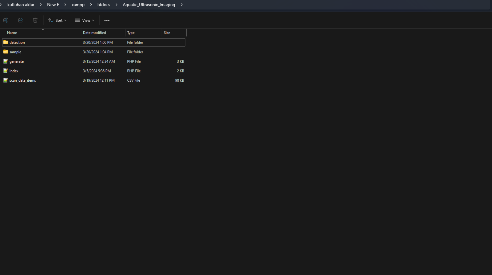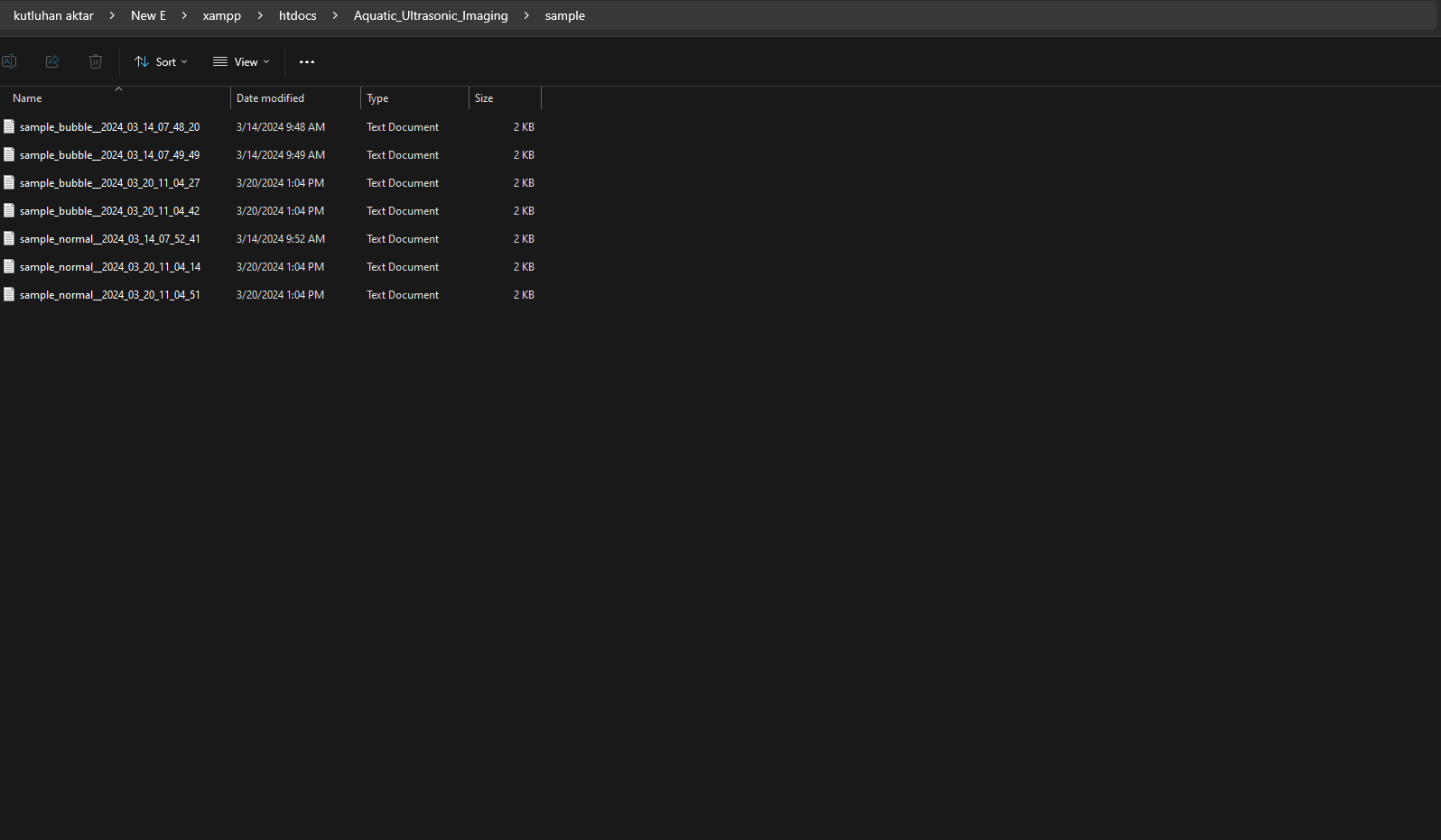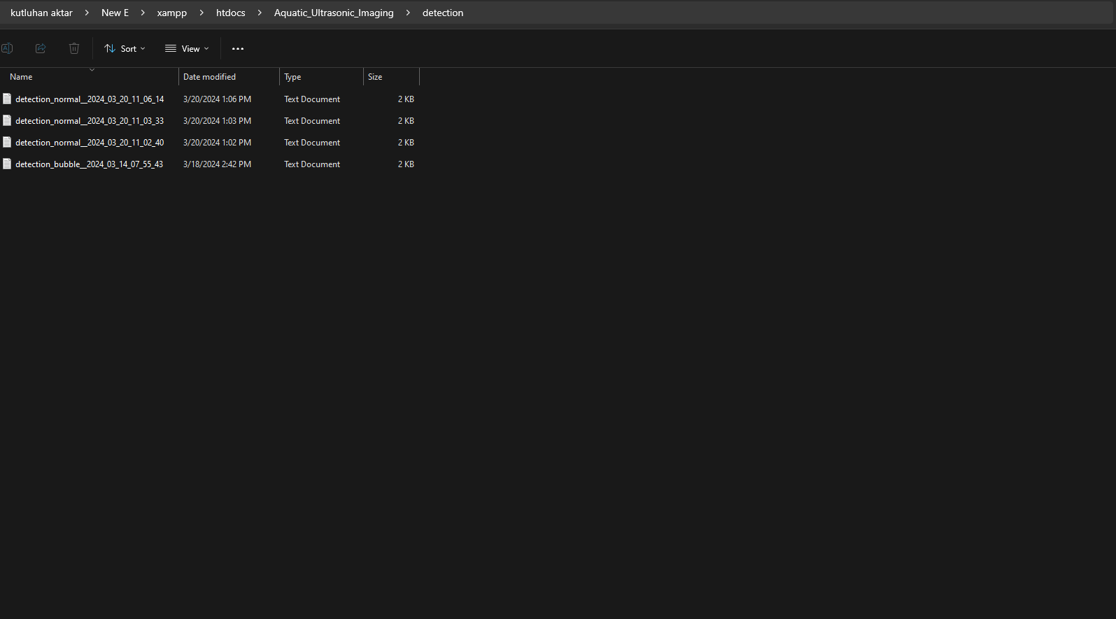 Since I needed to obtain the ultrasonic scan data buffers and the given air bubble class from Nano ESP32 so as to save the data records as text (TXT) files, I decided to develop a basic web application. Also, the web application can generate a pre-formatted CSV file from the stored data records (text files) when requested via an HTTP GET request to construct a data set effortlessly. In addition to the data collection features, similar to the ultrasonic scan samples, the web application can save model detection results transferred by Nano ESP32 via an HTTP POST request — buffer passed to the neural network model and the detected air bubble label — as text files in a separate folder. As shown below, the web application consists of two folders and two code files:- /detection
