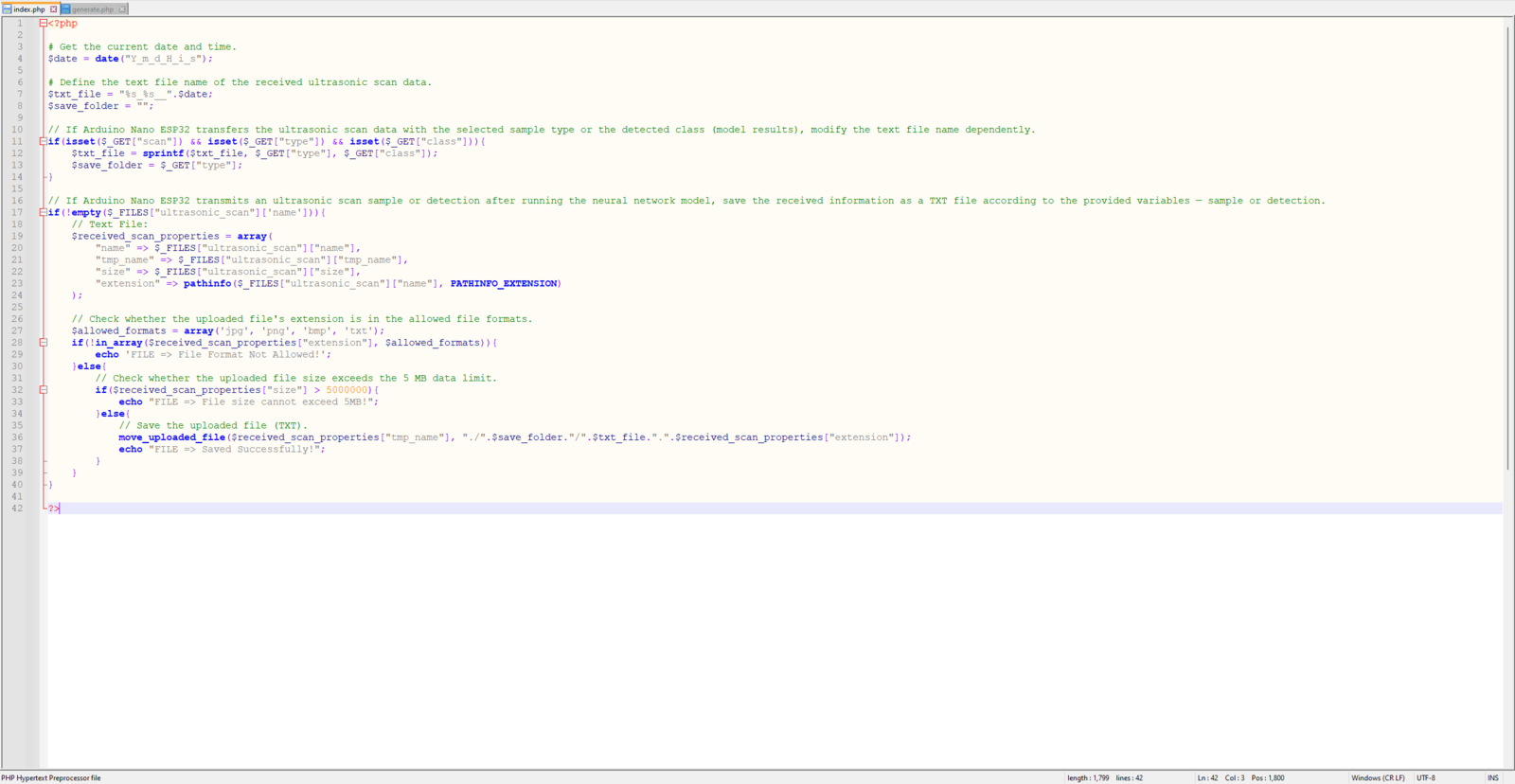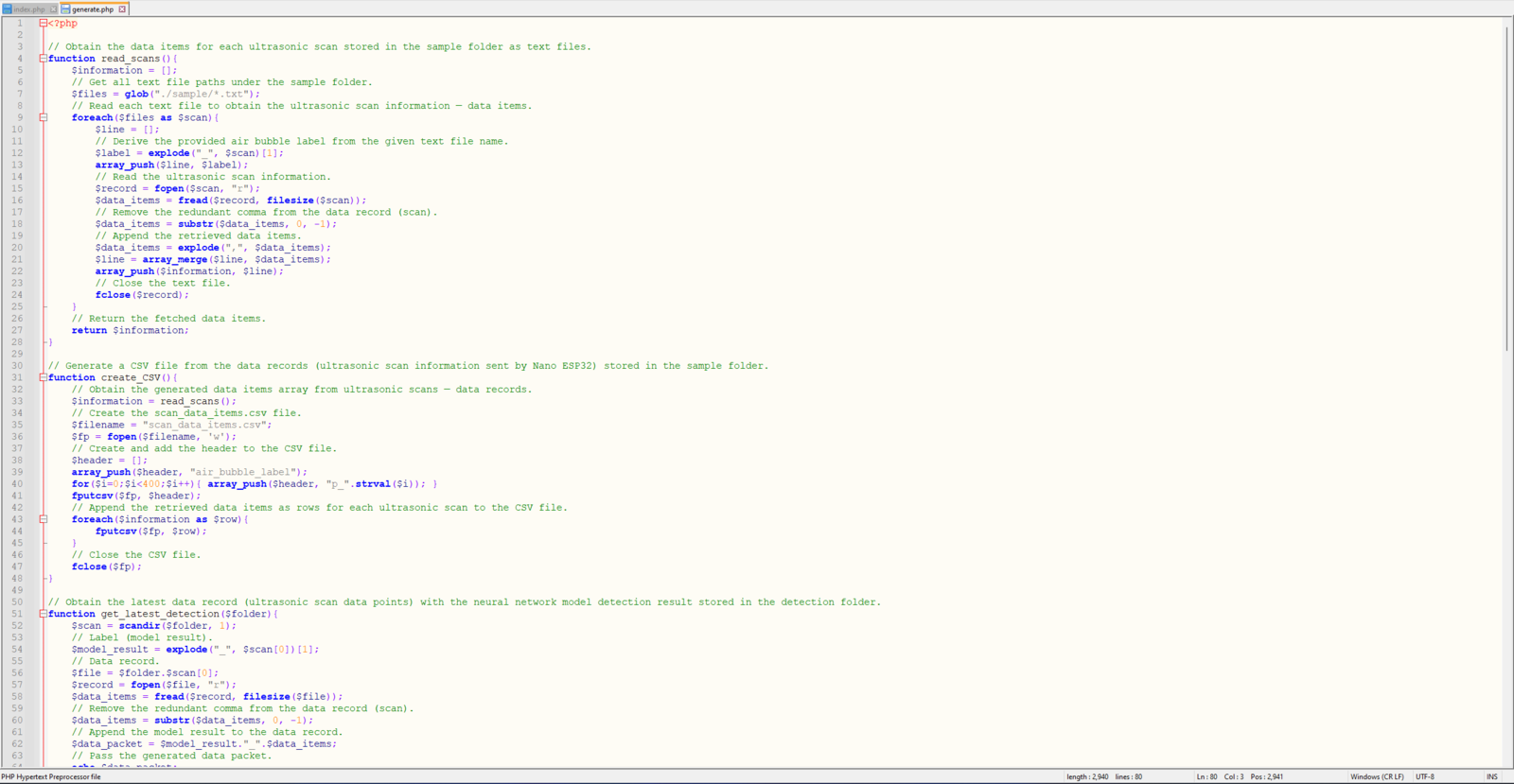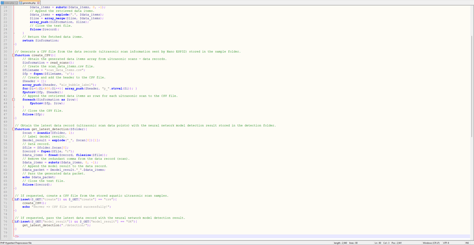 Since I needed to obtain the ultrasonic scan data buffers and the given air bubble class from Nano ESP32 so as to save the data records as text (TXT) files, I decided to develop a basic web application. Also, the web application can generate a pre-formatted CSV file from the stored data records (text files) when requested via an HTTP GET request to construct a data set effortlessly. In addition to the data collection features, similar to the ultrasonic scan samples, the web application can save model detection results transferred by Nano ESP32 via an HTTP POST request — buffer passed to the neural network model and the detected air bubble label — as text files in a separate folder. As shown below, the web application consists of two folders and two code files:- /detection