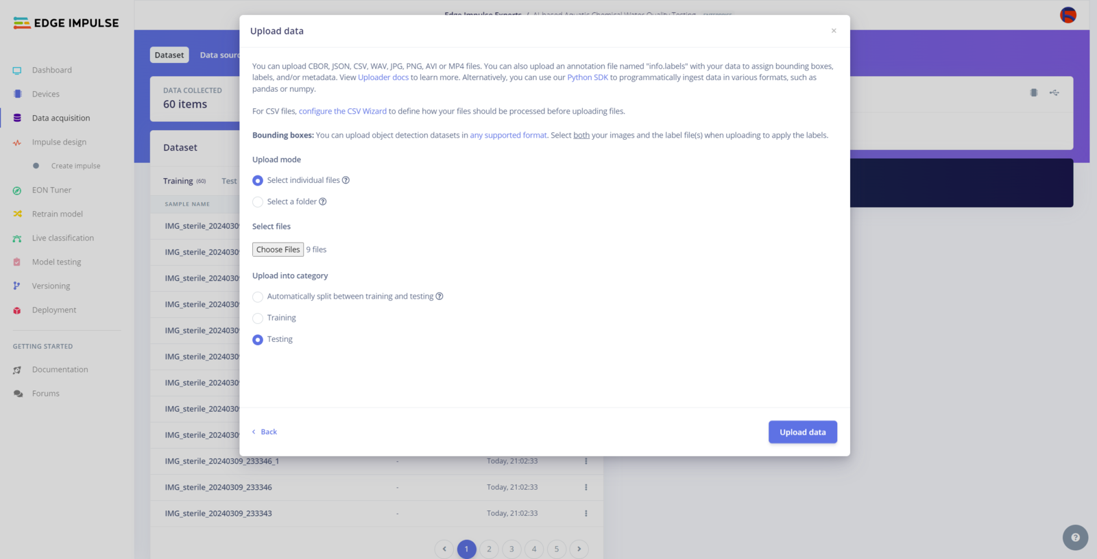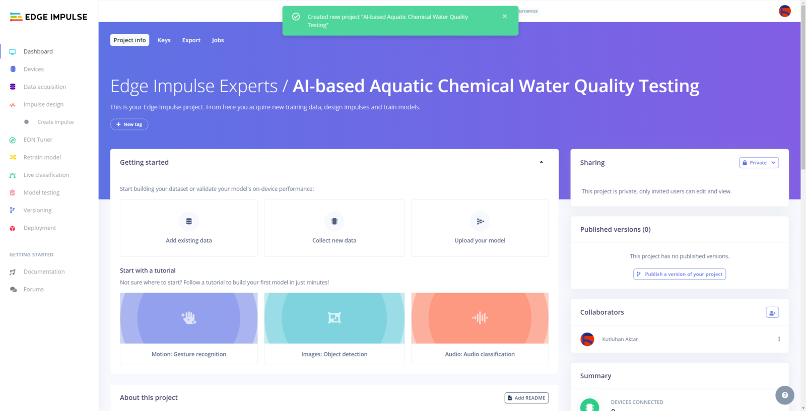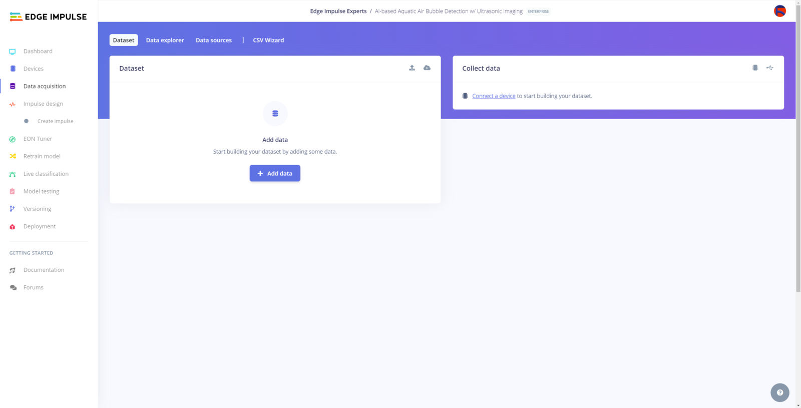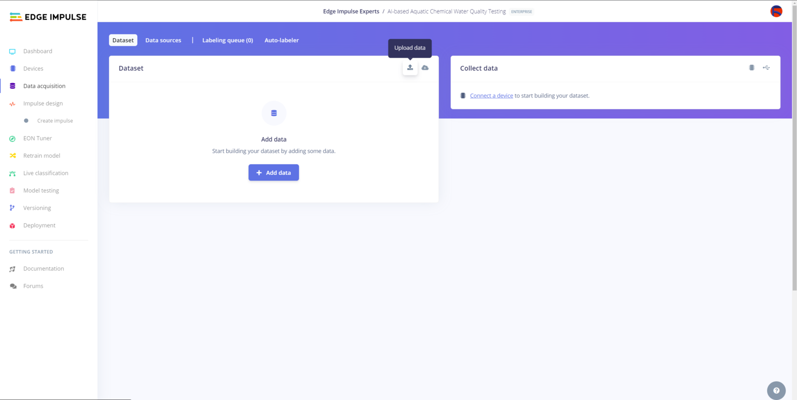 After generating training and testing samples successfully, I uploaded them to my project on Edge Impulse Enterprise. :hash: First of all, to utilize the incorporated tools for advanced AI applications, sign up for Edge Impulse Enterprise. :hash: Then, create a new project under your organization.