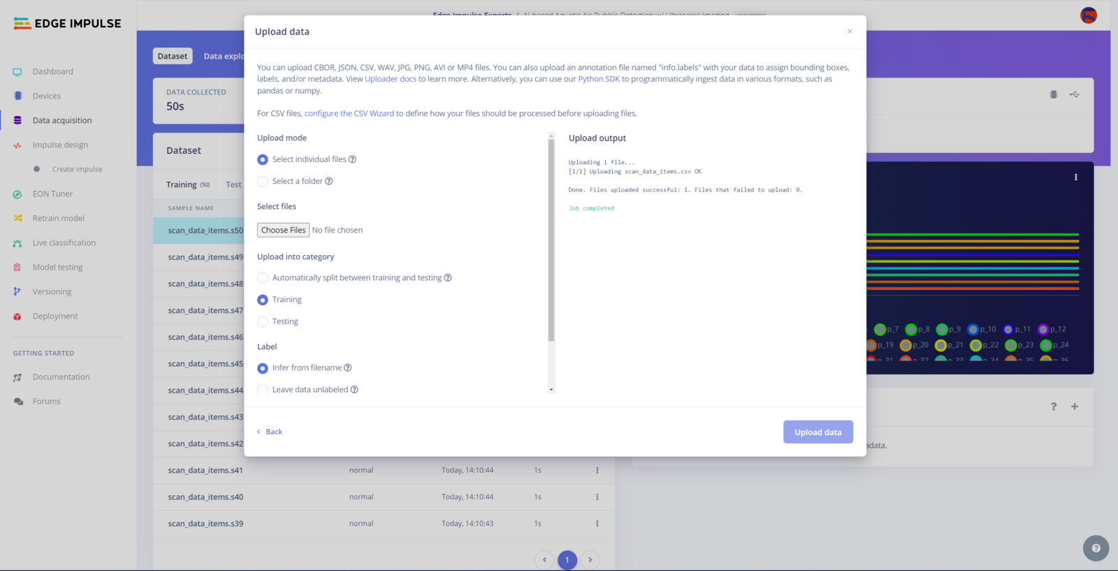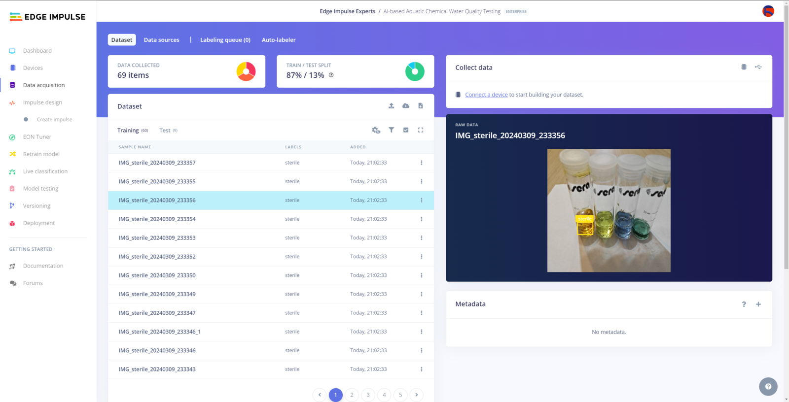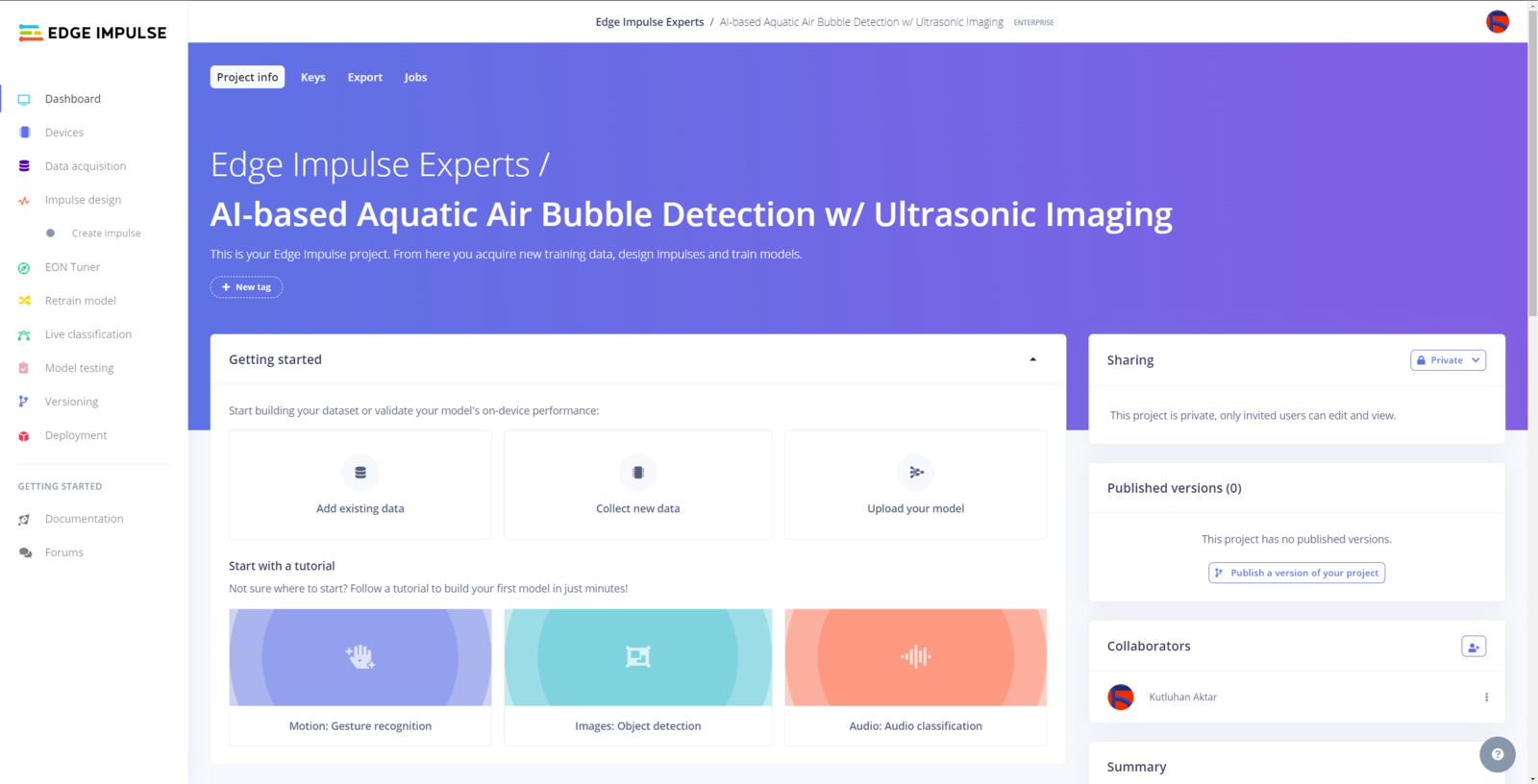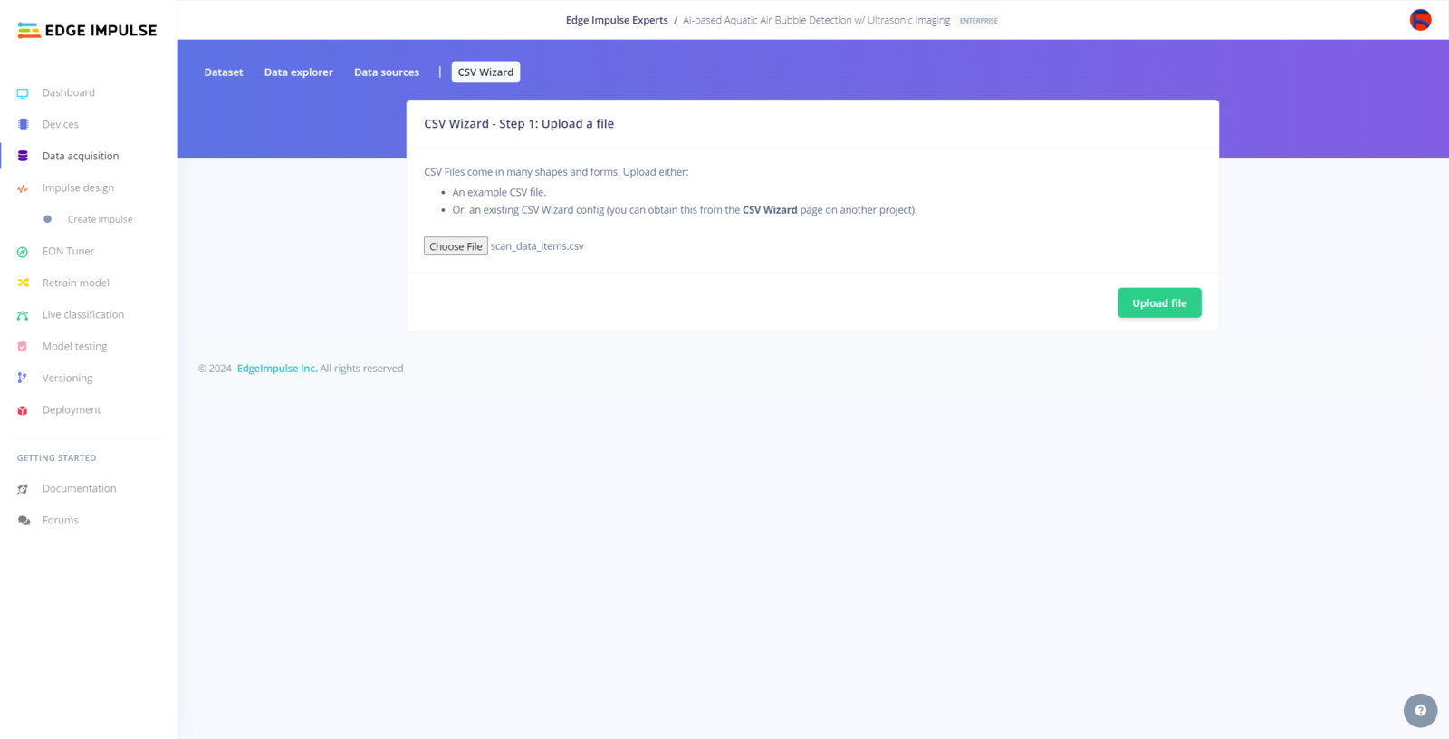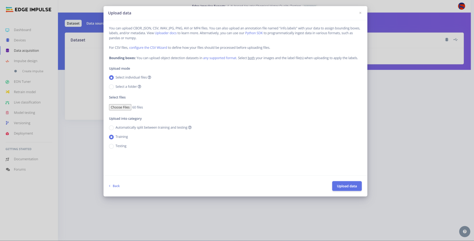After generating training and testing samples successfully, I uploaded them to my project on Edge Impulse Enterprise. :hash: First of all, to utilize the incorporated tools for advanced AI applications, sign up for Edge Impulse Enterprise. :hash: Then, create a new project under your organization.