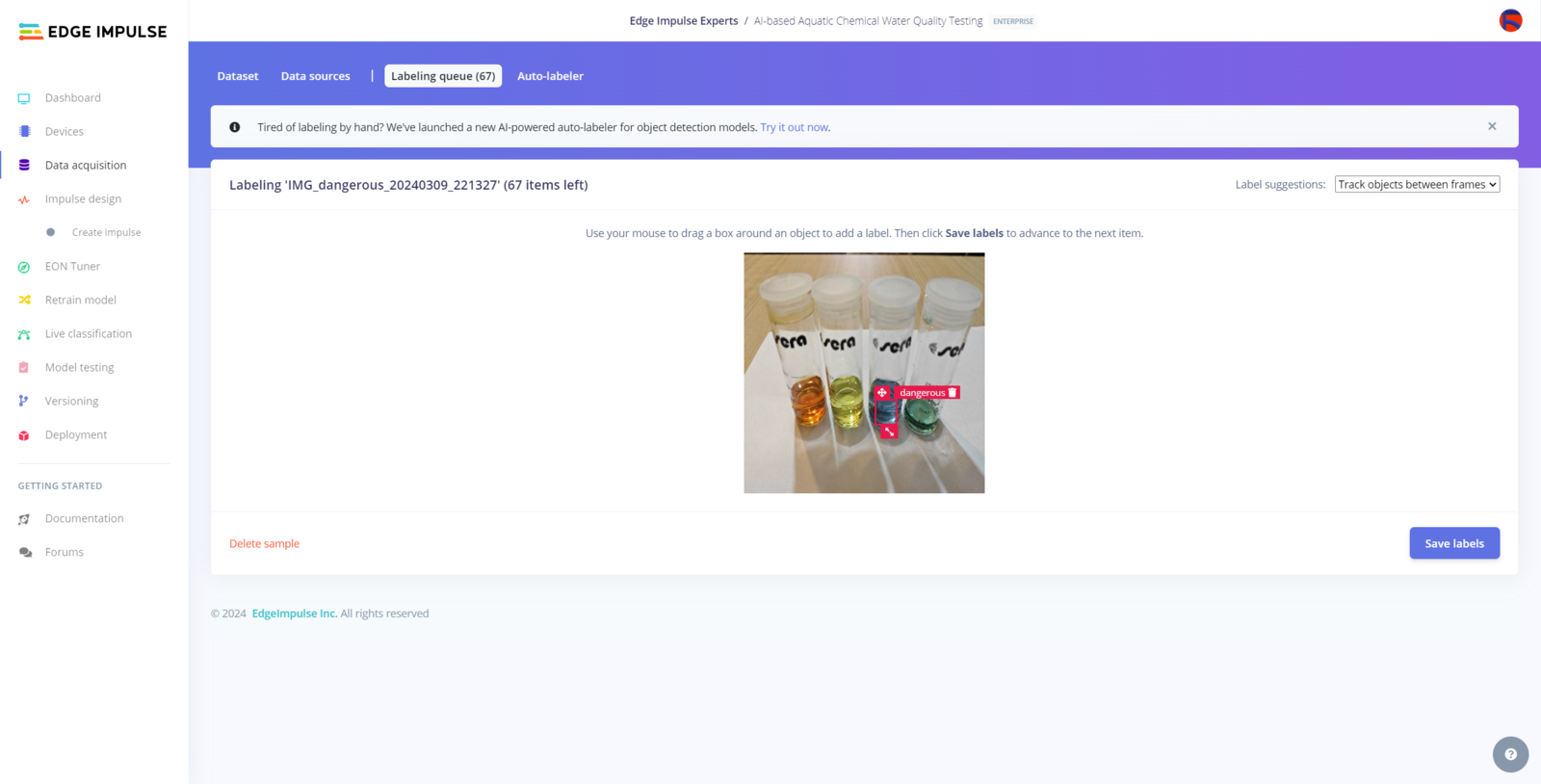 After collecting training and testing image samples, I uploaded them to my project on Edge Impulse. Then, I labeled each target object on the image samples. :hash: First of all, to utilize the incorporated tools for advanced AI applications, sign up for Edge Impulse Enterprise. :hash: Then, create a new project under your organization.