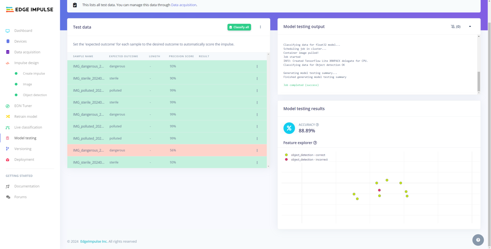 After building and training my RetinaNet object detection model, I tested its accuracy and validity by utilizing testing image samples. The evaluated accuracy of the model is 88.89%. :hash: To validate the trained model, go to the Model testing page and click Classify all.