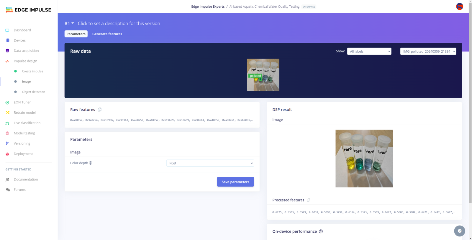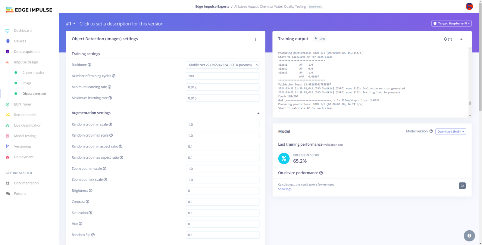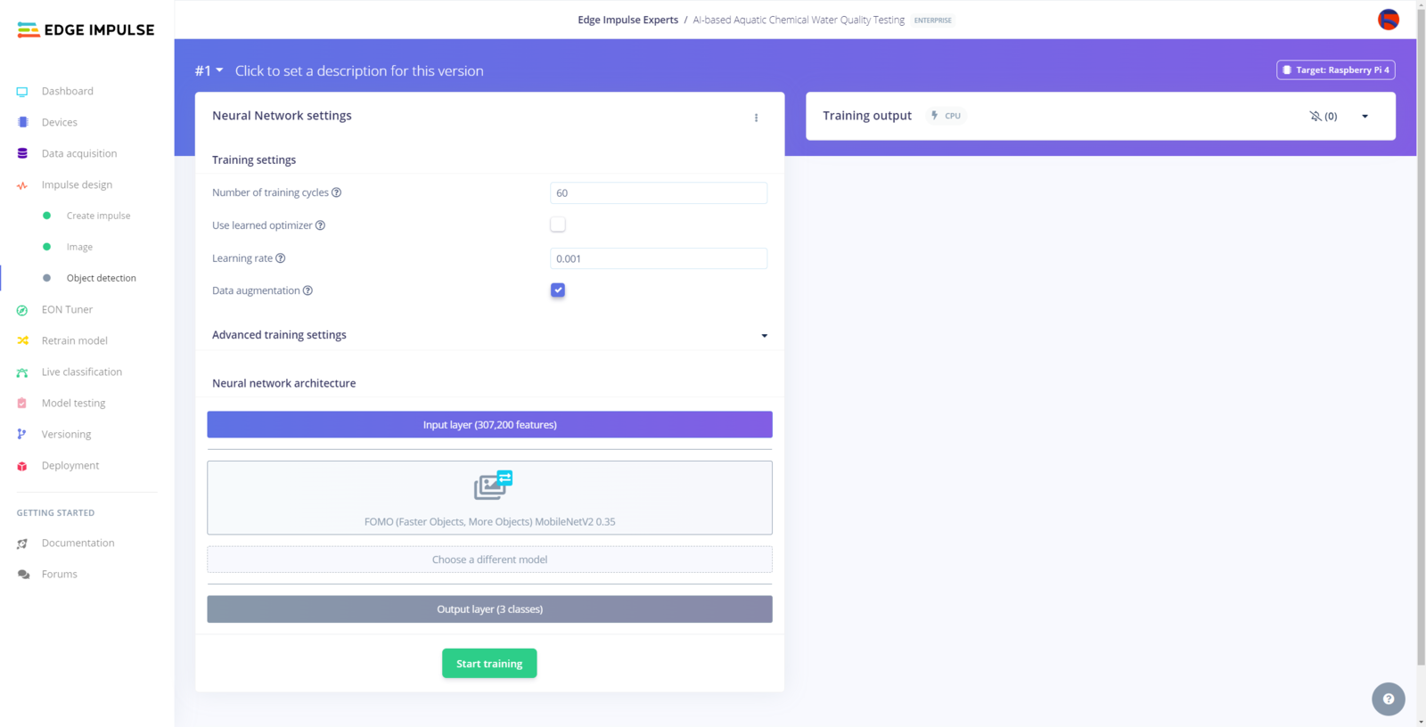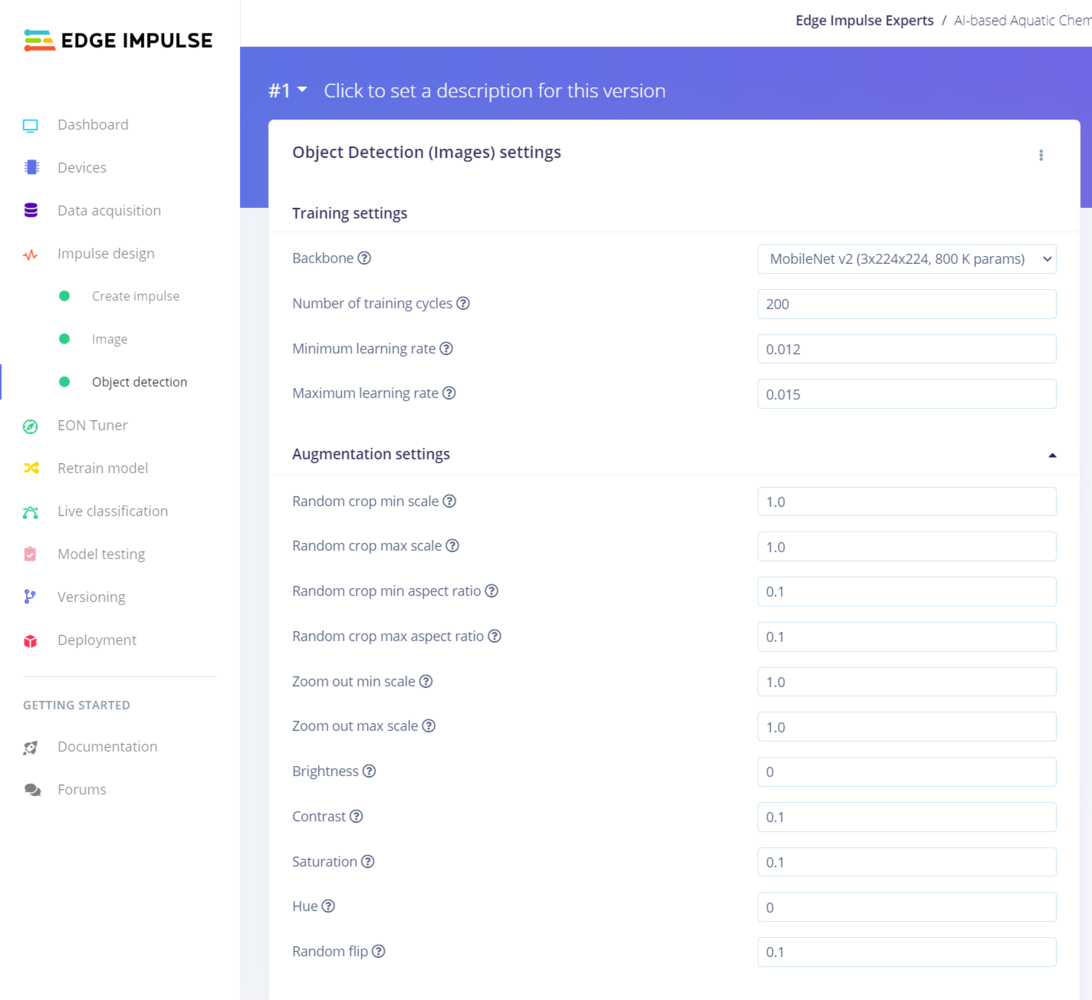 After labeling target objects on my training and testing samples successfully, I designed an impulse and trained the model on detecting water pollution levels based on the applied chemical water quality tests. An impulse is a custom neural network model in Edge Impulse. I created my impulse by employing the Image preprocessing block and the Object Detection (Images) learning block. The Image preprocessing block optionally turns the input image format to grayscale or RGB and generates a features array from the raw image. The Object Detection (Images) learning block represents a machine learning algorithm that detects objects on the given image, distinguished between model labels. In this case, I configured the input image format as RGB since the applied chemical water quality tests highly rely on color codes to distinguish quality levels. Due to the NVIDIA TAO vision model requirements, the image width and height must be multiples of 32 while configuring the impulse. :hash: Go to the Create impulse page and set image width and height parameters to 320. Then, select the resize mode parameter as Fit shortest axis so as to scale (resize) given training and testing image samples. :hash: Select the Image preprocessing block and the Object Detection (Images) learning block. Finally, click Save Impulse.
