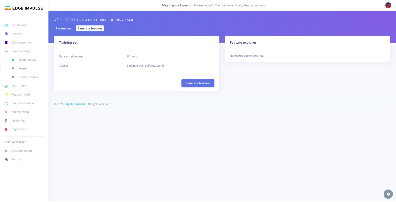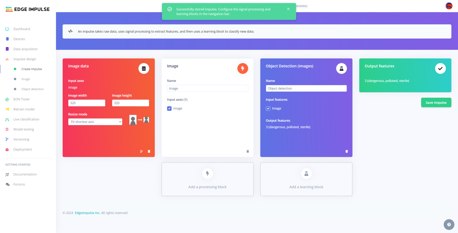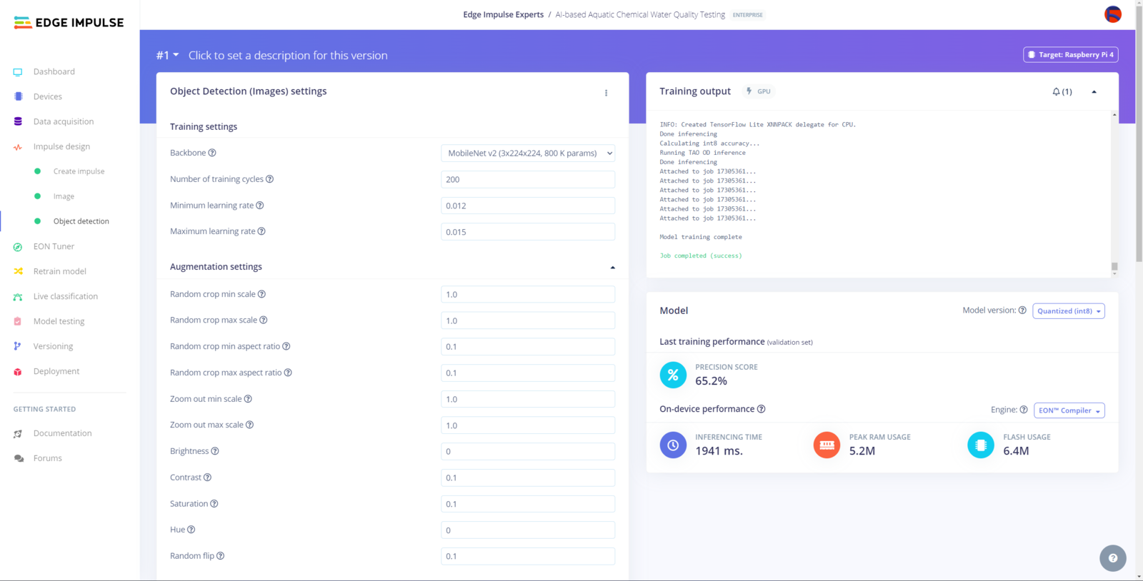 After labeling target objects on my training and testing samples successfully, I designed an impulse and trained the model on detecting water pollution levels based on the applied chemical water quality tests. An impulse is a custom neural network model in Edge Impulse. I created my impulse by employing the Image preprocessing block and the Object Detection (Images) learning block. The Image preprocessing block optionally turns the input image format to grayscale or RGB and generates a features array from the raw image. The Object Detection (Images) learning block represents a machine learning algorithm that detects objects on the given image, distinguished between model labels. In this case, I configured the input image format as RGB since the applied chemical water quality tests highly rely on color codes to distinguish quality levels. Due to the NVIDIA TAO vision model requirements, the image width and height must be multiples of 32 while configuring the impulse. :hash: Go to the Create impulse page and set image width and height parameters to 320. Then, select the resize mode parameter as Fit shortest axis so as to scale (resize) given training and testing image samples. :hash: Select the Image preprocessing block and the Object Detection (Images) learning block. Finally, click Save Impulse.