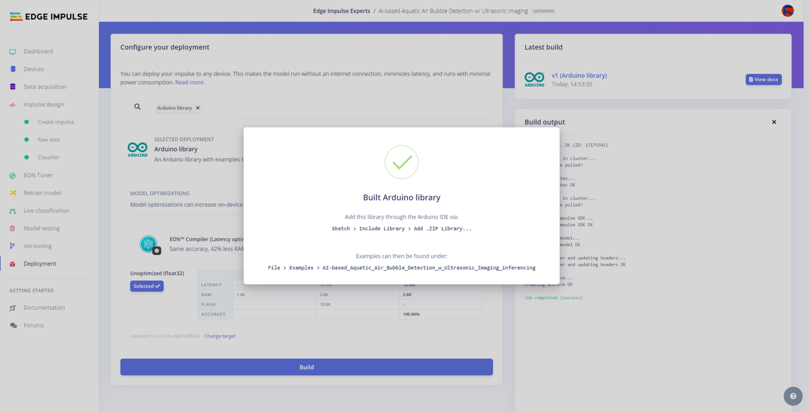 After building, training, and deploying my neural network model with the Ridge classifier as an Arduino library on Edge Impulse, I needed to upload the generated Arduino library on Nano ESP32 to run the optimized model directly so as to identify toxic underwater air bubbles with minimal latency, memory usage, and power consumption. Since Edge Impulse optimizes and formats signal processing, configuration, and learning blocks into a single package while deploying models as Arduino libraries, even for complex machine learning algorithms, I was able to import my advanced model effortlessly to run inferences. :hash: After downloading the model as an Arduino library in the ZIP file format, go to Sketch ➡ Include Library ➡ Add .ZIP Library… :hash: Then, include the Aquatic_Air_Bubble_Detection_inferencing.h file to import the Edge Impulse neural network model with the Ridge classifier.