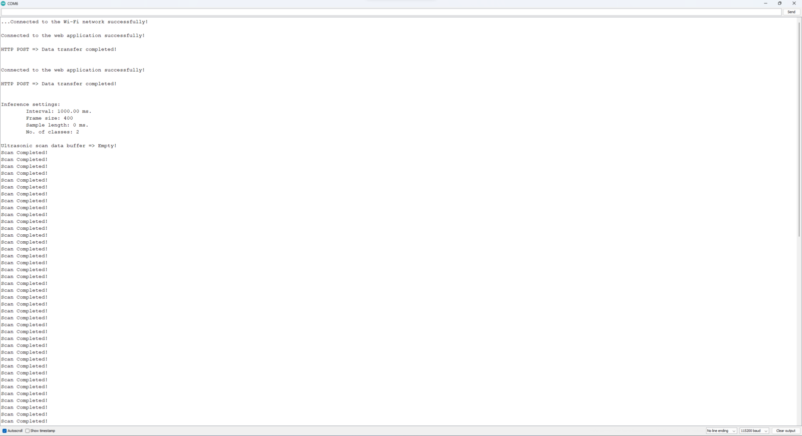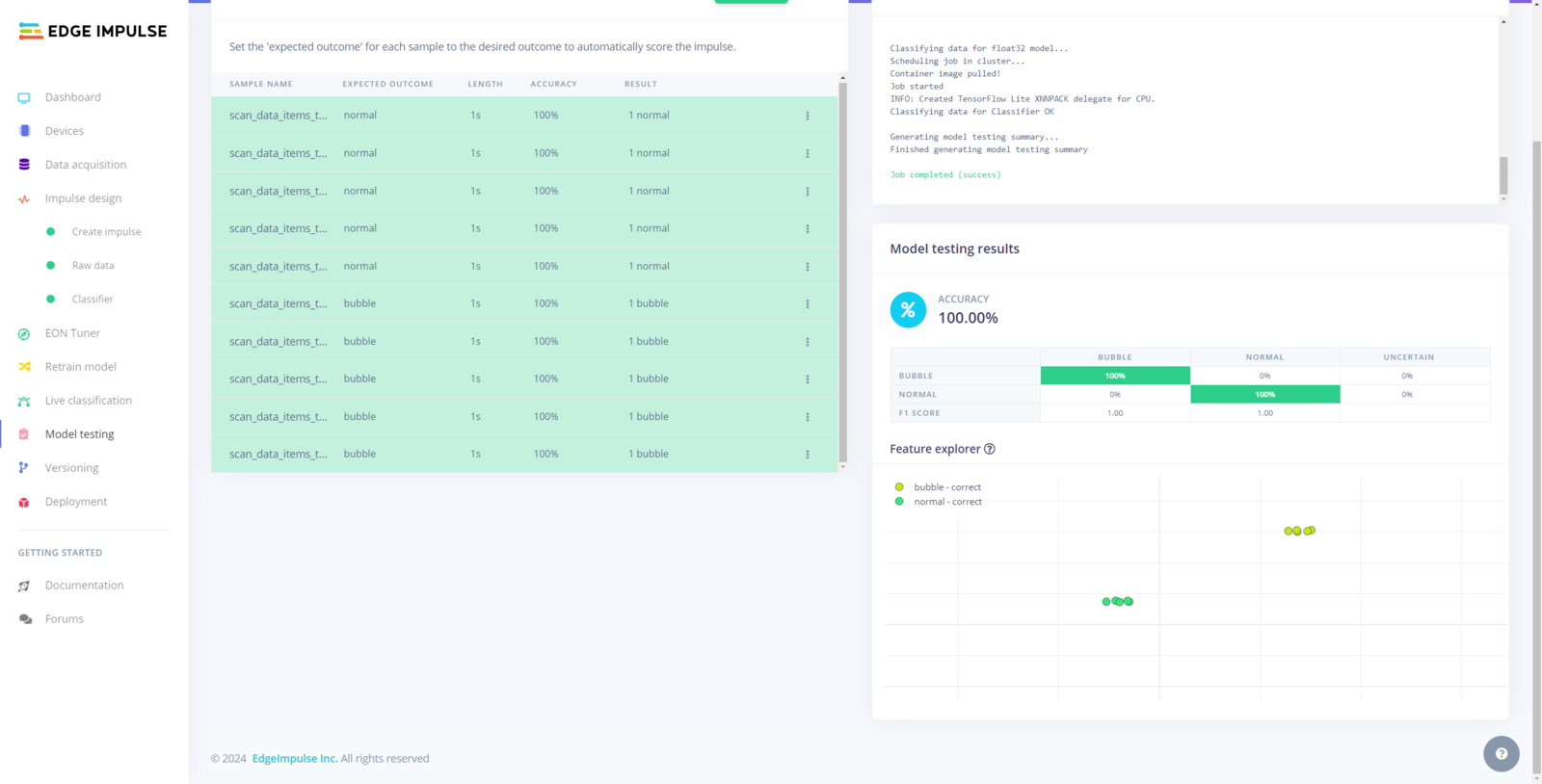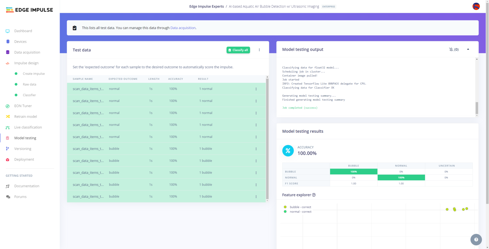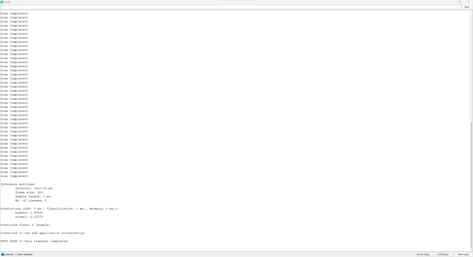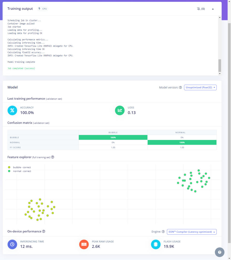 My Edge Impulse neural network model with the Ridge classifier predicts possibilities of labels (air bubble classes) for the passed ultrasonic scan data buffer as an array of 2 numbers. They represent the model’s “confidence” that the given features buffer corresponds to each of the two different air bubble classes [0 - 1], as shown in Step 10:- 0 — bubble