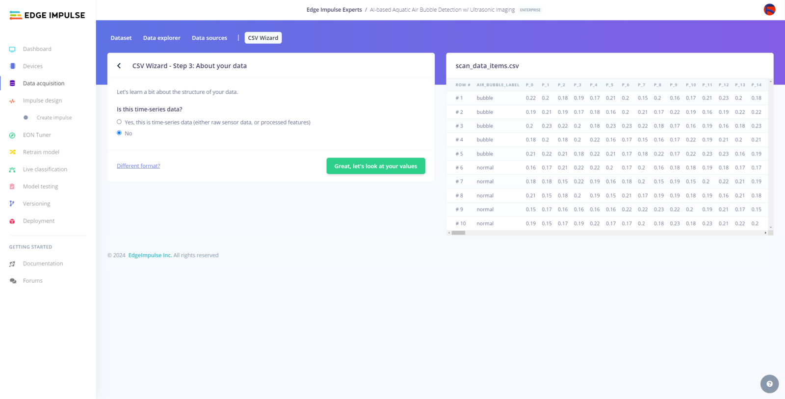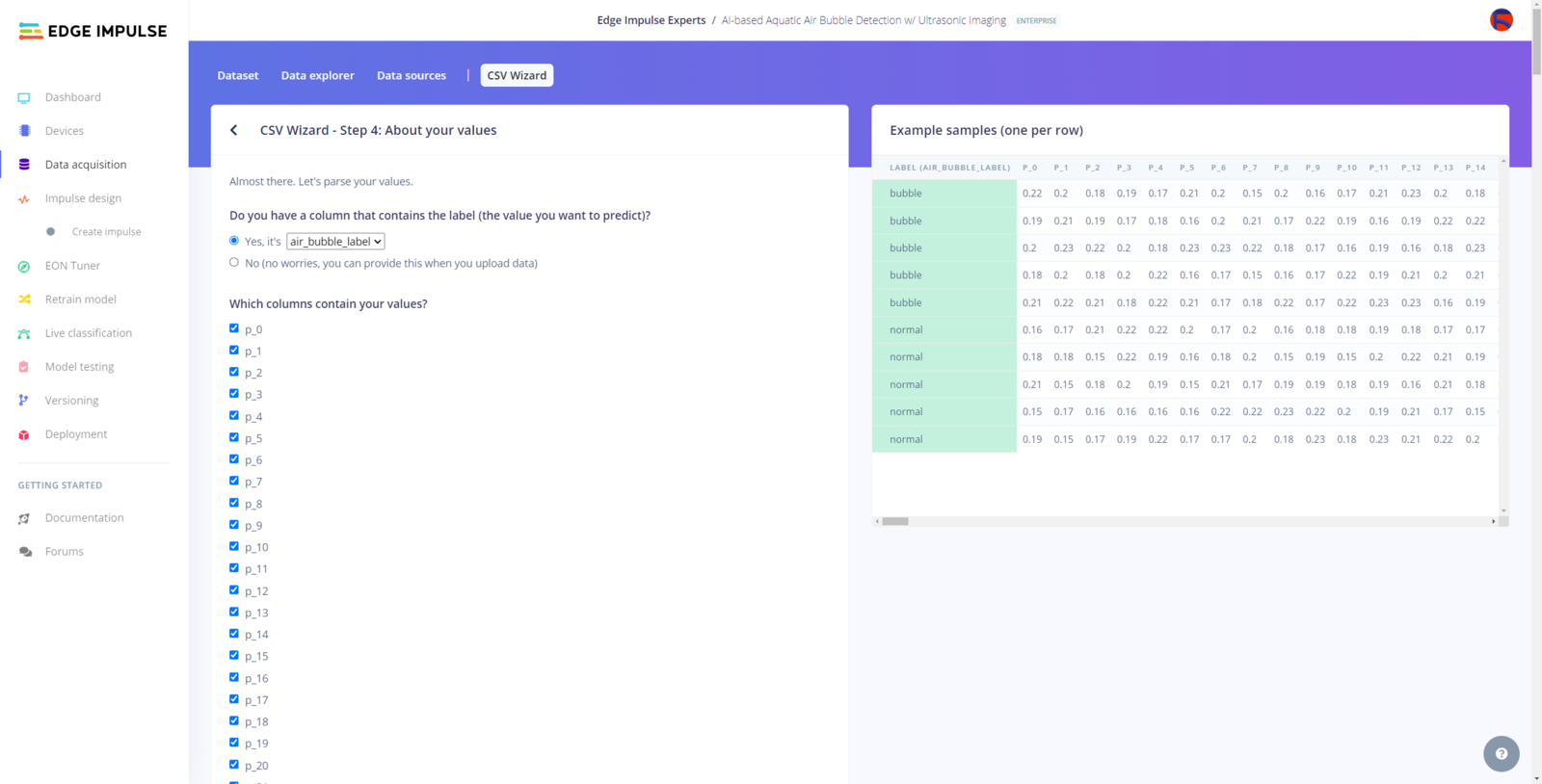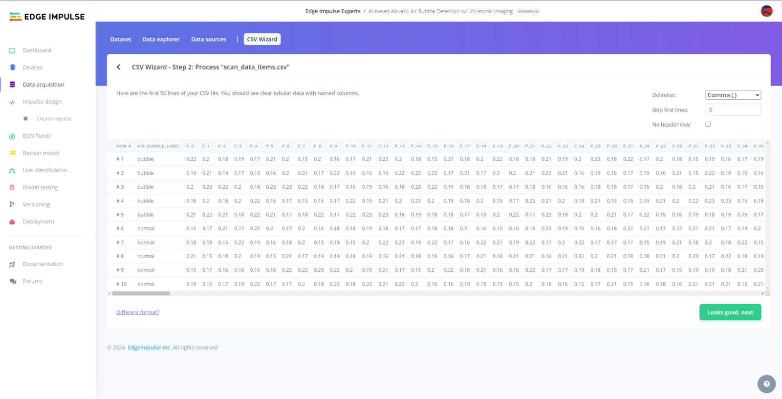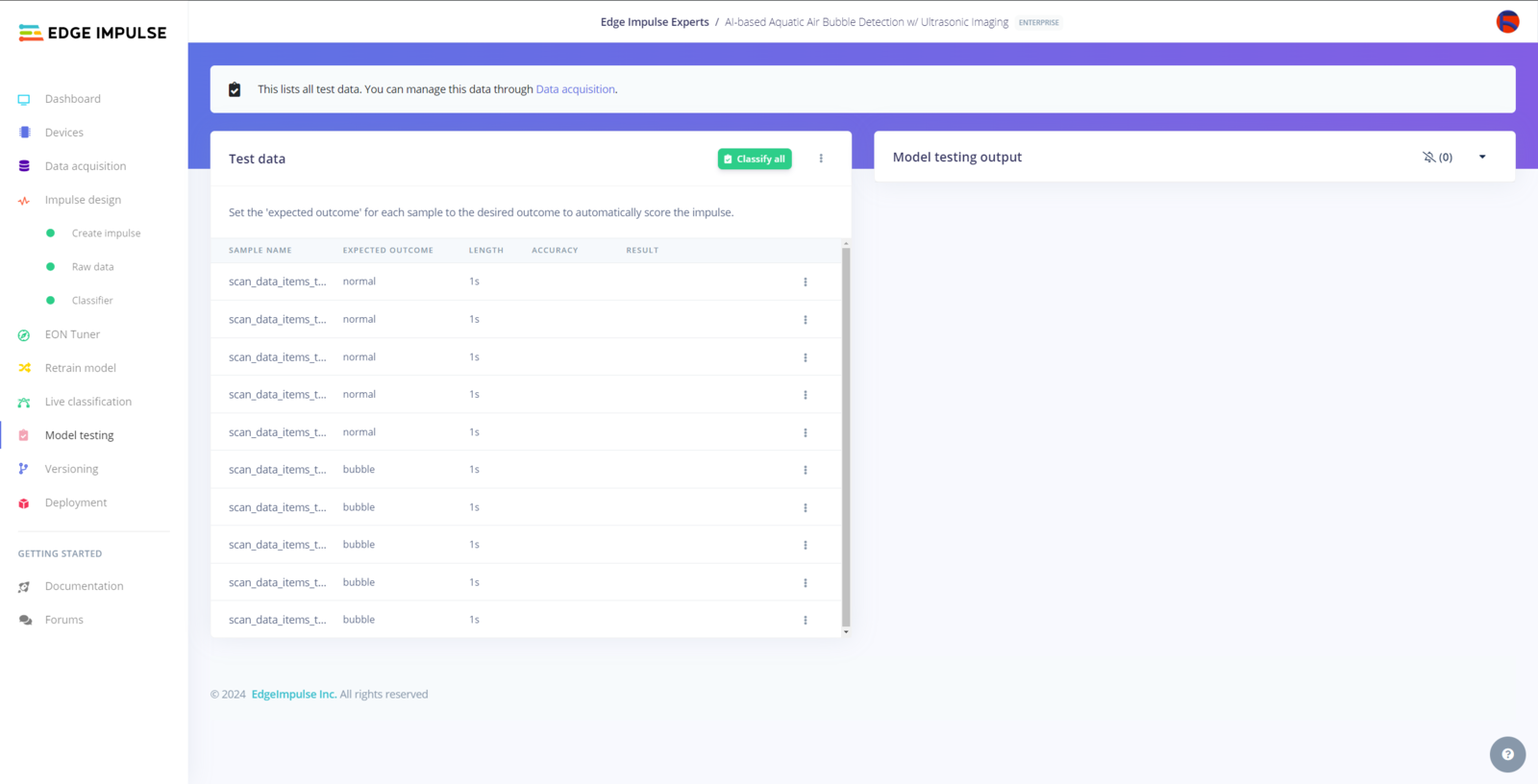 My Edge Impulse neural network model with the Ridge classifier predicts possibilities of labels (air bubble classes) for the passed ultrasonic scan data buffer as an array of 2 numbers. They represent the model’s “confidence” that the given features buffer corresponds to each of the two different air bubble classes [0 - 1], as shown in Step 10:- 0 — bubble
