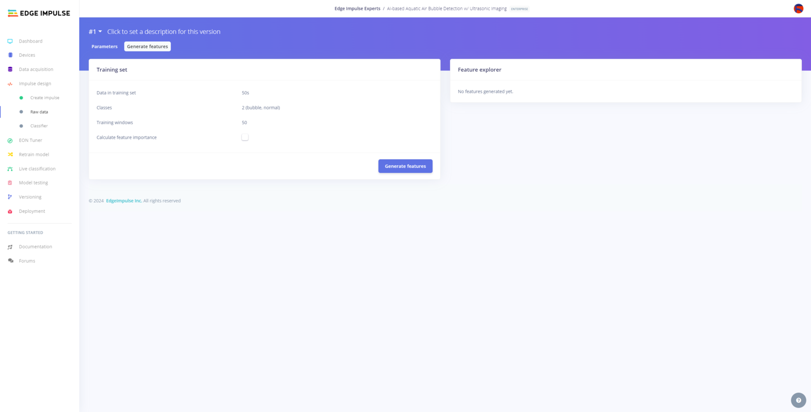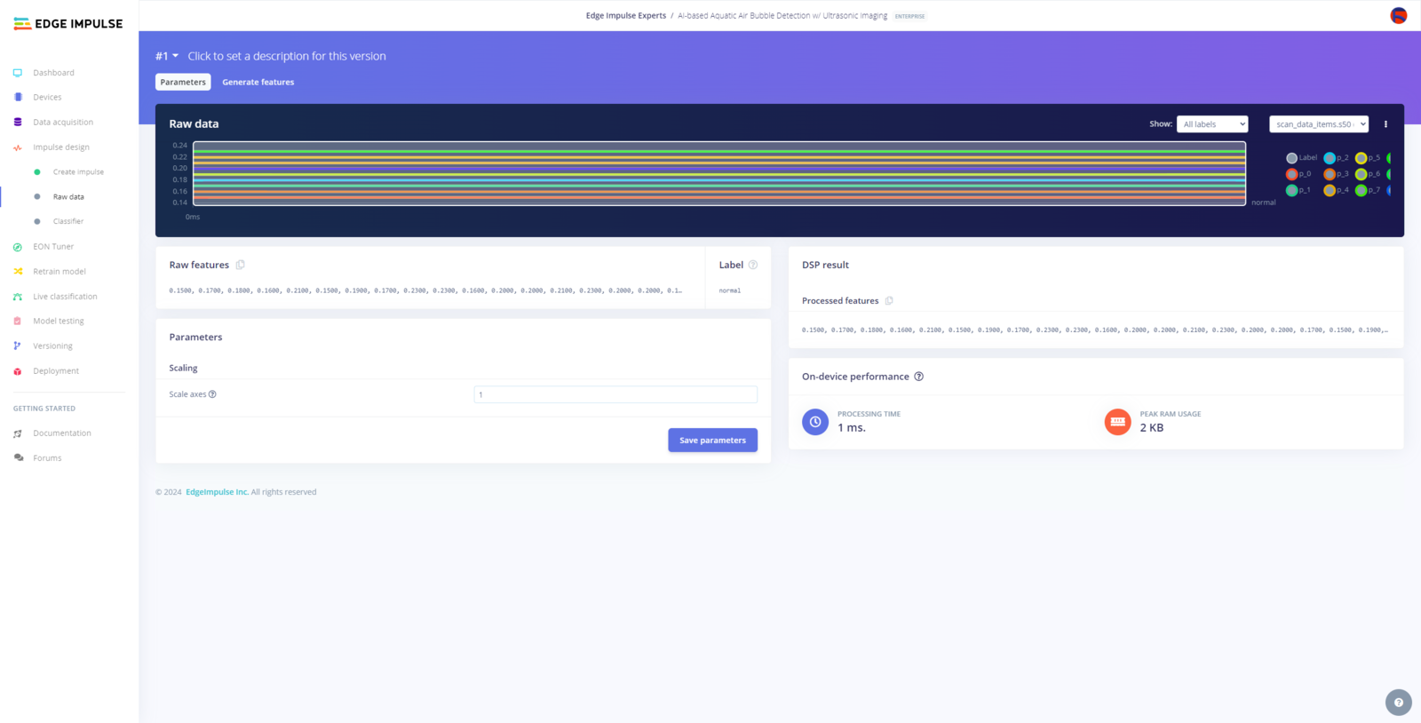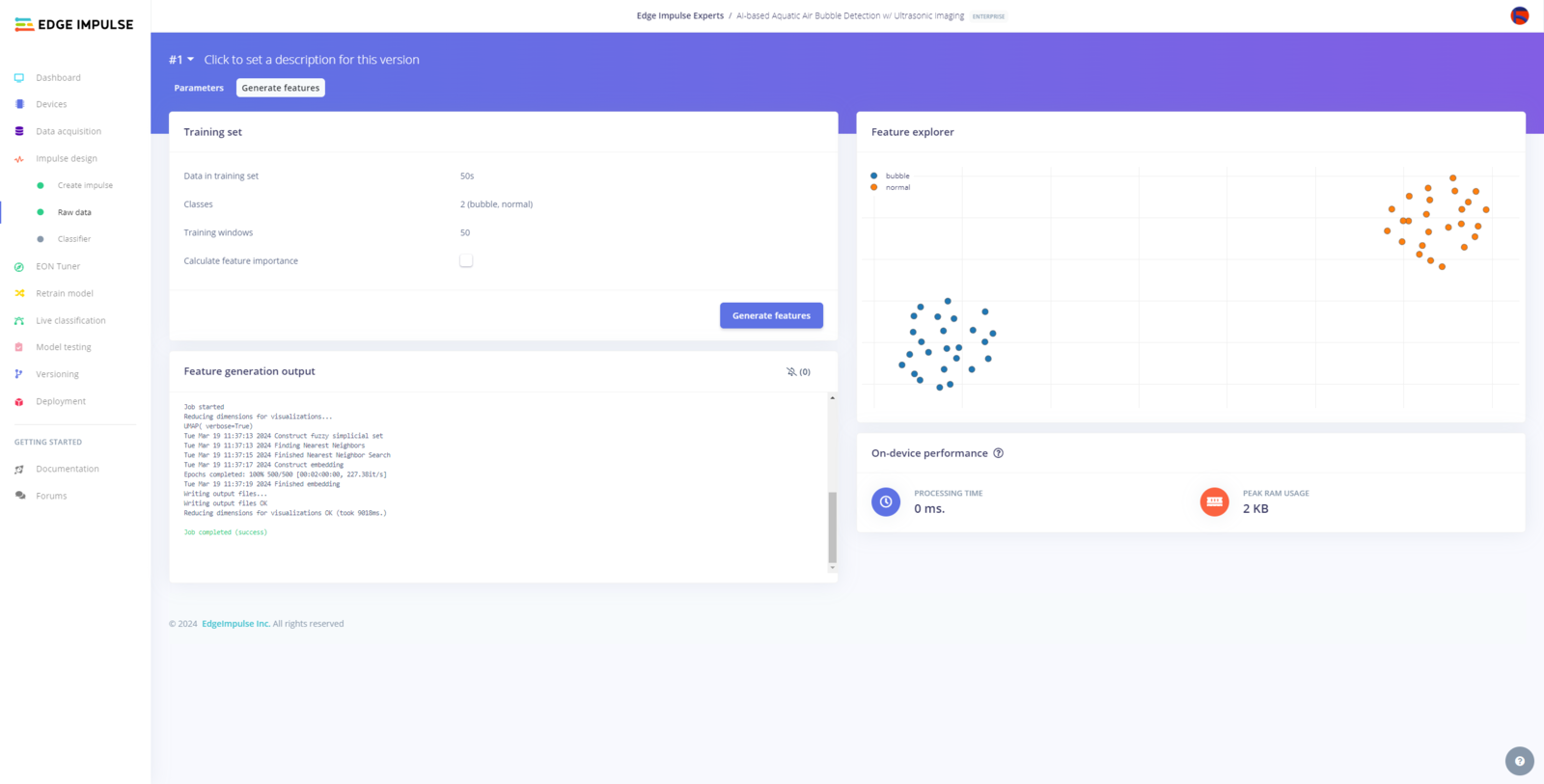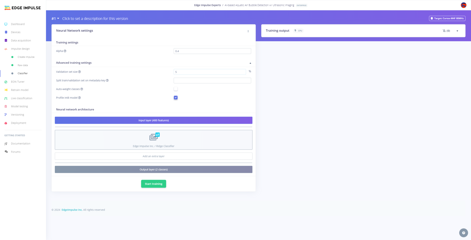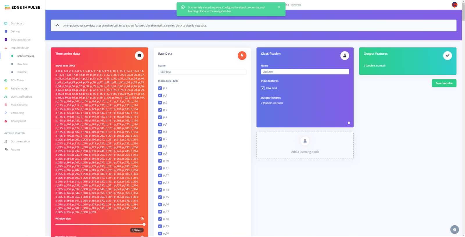 After uploading and labeling my training and testing samples successfully, I designed an impulse and trained the model to identify noxious underwater air bubbles. An impulse is a custom neural network model in Edge Impulse. I created my impulse by employing the Raw Data processing block and the Classification learning block. The Raw Data processing block generates windows from data samples without applying any specific signal processing procedures. The Classification learning block represents a Keras neural network model. This learning block lets the user change the model classifier, settings, architecture, and layers. :hash: After navigating to the Create impulse page, select the Raw Data processing block and the Classification learning block. Then, click Save Impulse.
